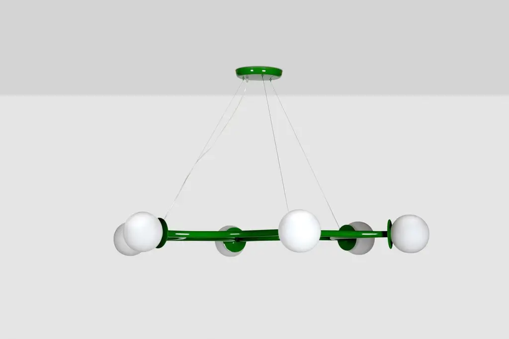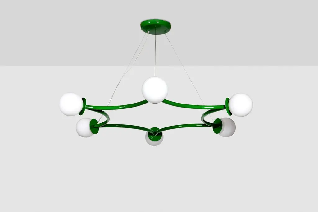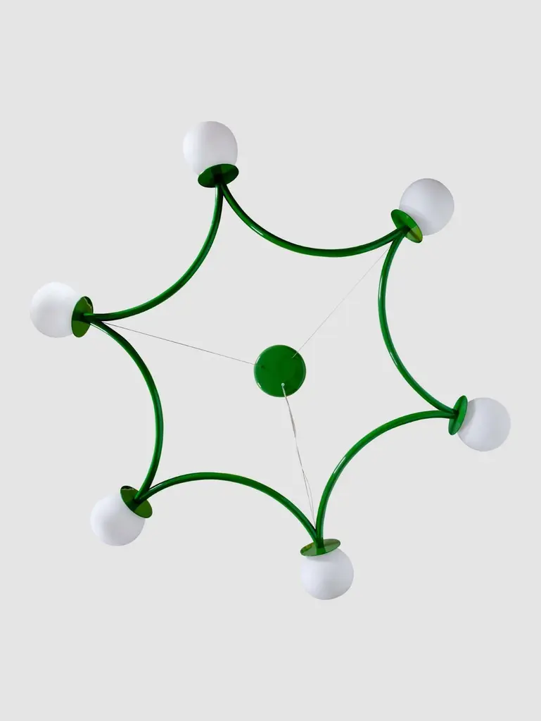 Poppins ceiling lamp by Royal StrangerDimensions: W 180 x D 160 x H 20 cmMaterials: Fern green lacquered with glossy finish. Blown glass opal diffuser.Poppins Ceiling Lamp is a striking constellation describing six concentric light spheres.The opal glass diffusers fluttering in space will draw the eye upward. Looking from below, this aerial star-shaped structure gracefully connects all the dots.Poppins Ceiling Lamp is bound to make an impression for its vast measurements. This starry ensemble is suspended from the ceiling in such a way as to shed light upon unique ambiences.Available in brass, stainless steel and copper with polished or brushed finish, or lacquered in all NCS/RAL colors with matte or glossy finish.All our lamps can be wired according to each country. If sold to the USA it will be wired for the USA for instance.Royal stranger is an exclusive furniture brand determined to bring you the best unique pieces of art and design.Fusing design, art and the best craftsmanship, they strive to deliver the best state of the handmade art furniture. The design team works every day to create meaningful products that represent values such as passion, function, aesthetics and know-how. Values that are meant to represent Royal stranger’s DNA. This dedication is present at all stages of production and the combination of craftsmanship and innovative design contributes to our final purpose: to produce certified high-quality products, made with passion and expertise and using royal materials such as gold leaf, rich woods and high quality lacquers.It was in 2013, as an architects, that Sofia Santos & Rui Santos started to push the boundaries of innovation in several retail design concepts for some of the best stores in Portugal. This will has always been present in their work, and that’s how the brand was born.