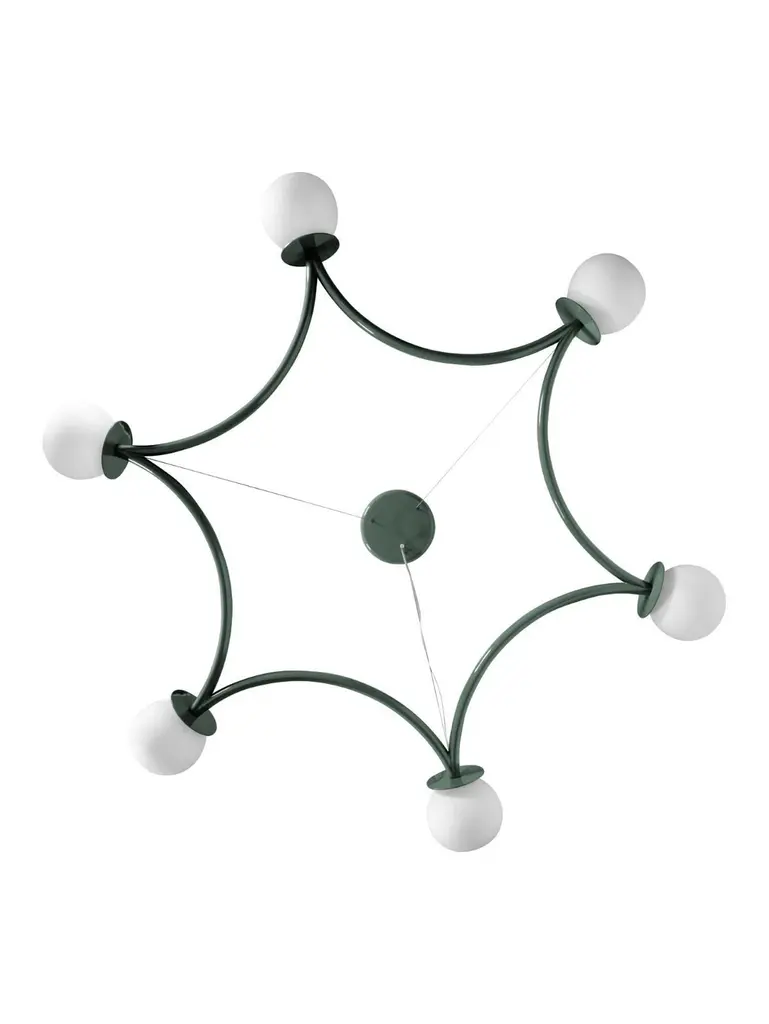 Poppins ceiling lamp by Royal Stranger.Dimensions: W 180 x D 160 x H 20 cm.Materials: Lacquered with glossy finish. Blown glass opal diffuser.Poppins Ceiling Lamp is a striking constellation describing six concentric light spheres.The opal glass diffusers fluttering in space will draw the eye upward. Looking from below, this aerial star-shaped structure gracefully connects all the dots.Poppins Ceiling Lamp is bound to make an impression for its vast measurements. This starry ensemble is suspended from the ceiling in such a way as to shed light upon unique ambiences.Available in brass, stainless steel and copper with polished or brushed finish, or lacquered in all NCS/RAL colors with matte or glossy finish.All our lamps can be wired according to each country. If sold to the USA it will be wired for the USA for instance.Royal stranger is an exclusive furniture brand determined to bring you the best unique pieces of art and design.Fusing design, art and the best craftsmanship, they strive to deliver the best state of the handmade art furniture. The design team works every day to create meaningful products that represent values such as passion, function, aesthetics and know-how. Values that are meant to represent Royal stranger’s DNA. This dedication is present at all stages of production and the combination of craftsmanship and innovative design contributes to our final purpose: to produce certified high-quality products, made with passion and expertise and using royal materials such as gold leaf, rich woods and high quality lacquers.It was in 2013, as an architects, that Sofia Santos & Rui Santos started to push the boundaries of innovation in several retail design concepts for some of the best stores in Portugal. This will has always been present in their work, and that’s how the brand was born.