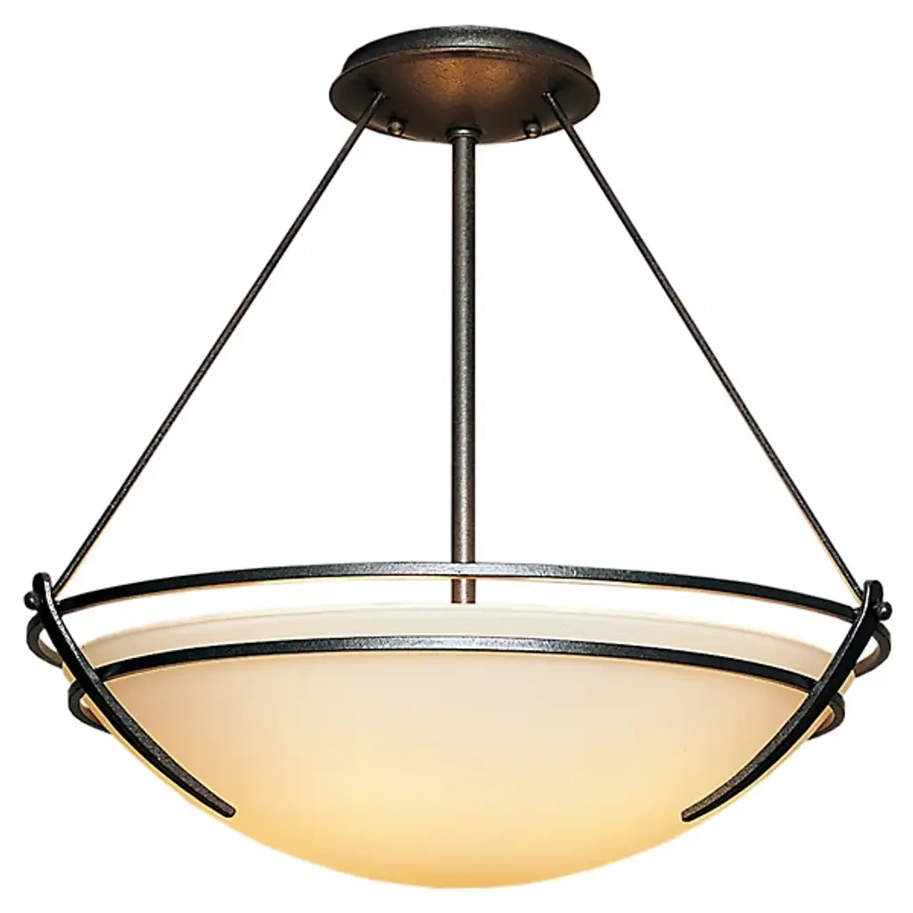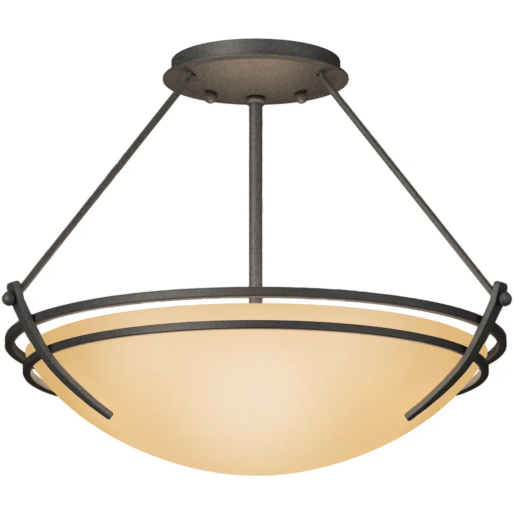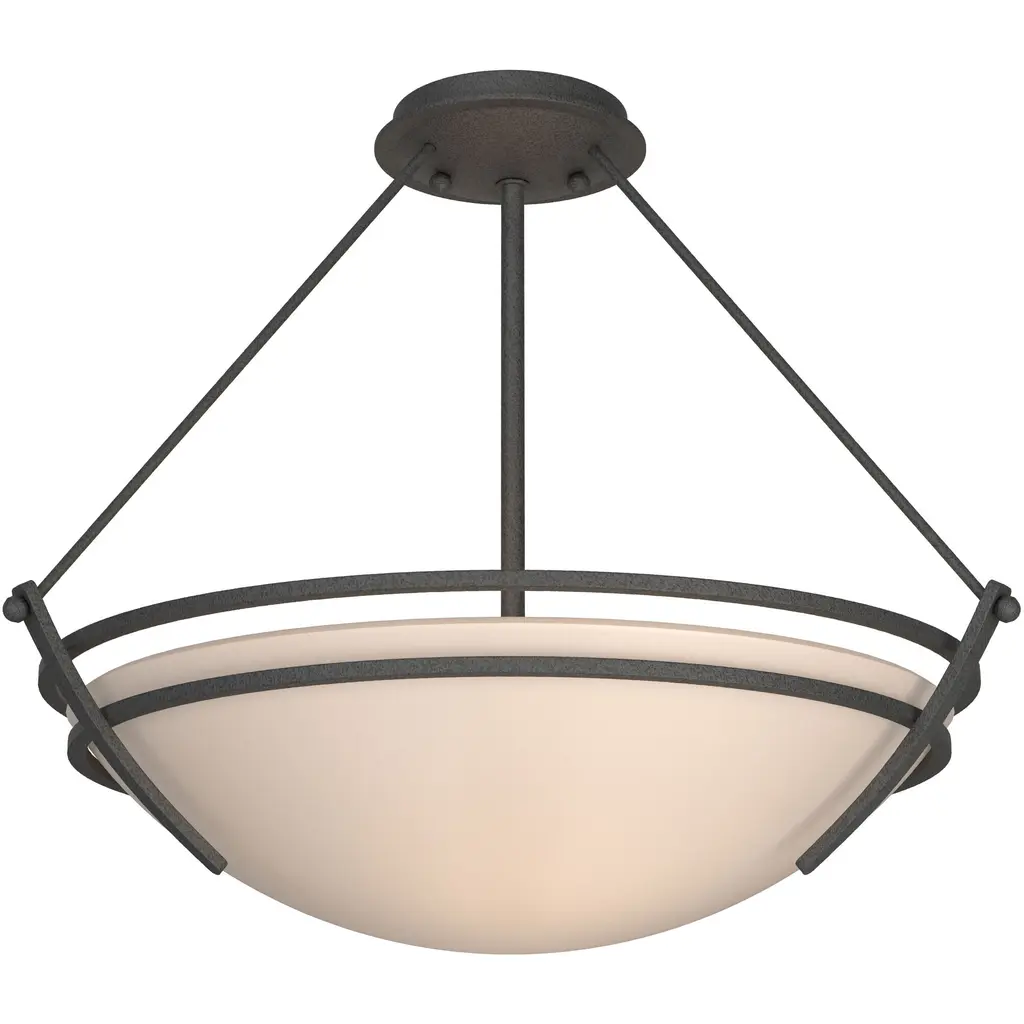 Concentric steel bands circle the glass bowl. Handcrafted steel tines hold the bowl. This modern fixture is crafted using a mix of tradition and technique by artisans at our forge here in Vermont.