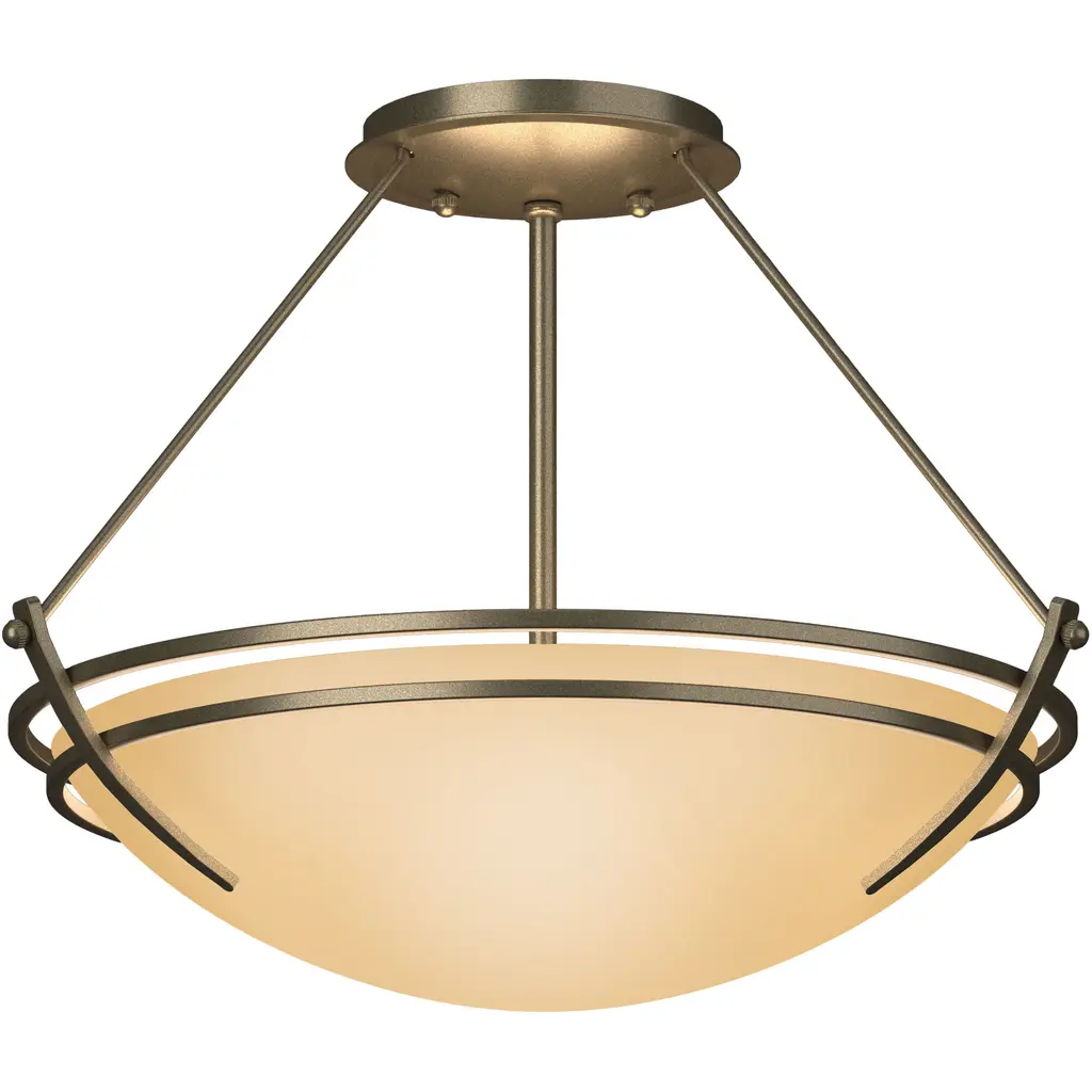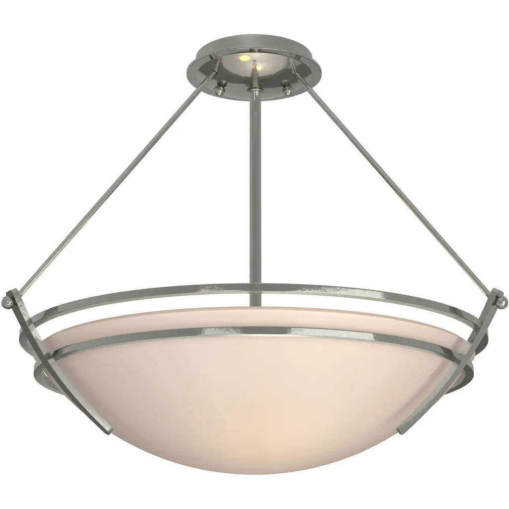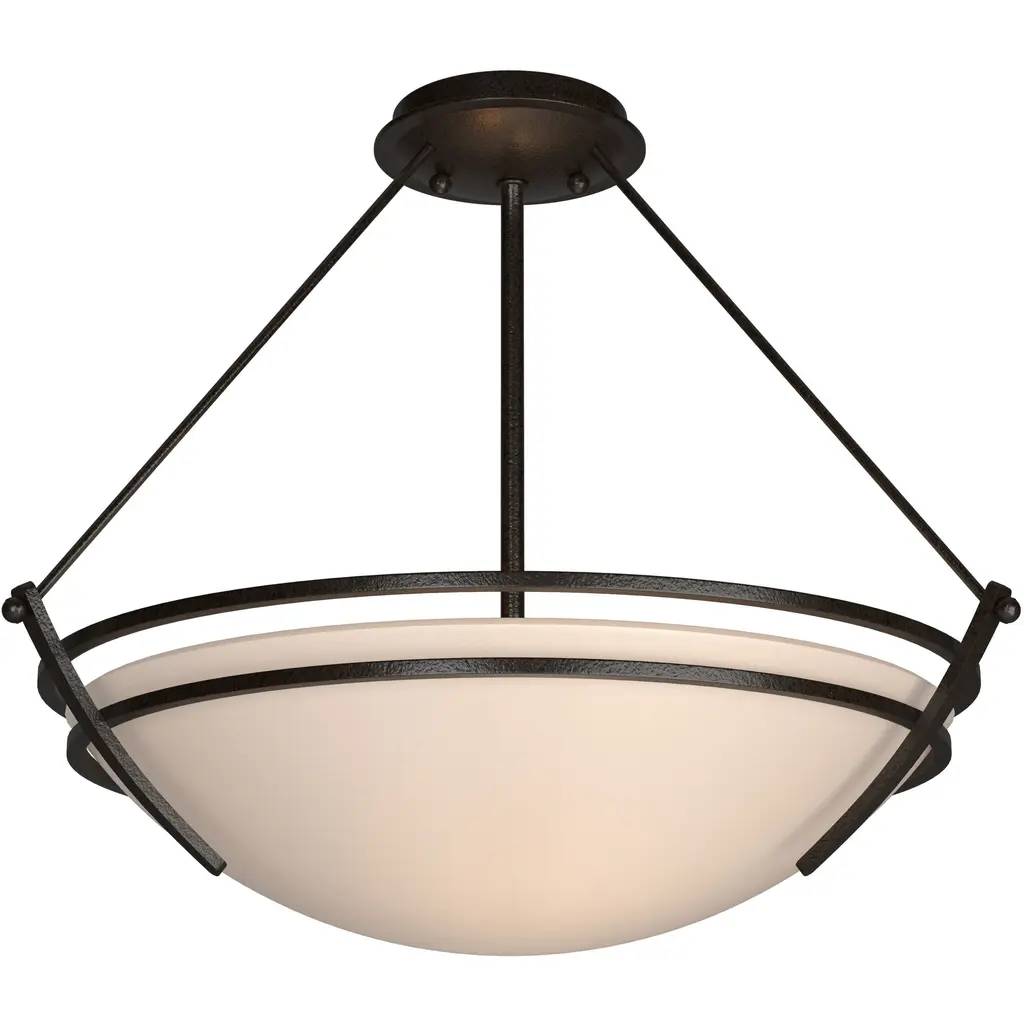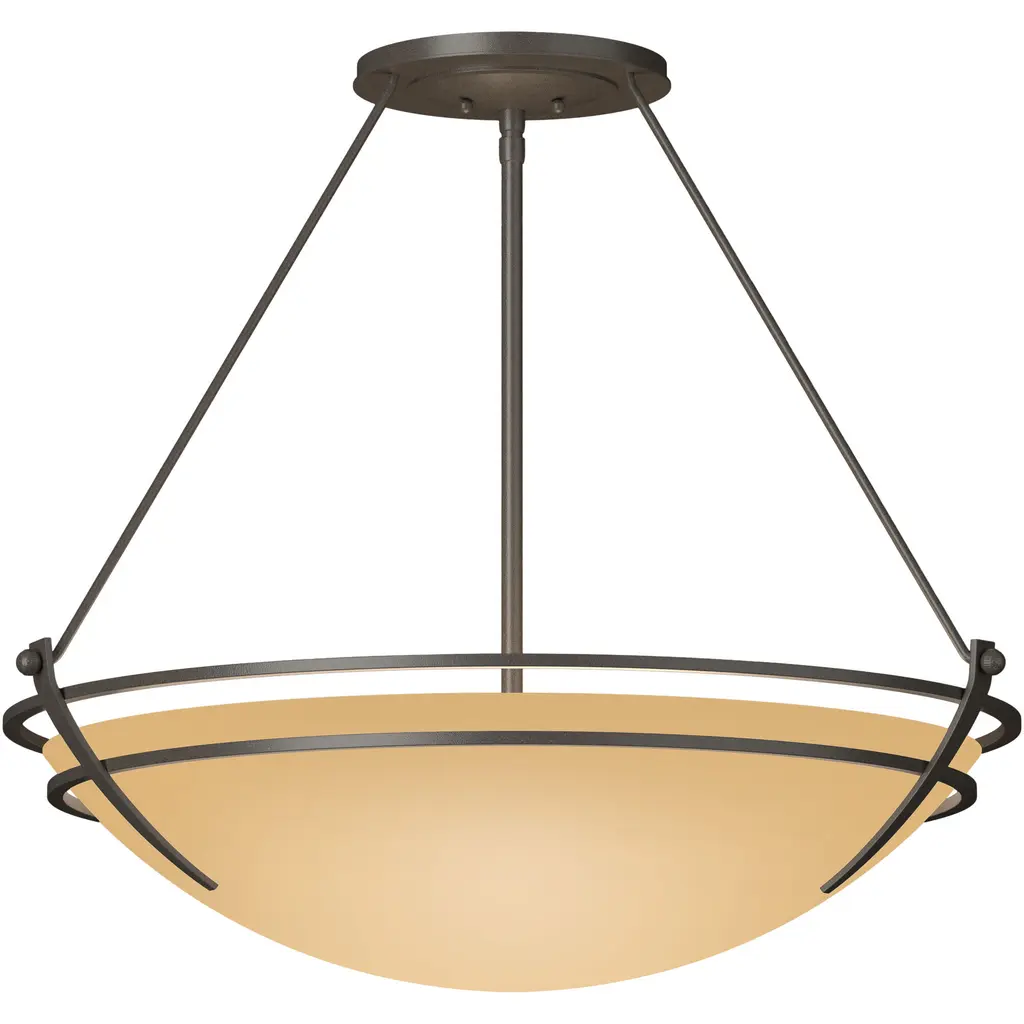 Concentric steel bands circle the glass bowl. Handcrafted steel tines hold the bowl. This modern fixture is crafted using a mix of tradition and technique by artisans at our forge here in Vermont.