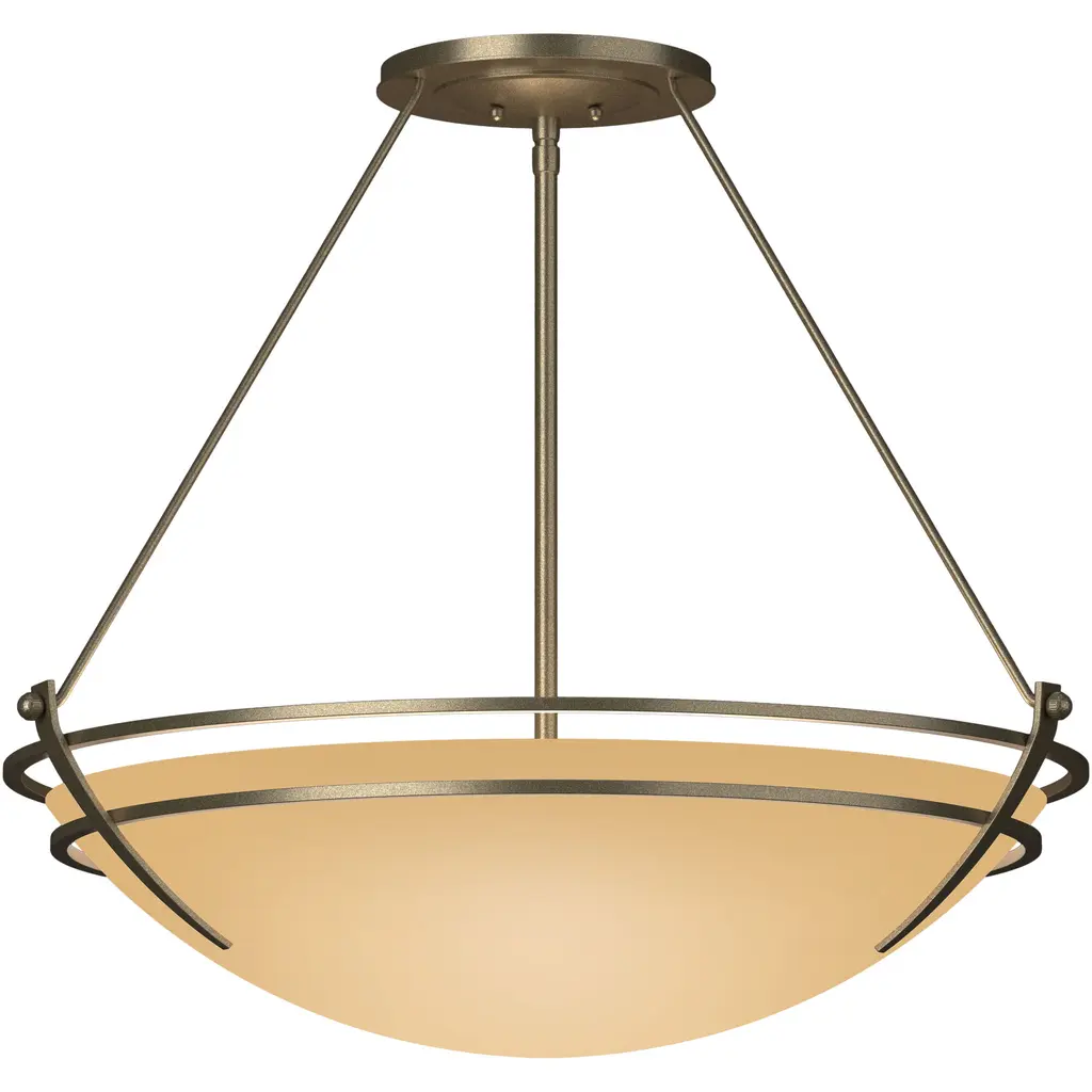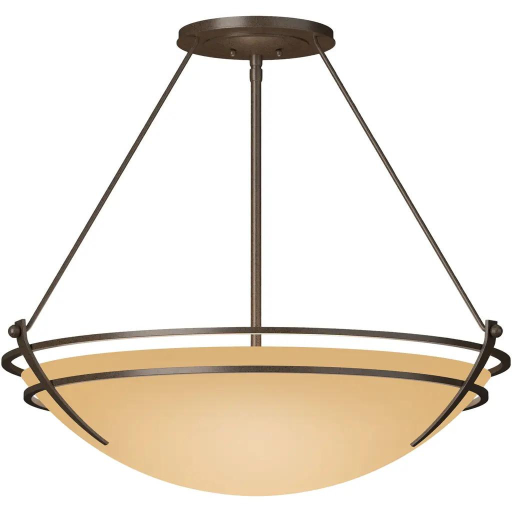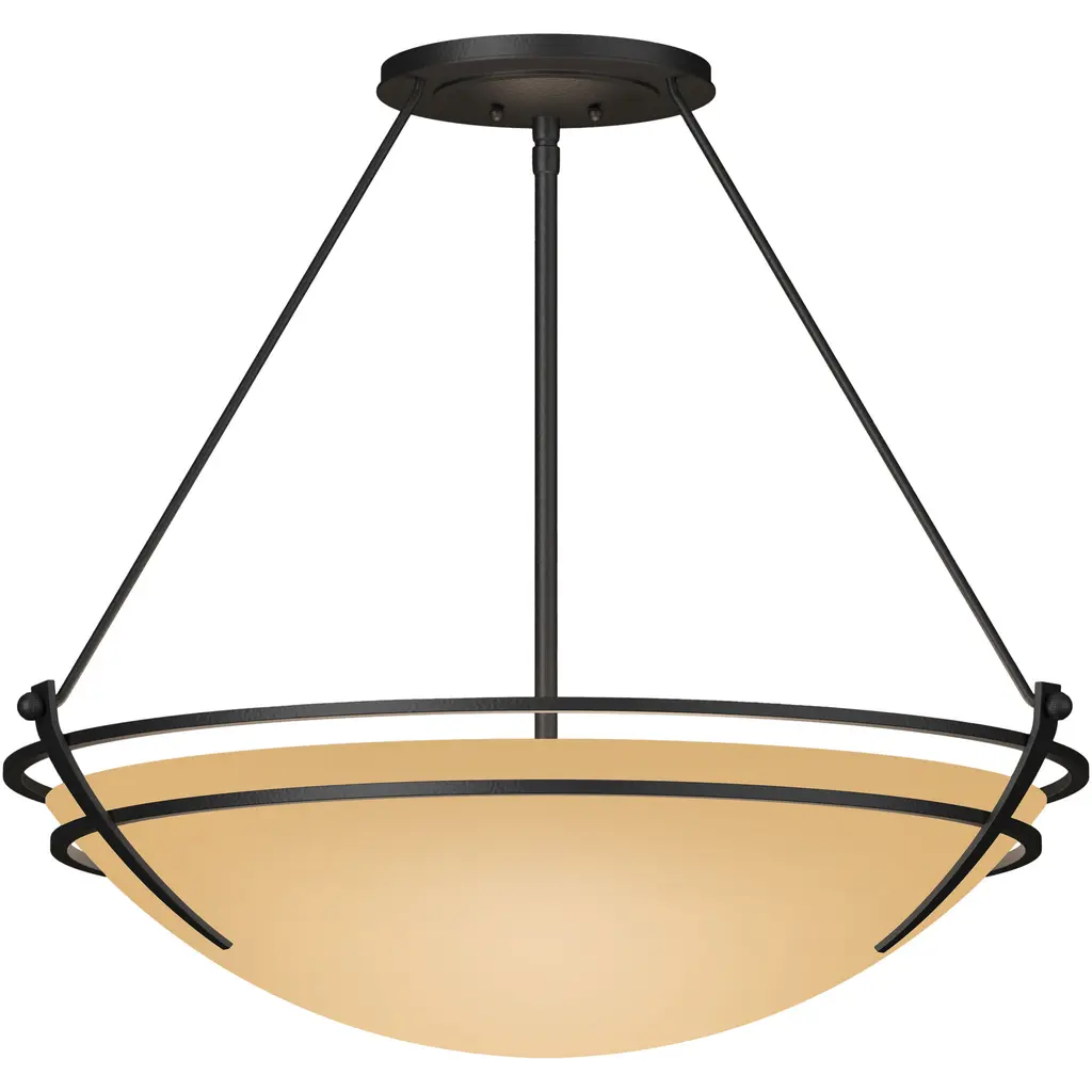 Concentric steel bands circle the glass bowl. Handcrafted steel tines hold the bowl. This modern fixture is crafted using a mix of tradition and technique by artisans at our forge here in Vermont.
