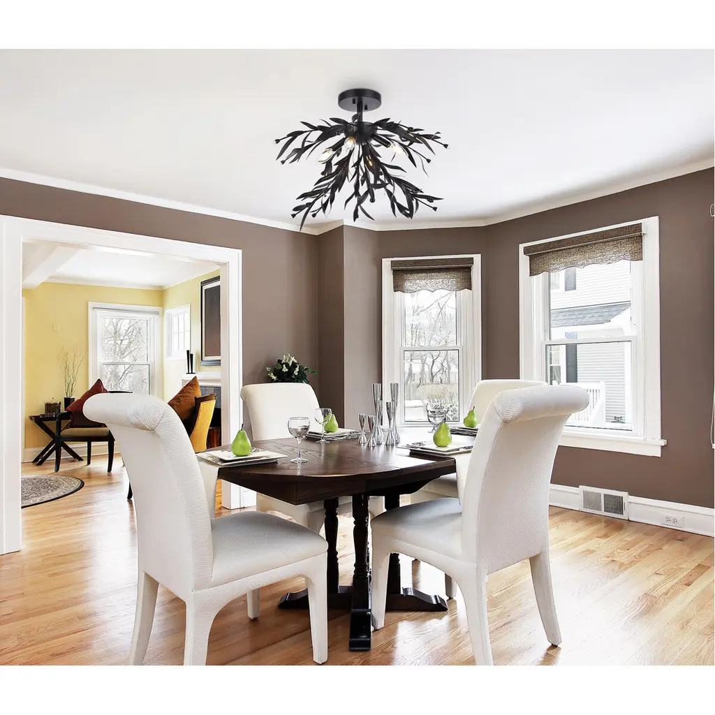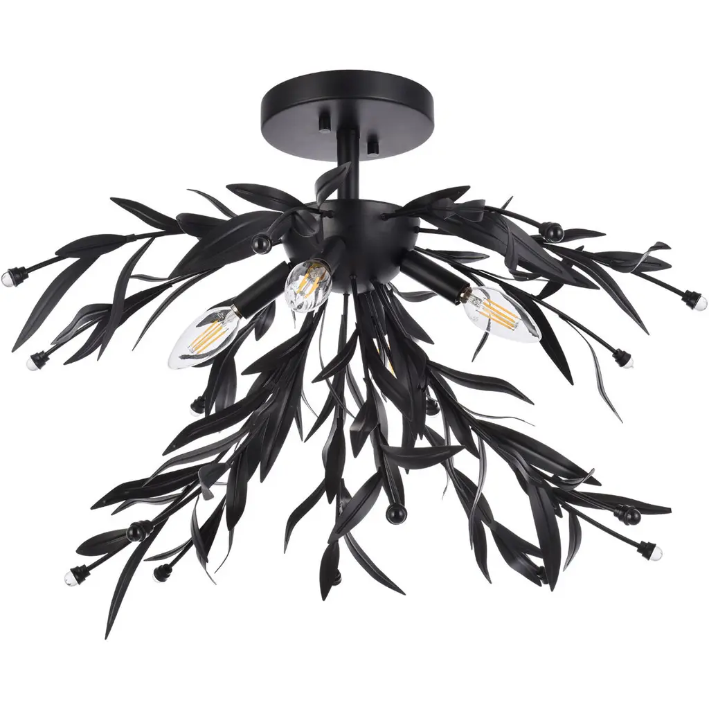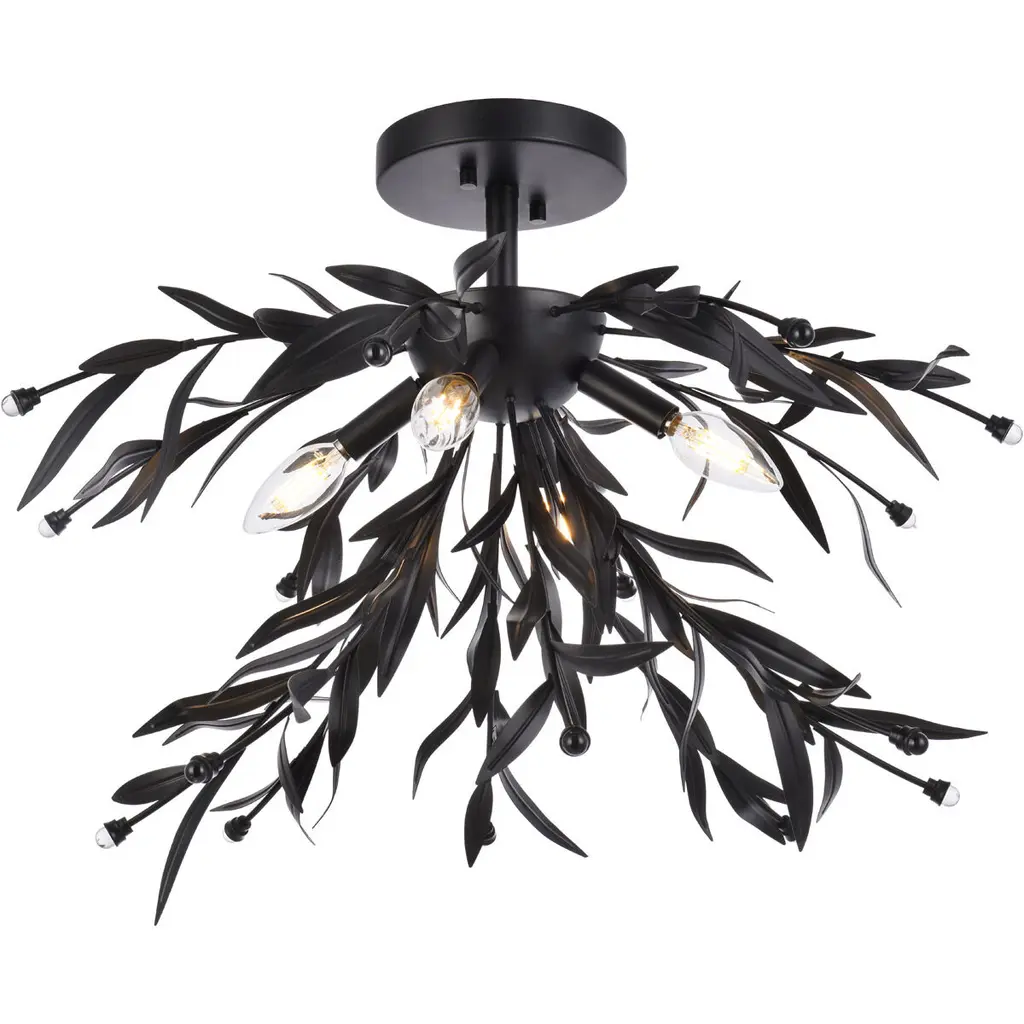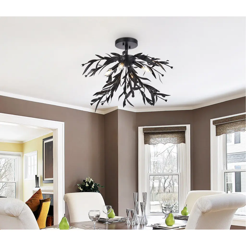 This 4 light semi-flush mount is sure to add a nice focal point in your space. The circular canopy, small downrod, and sockets are made from metal of your choice of finish. It features several leaf branches tipped with clear crystal bead. This fixture takes four 40W bulbs, (not included) that wash your space in a bright glow. It's compatible with a dimmer switch, so you'll always have the right amount of light no matter the time of day.