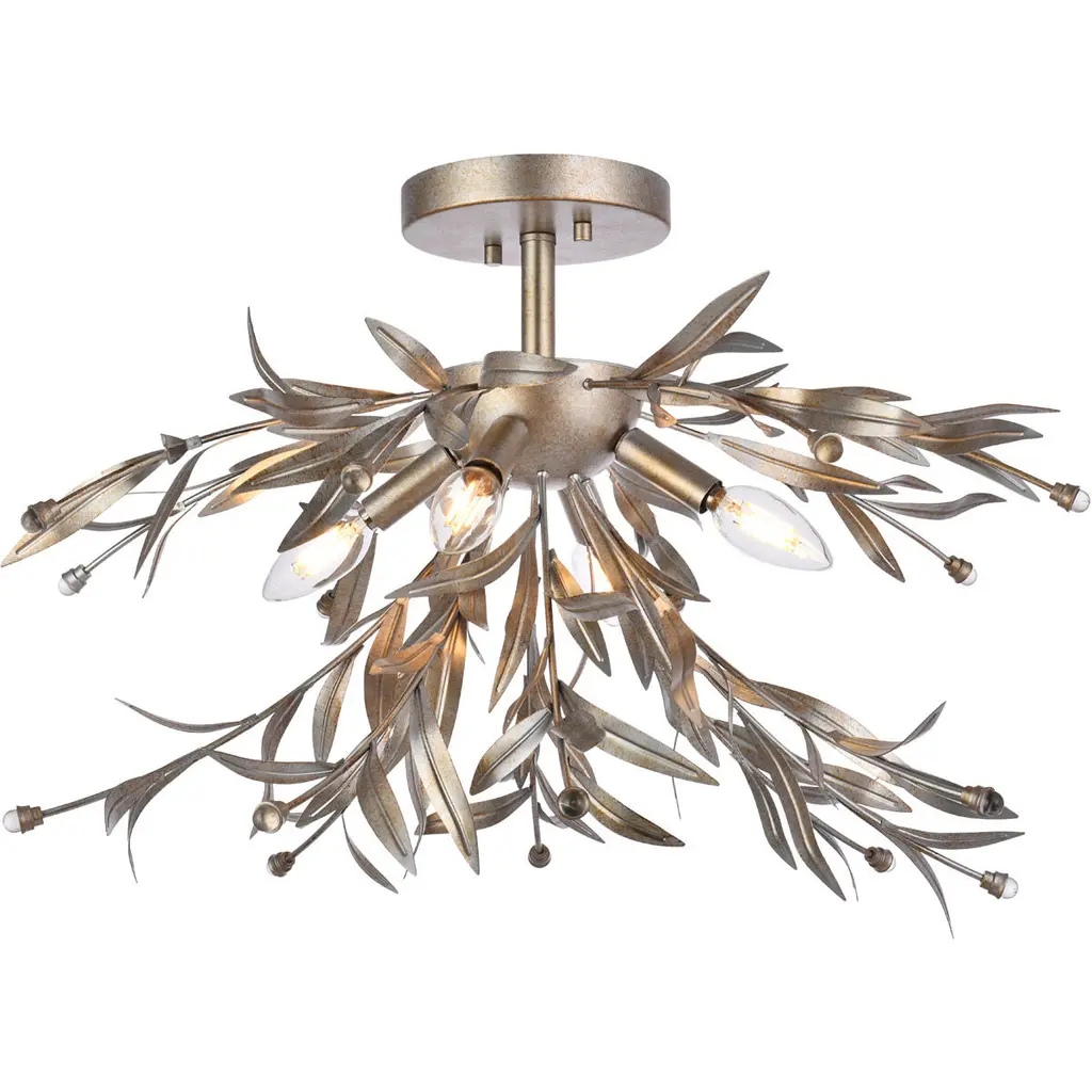 This 4 light semi-flush mount is sure to add a nice focal point in your space. The circular canopy, small downrod, and sockets are made from metal of your choice of finish. It features several leaf branches tipped with clear crystal bead. This fixture takes four 40W bulbs, (not included) that wash your space in a bright glow. It's compatible with a dimmer switch, so you'll always have the right amount of light no matter the time of day.