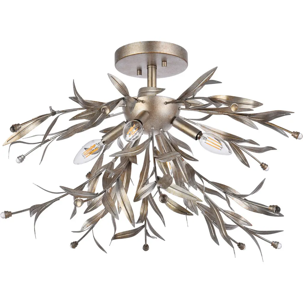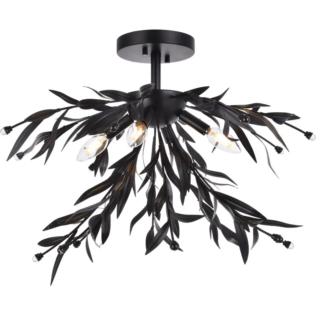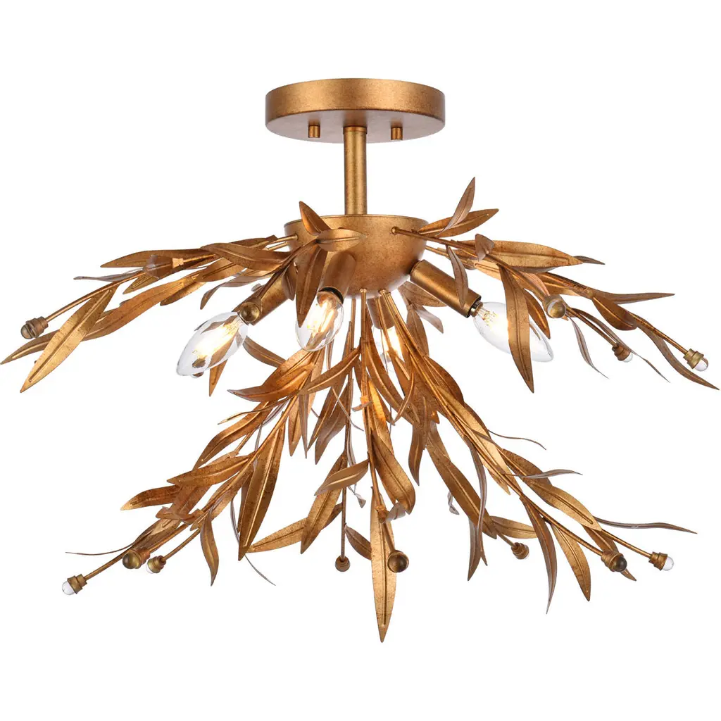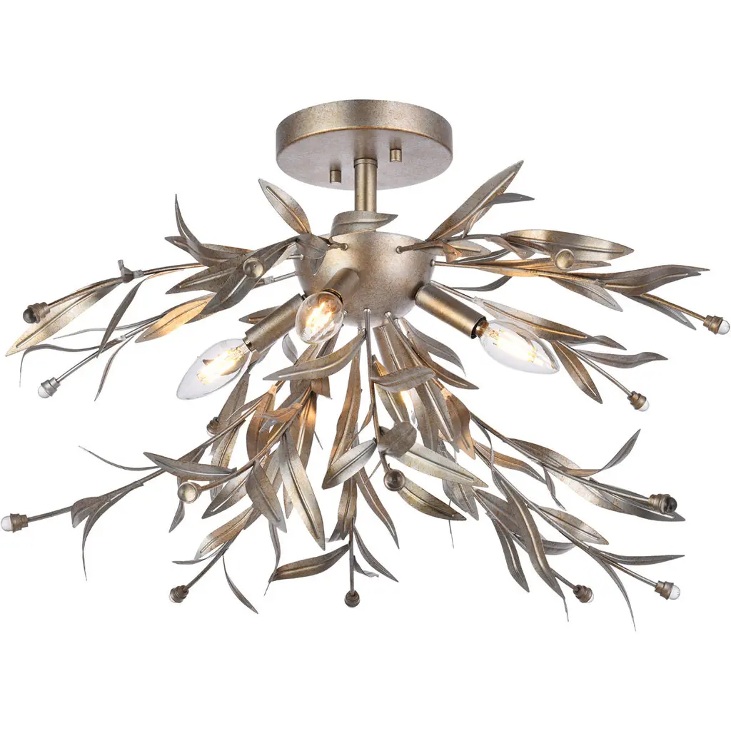 This 4 light semi-flush mount is sure to add a nice focal point in your space. The circular canopy, small downrod, and sockets are made from metal of your choice of finish. It features several leaf branches tipped with clear crystal bead. This fixture takes four 40W bulbs, (not included) that wash your space in a bright glow. It's compatible with a dimmer switch, so you'll always have the right amount of light no matter the time of day.