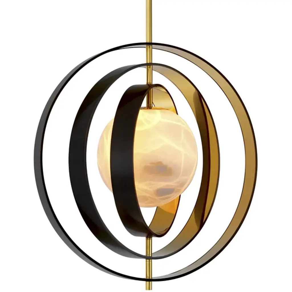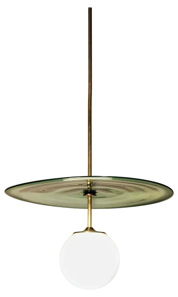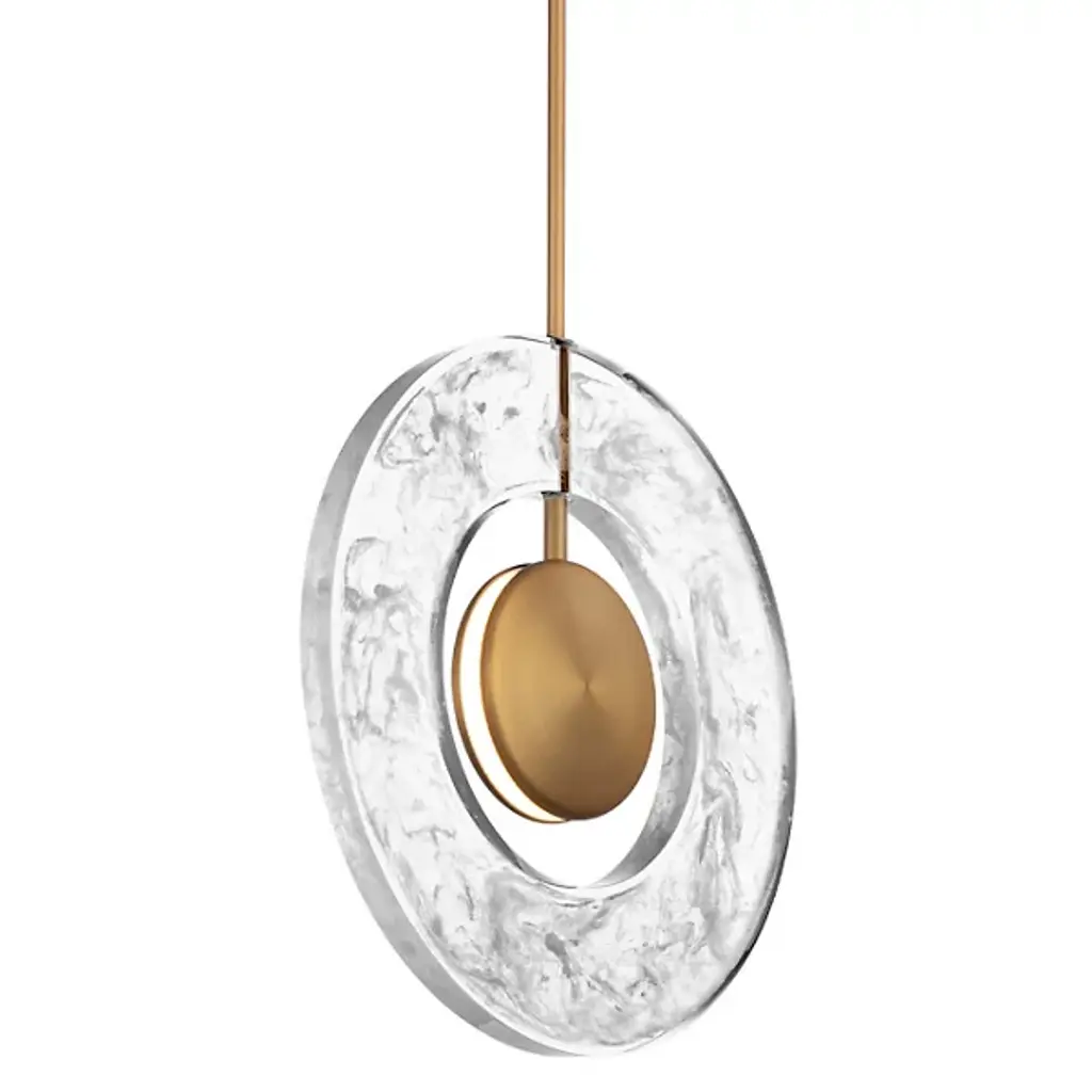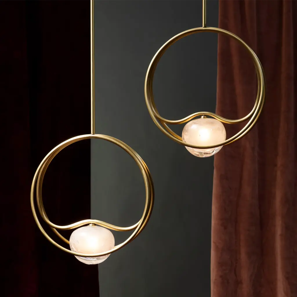 Suspension lamp composed of brass rings with light source inserted in a hollow crystal volume. The brass comes in a satin finish. Please, contact the Concierge for further information.