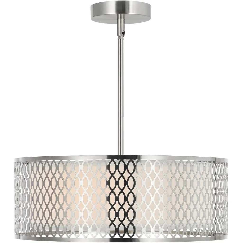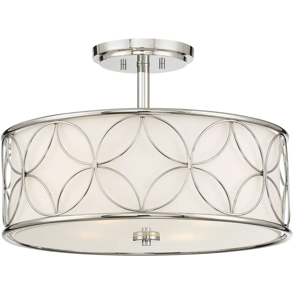 A beautiful geometric pattern adorns this Savoy House Reid 4-light ceiling light. Finished in polished nickel, the pattern pops brightly against the inner white fabric shade. Reid is perfect for boosting the illumination in any room, even smaller spaces. It is 13.5" in height and 20" in diameter. It uses four standard size bulbs of up to 60 watts per bulb.