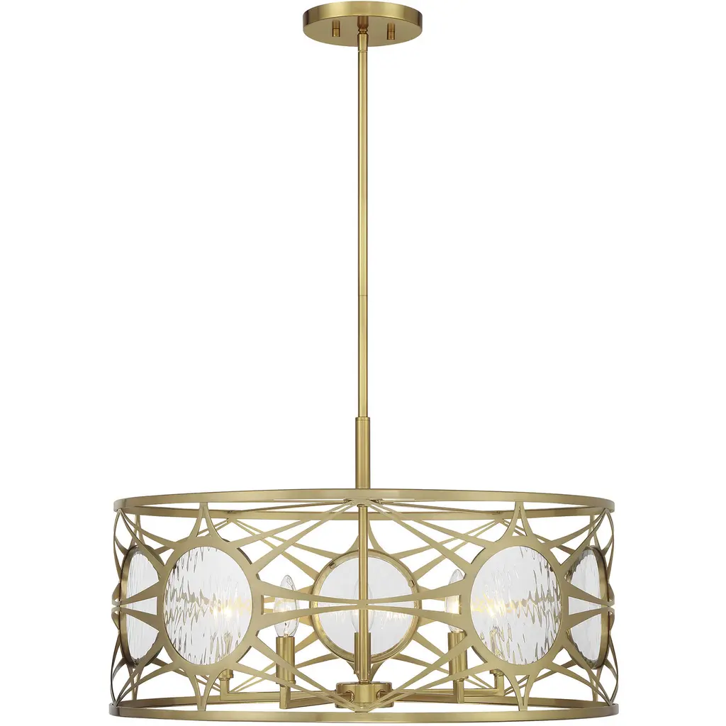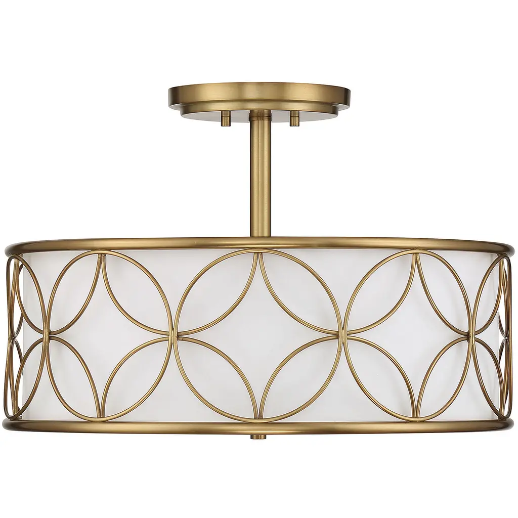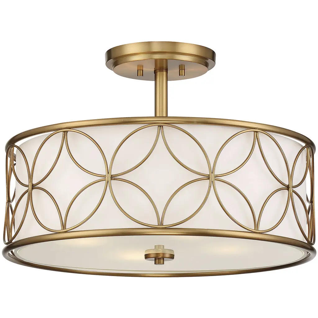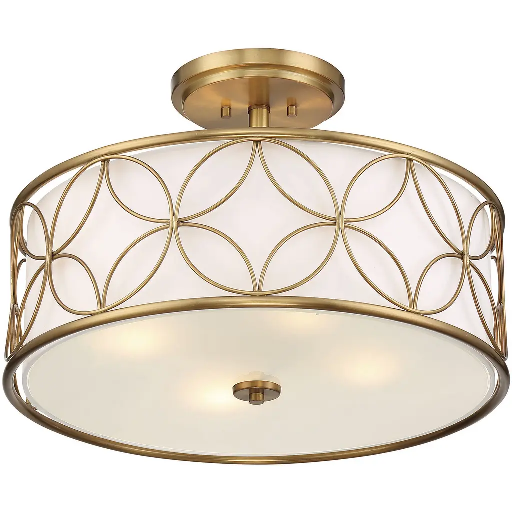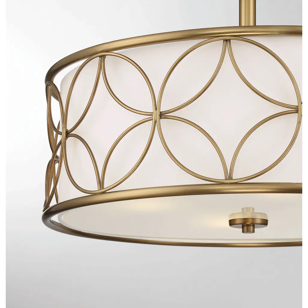 A beautiful geometric pattern adorns this Savoy House Reid 4-light ceiling light. Finished in warm brass, the pattern pops brightly against the inner white fabric shade. Reid is perfect for boosting the illumination in any room, even smaller spaces. It is 13.5" in height and 20" in diameter. It uses four standard size bulbs of up to 60 watts per bulb.
