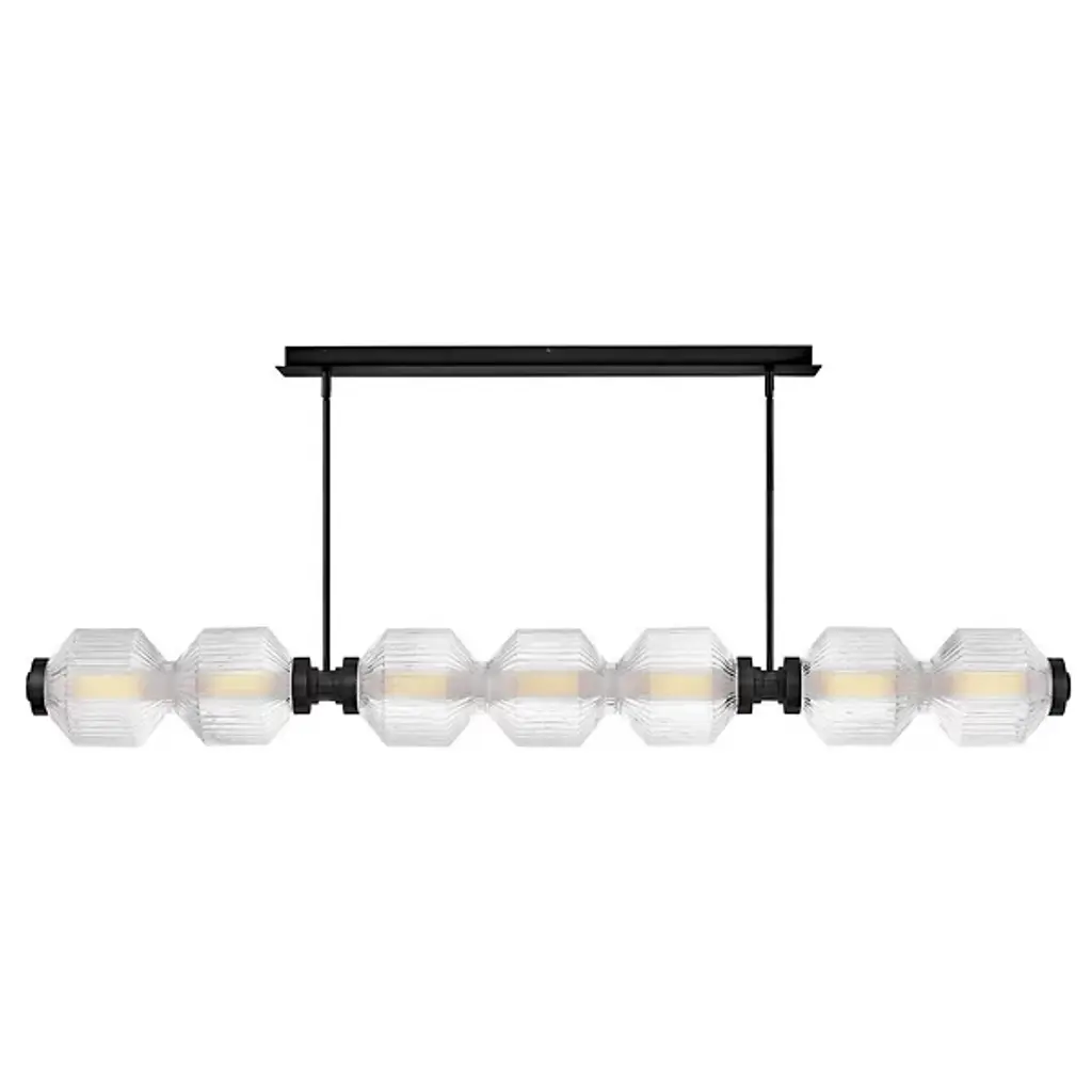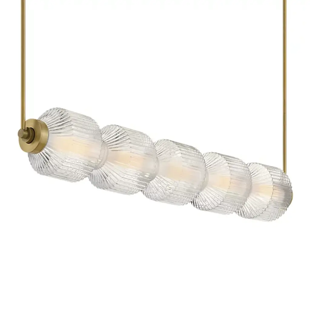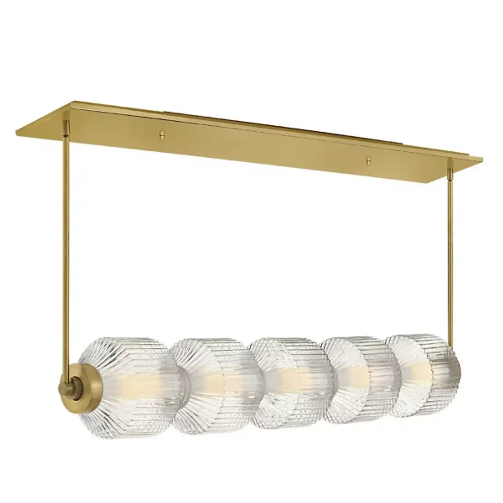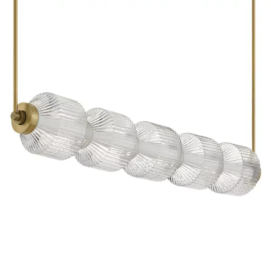Give your decorative arrangement a transitional look with the Reign LED Linear Suspension by Fredrick Ramond. Reign’s glamorous silhouette combines textural interest and vibrant elements. Clear ribbed glass shades and a fine metal framework present this fixture which is visually intriguing form from any angle. Your linear suspension is secured by a rectangular ceiling canopy and is Illuminated by integrated LED lighting.