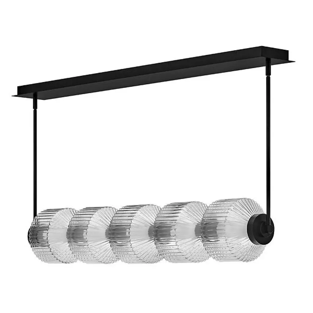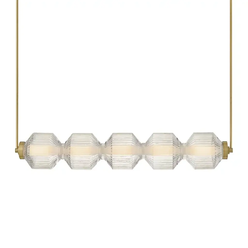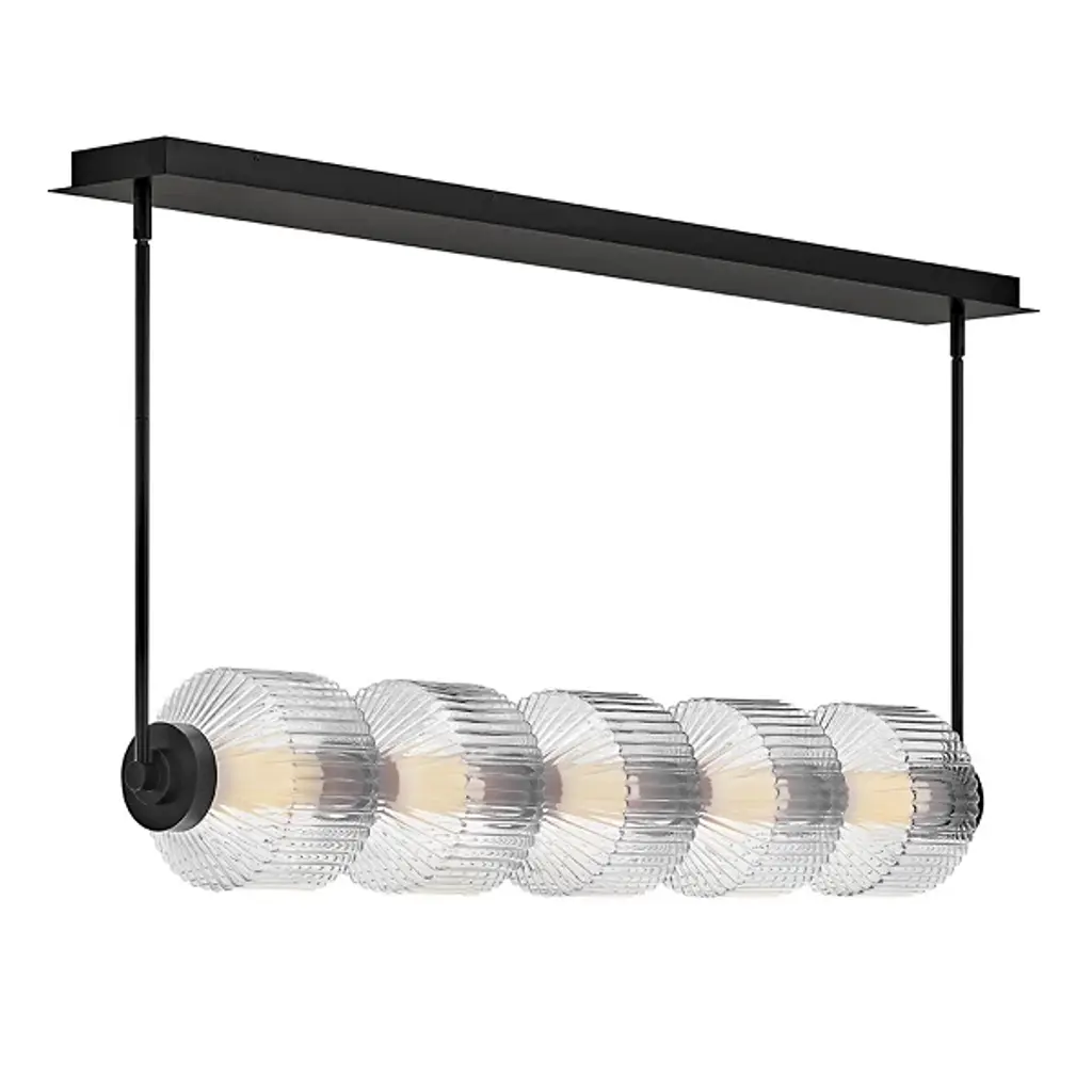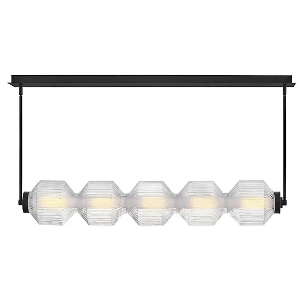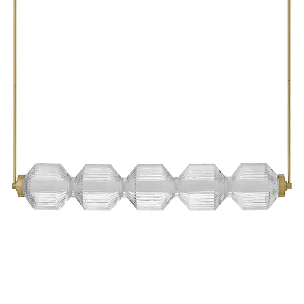 Give your decorative arrangement a transitional look with the Reign LED Linear Suspension by Fredrick Ramond. Reign’s glamorous silhouette combines textural interest and vibrant elements. Clear ribbed glass shades and a fine metal framework present this fixture which is visually intriguing form from any angle. Your linear suspension is secured by a rectangular ceiling canopy and is Illuminated by integrated LED lighting.