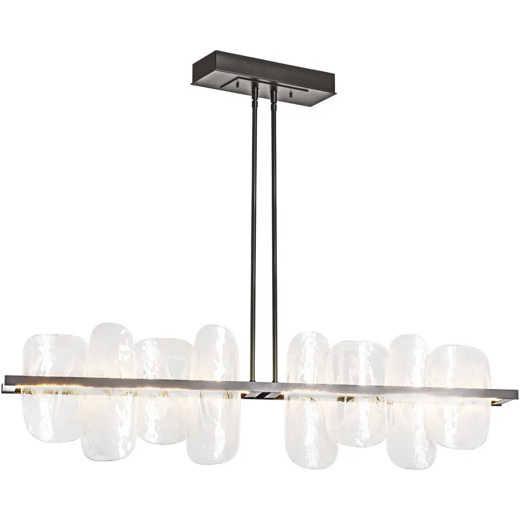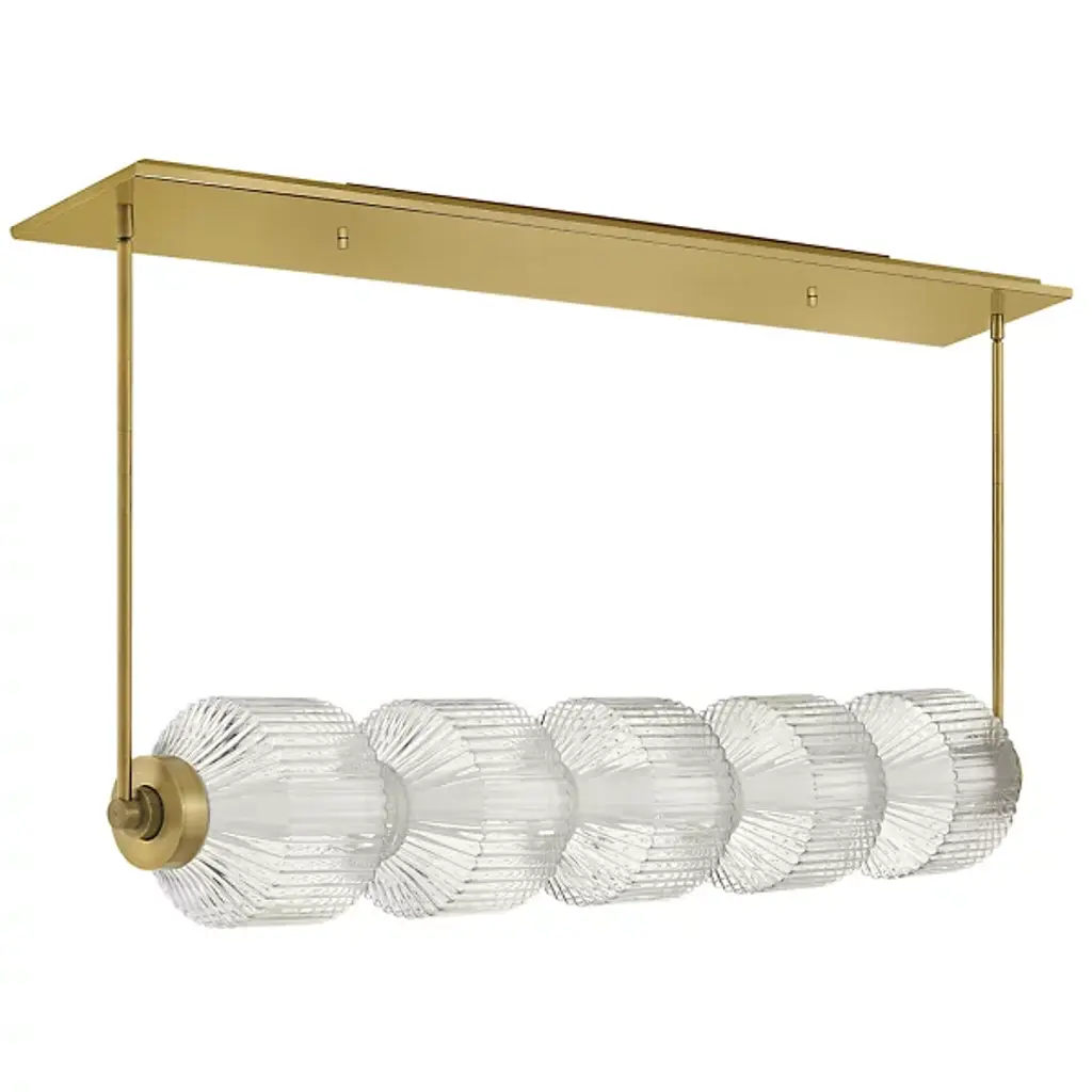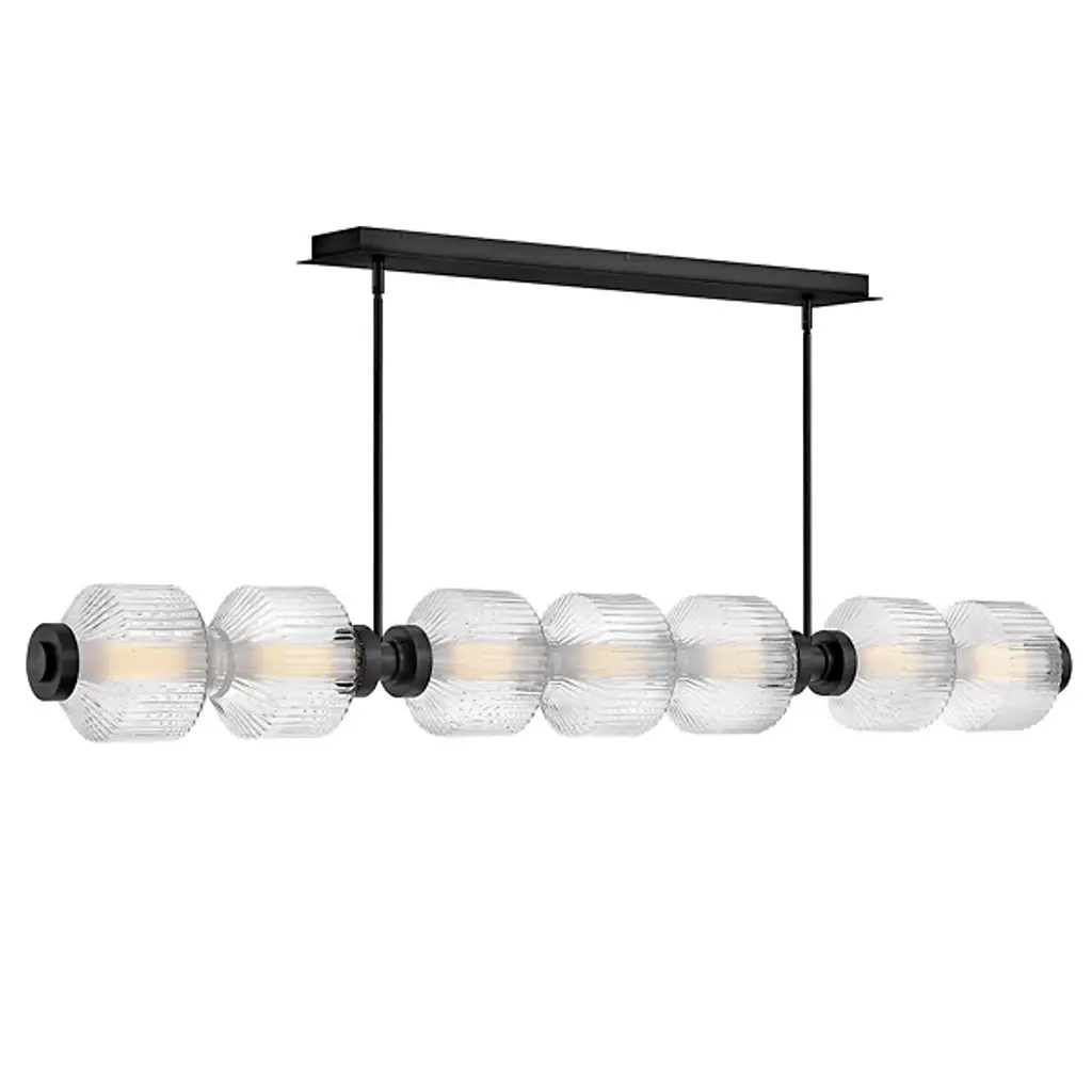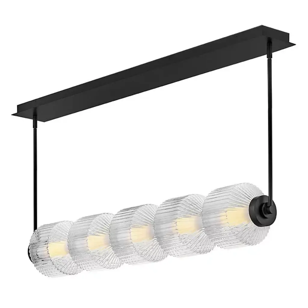 Give your decorative arrangement a transitional look with the Reign LED Linear Suspension by Fredrick Ramond. Reign’s glamorous silhouette combines textural interest and vibrant elements. Clear ribbed glass shades and a fine metal framework present this fixture which is visually intriguing form from any angle. Your linear suspension is secured by a rectangular ceiling canopy and is Illuminated by integrated LED lighting.