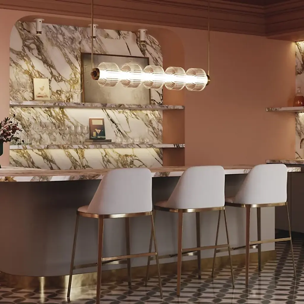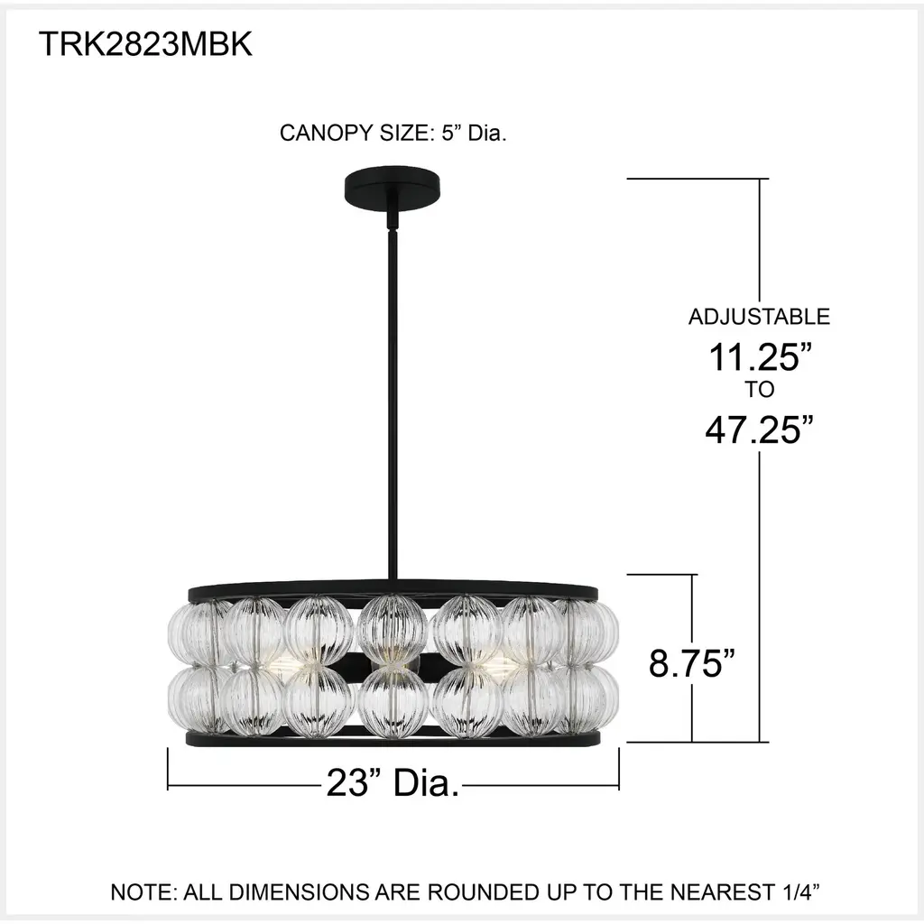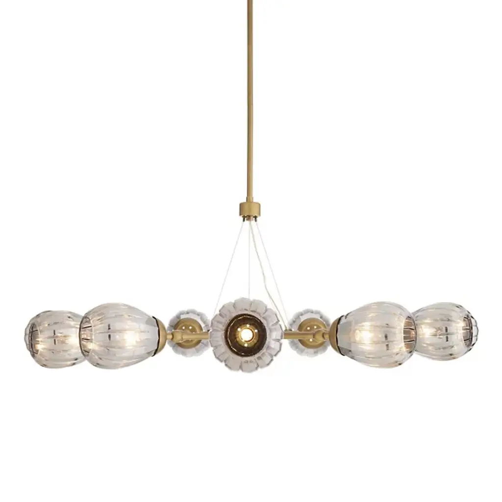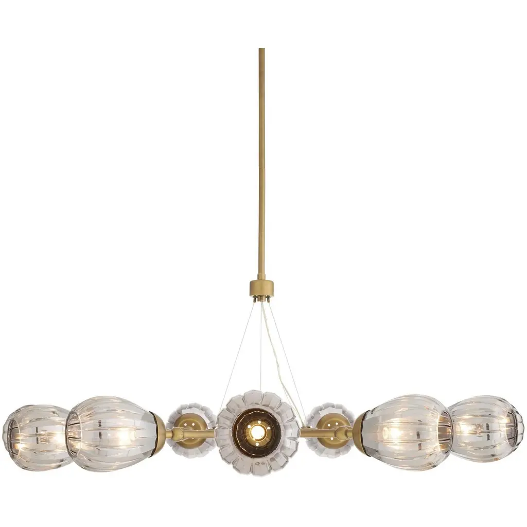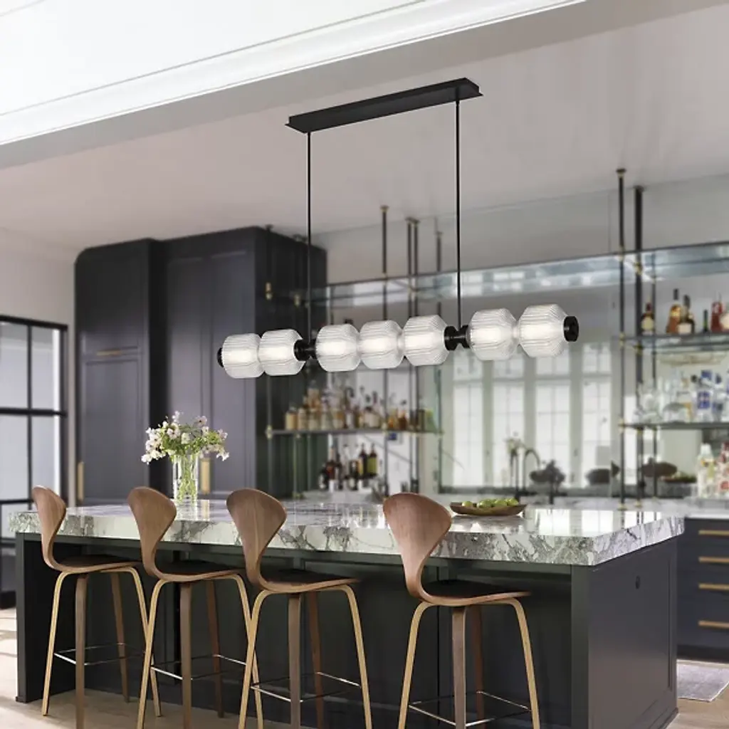 Give your decorative arrangement a transitional look with the Reign LED Linear Suspension by Fredrick Ramond. Reign’s glamorous silhouette combines textural interest and vibrant elements. Clear ribbed glass shades and a fine metal framework present this fixture which is visually intriguing form from any angle. Your linear suspension is secured by a rectangular ceiling canopy and is Illuminated by integrated LED lighting.
