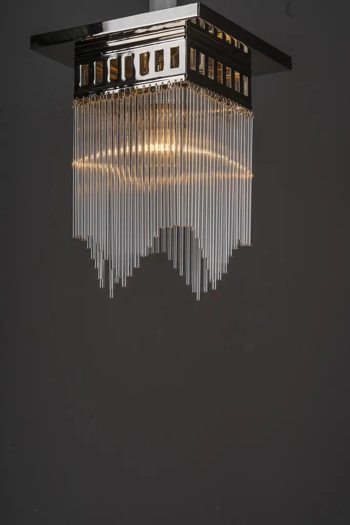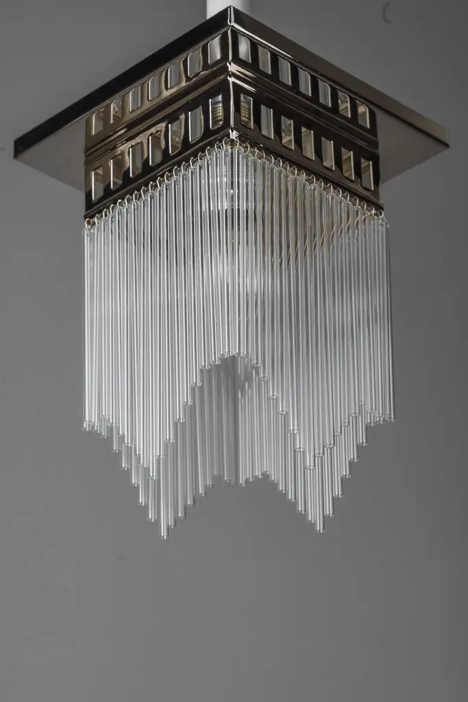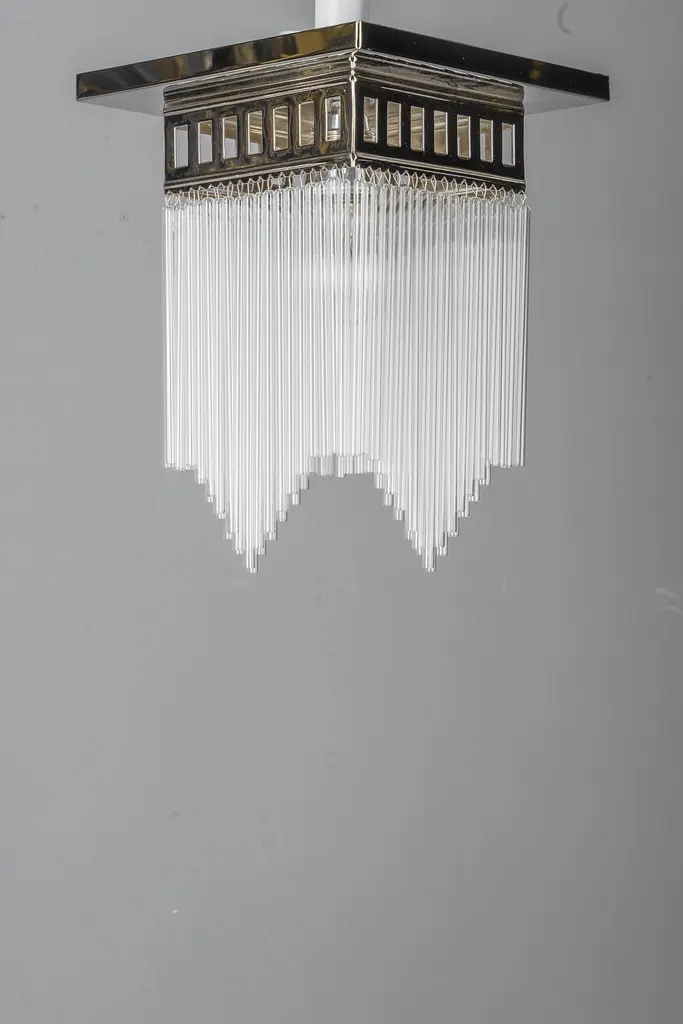 Ceiling lamp in the style of Art decoThis is a reproduction. ( New )We have also the same in brass would be a little bit cheaper.Glass rods can be as shown or they can be straight.Depending on the order quantity it can take up to 2 weeks to finish the lamps.