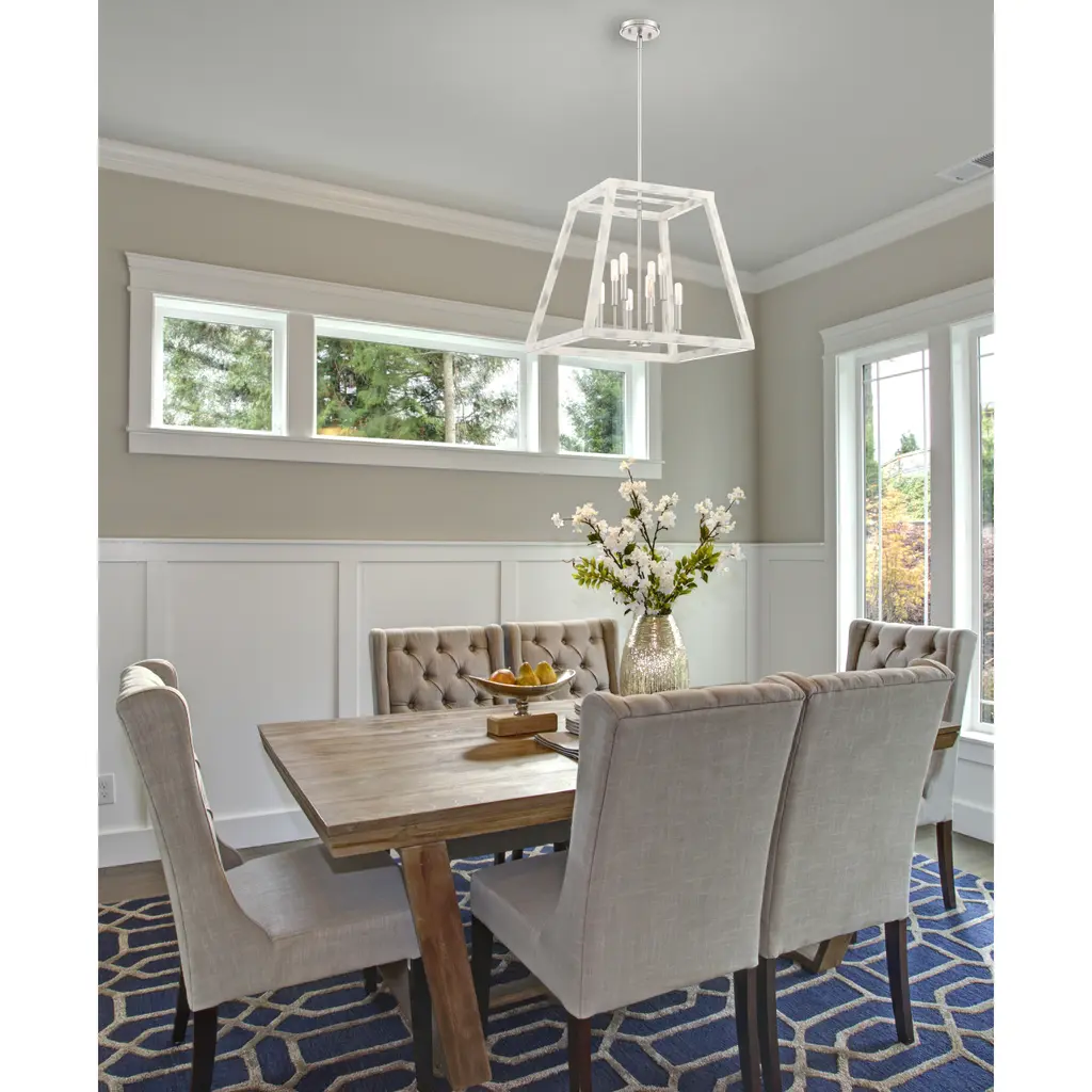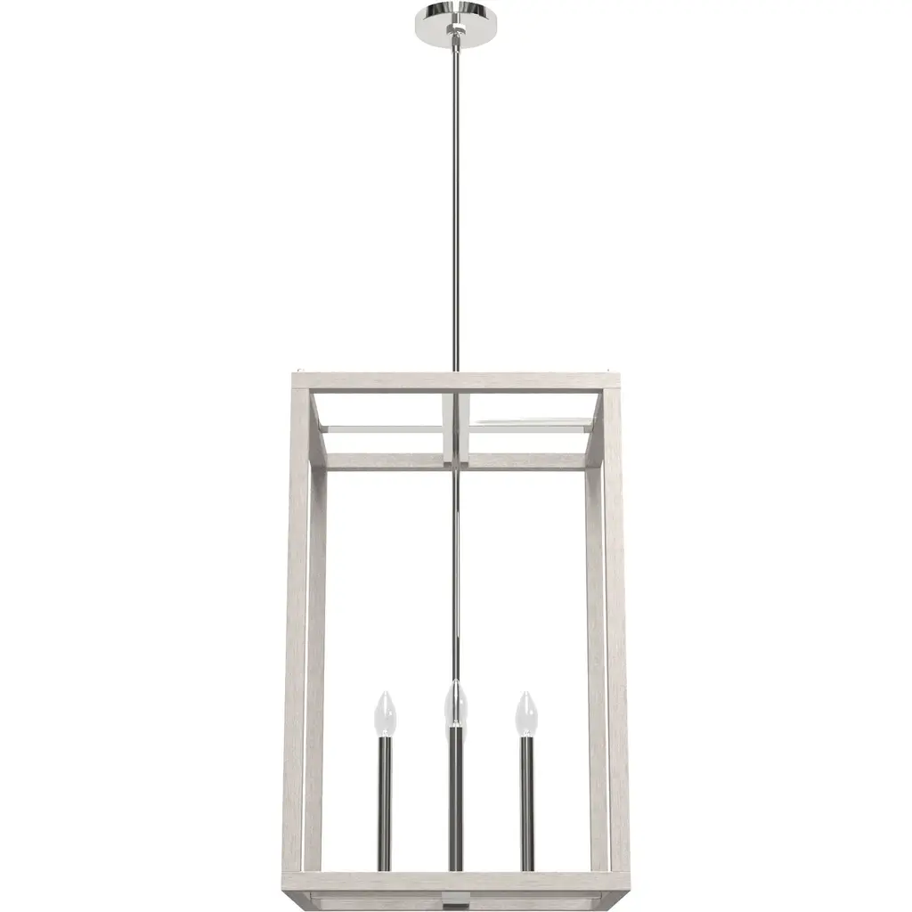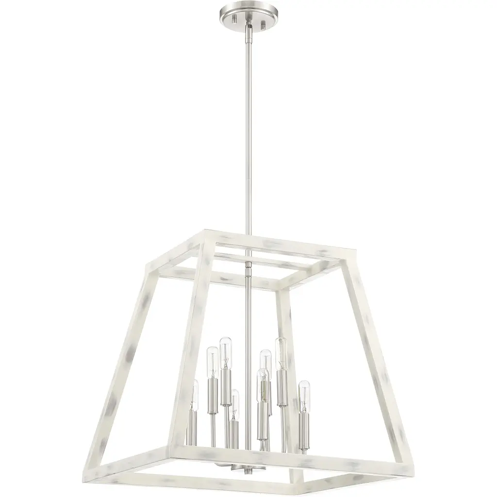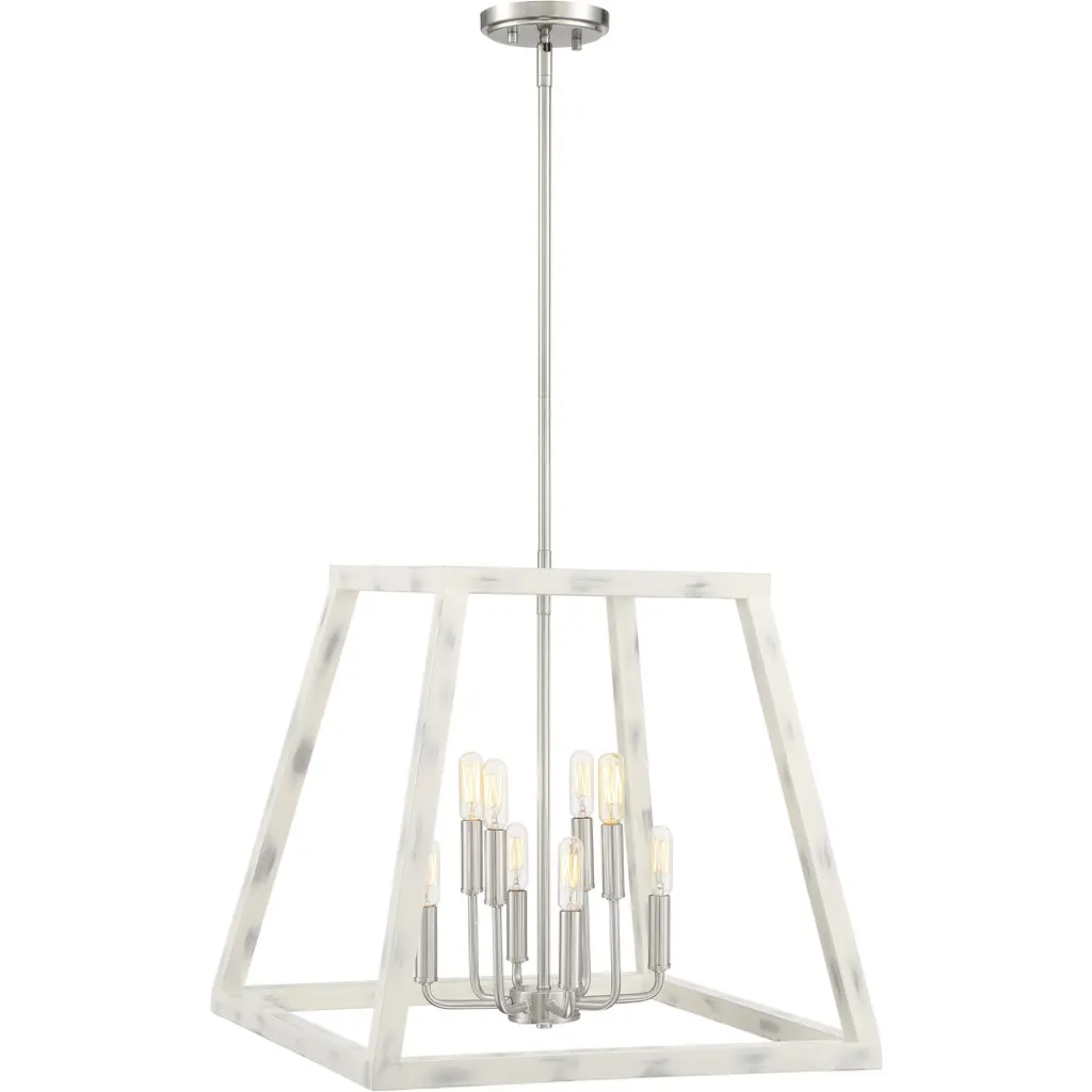 Satin Platinum finish silhouetted by a hand painted Coastal Weathered White Wood cage. The Rhode collection offers a modern elegance with timeless appeal. This hanging foyer light is designed to be the star of your room. It's designed for easy installation in entryways and living areas. Satin Platinum finsh silhouetted by a hand painted Coastal Weathered White Wood cage. The Rhode collection offers a modern elegance with timeless appeal.
