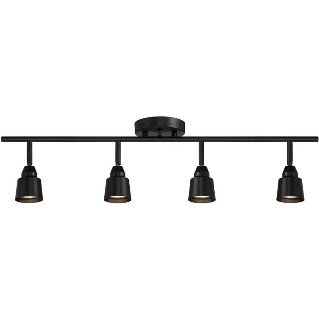 Infuse an abundance of sophisticated versatile light to an commercial or residential setting with this brushed nickel four-head track light fixture. Multi-directional lamp heads provide design flexibility and illuminate typically hard-to-reach areas. The round ceiling plate, thin metal bar, and light bases are coated in a beautiful satin white finish. Each lamp head features a crisp frosted glass shade for soft, general ambient light.