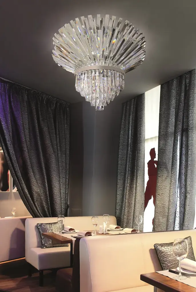 Light source: 6 x E14 (US E12) / 8 x E14 (US E12) / 10 x E14 (US E12) halogen energy saving - 6 x E14 (US E12) / 8 x E14 (US E12) / 10 x E14 (US E12) LED bulbs.A precious, clean and modern line with antique shades, a bright and particularly shiny crystal wrapped in a metal band, a perfect marriage between design, beauty and quality; a bright spot that conveys value, style, and uniqueness to every ambient it is added to.Available finishes: Polished chrome, Tortora, Brushed Burnished.