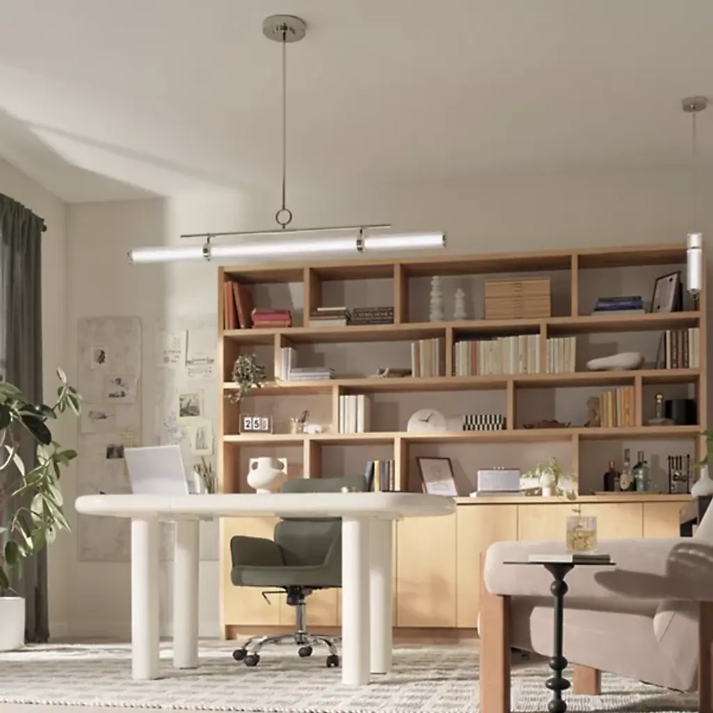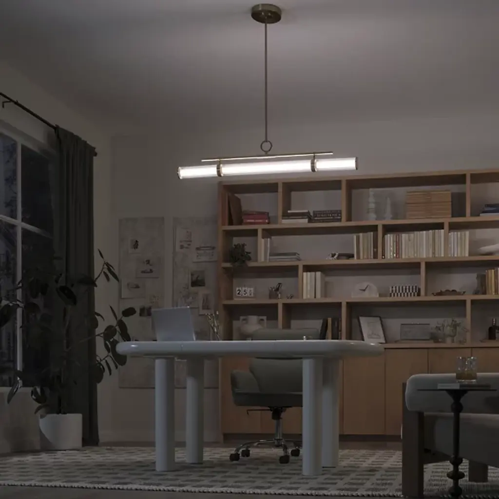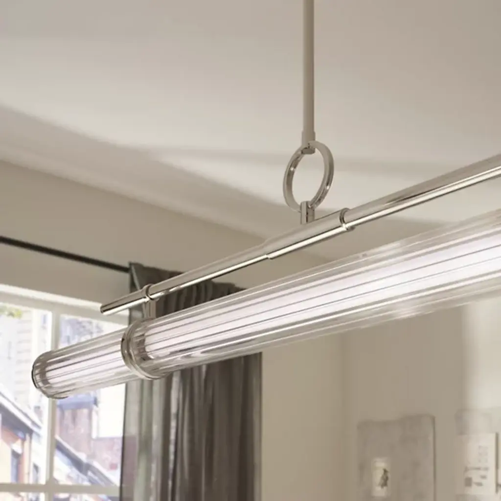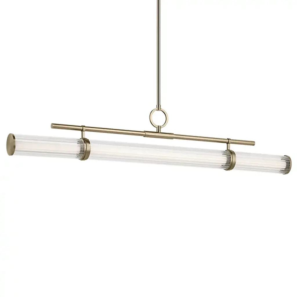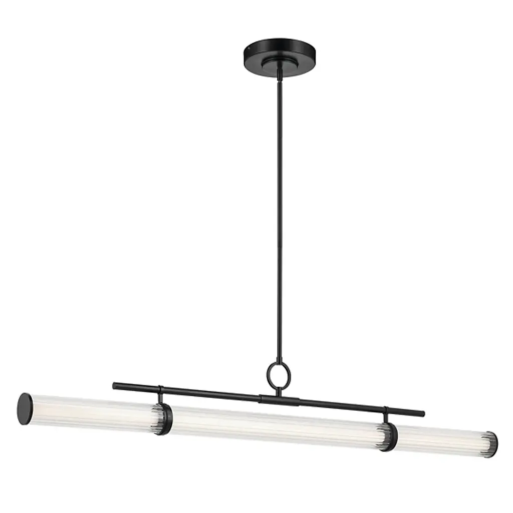 The Riven LED Linear Suspension from Kichler blends timeless simplicity with sophisticated design inspired by the form of a vintage map bag reminiscent of old-world exploration. Clear fluted glass encases a white acrylic interior, gently diffusing the integrated LED light to create a soft, ambient glow. Both energy-efficient and visually striking, this versatile fixture brings a sense of elegance and character to dining areas, kitchens, or open living spaces—perfect for interiors that appreciate subtle detail and refined craftsmanship.