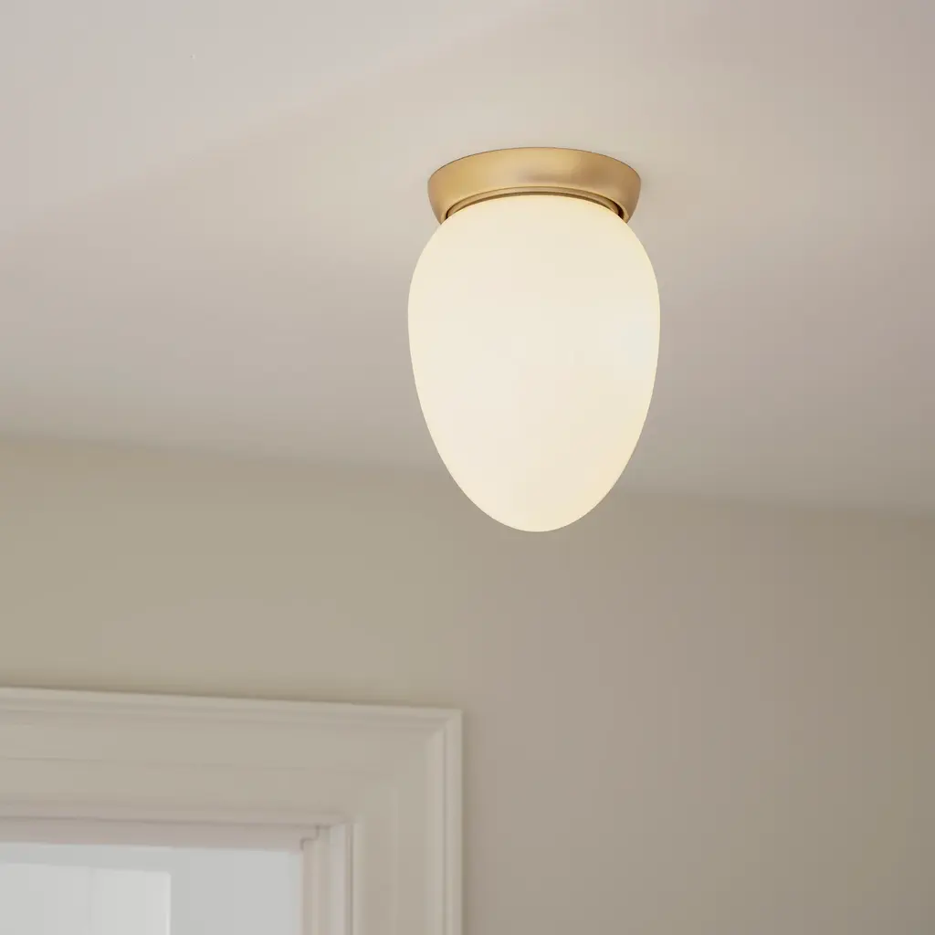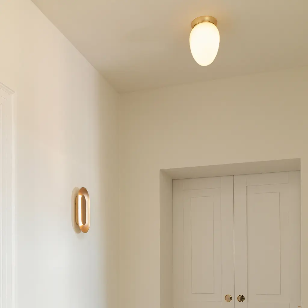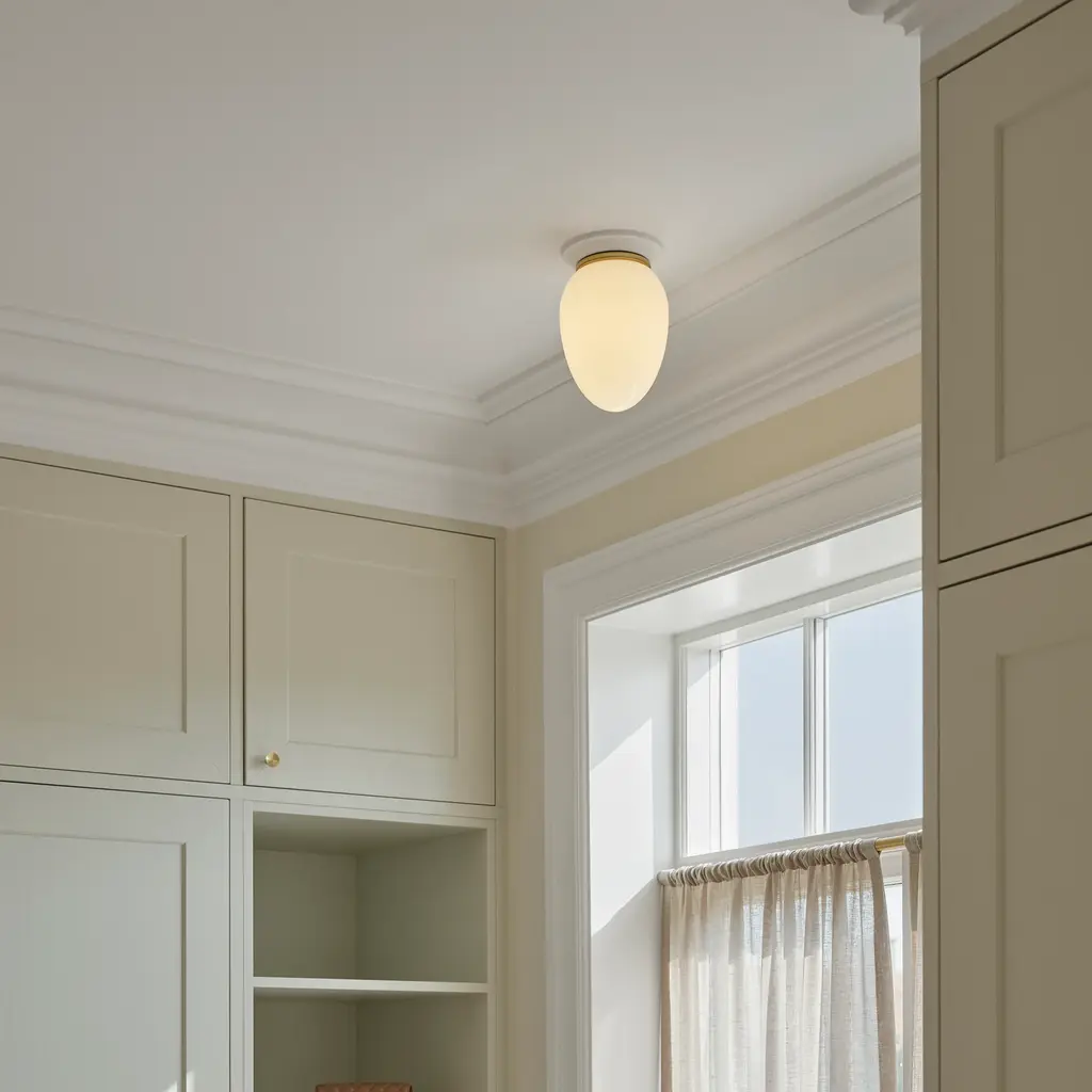 The Rizzatto 171 Ceiling Light features a satin brass ceiling ring paired with an oval, mouth-blown opal white glass shade. This combination provides soft, glare-free lighting, making it perfect for smaller areas like hallways or entrances.