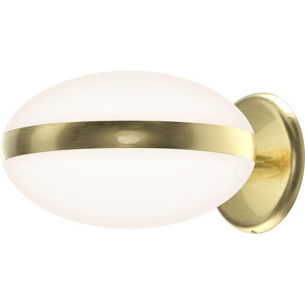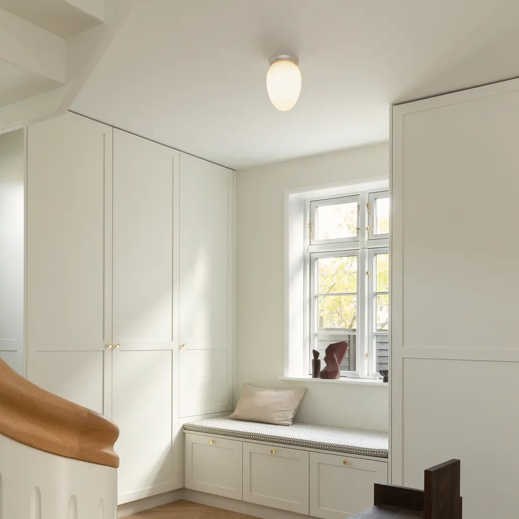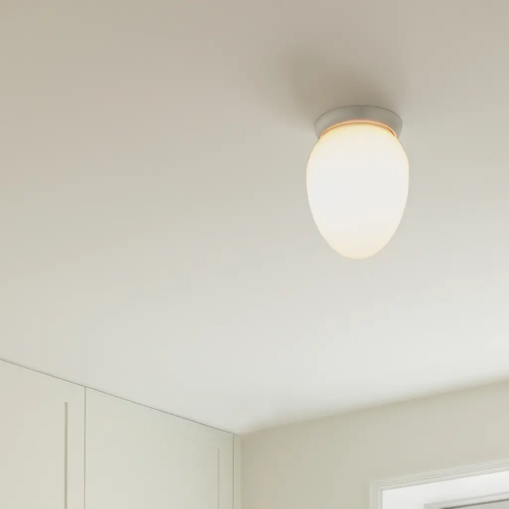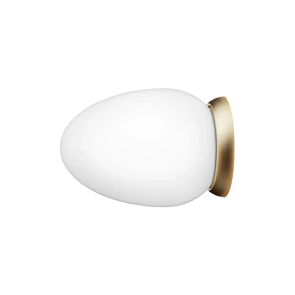 The Rizzatto 171 Ceiling Light features a satin brass ceiling ring paired with an oval, mouth-blown opal white glass shade. This combination provides soft, glare-free lighting, making it perfect for smaller areas like hallways or entrances.