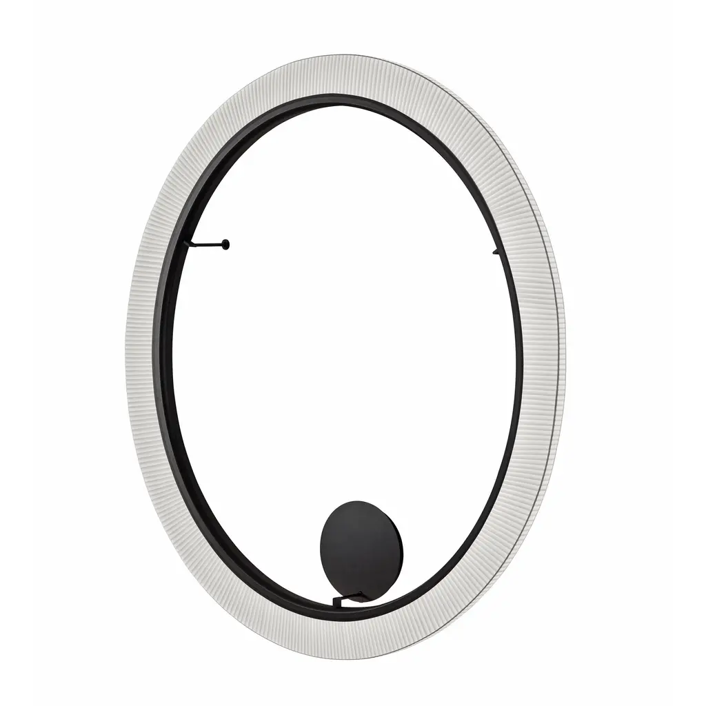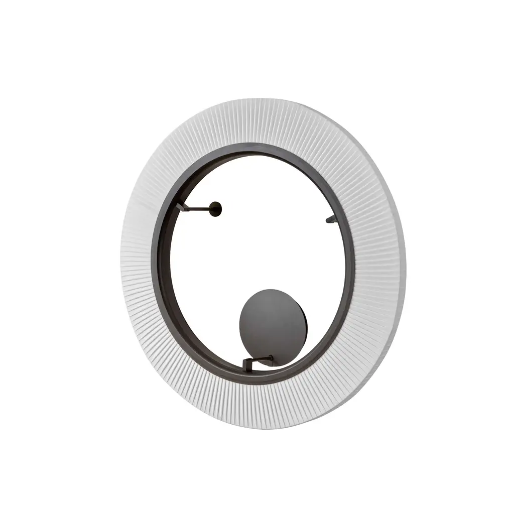 The Roda Collection is characterized by its large, cylindrical, ring-shaped shade. Its inner contour is surrounded by an aluminum ring housing a continuous circle of LEDs, emitting a uniform, filtered light. The warmth of the ribbon is highlighted by the dark ring outlining the perimeter, making these fixtures particularly cozy and lightweight, because despite their large volume, they seem weightless. Features