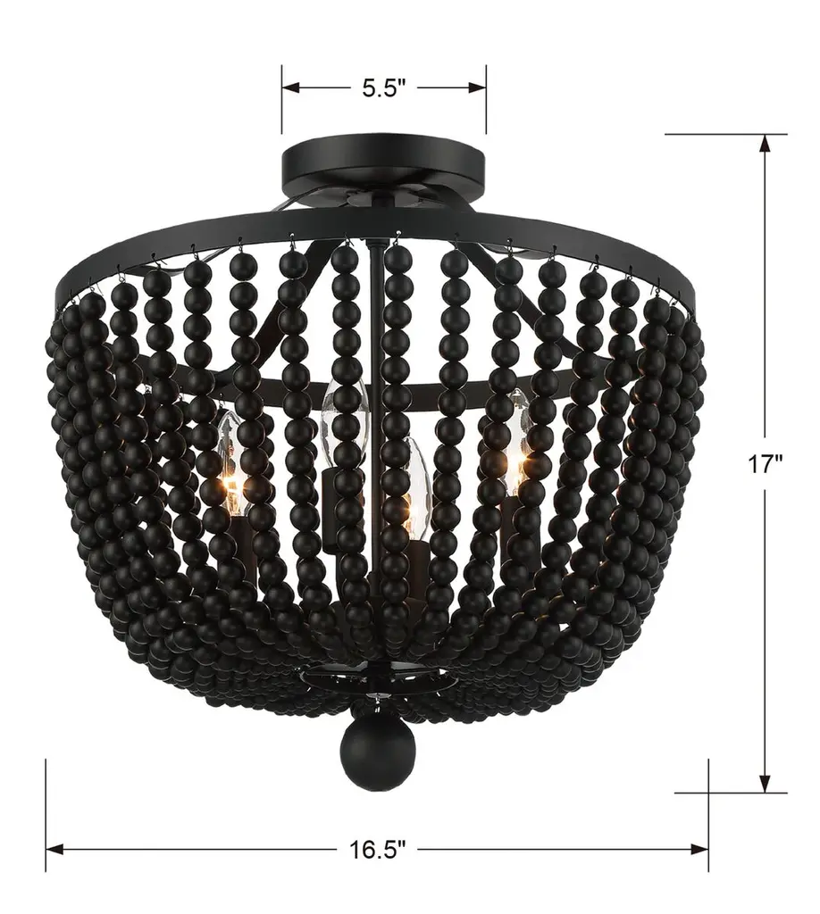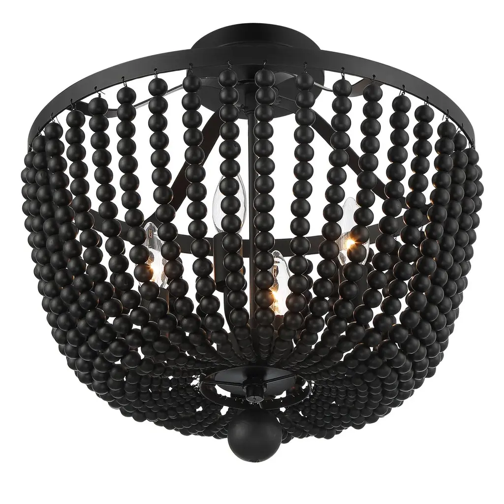 The matte black finish of the wooden beads and wrought-iron frame give this four-light ceiling fixture a boho sophistication that complements the classically elegant shape.
