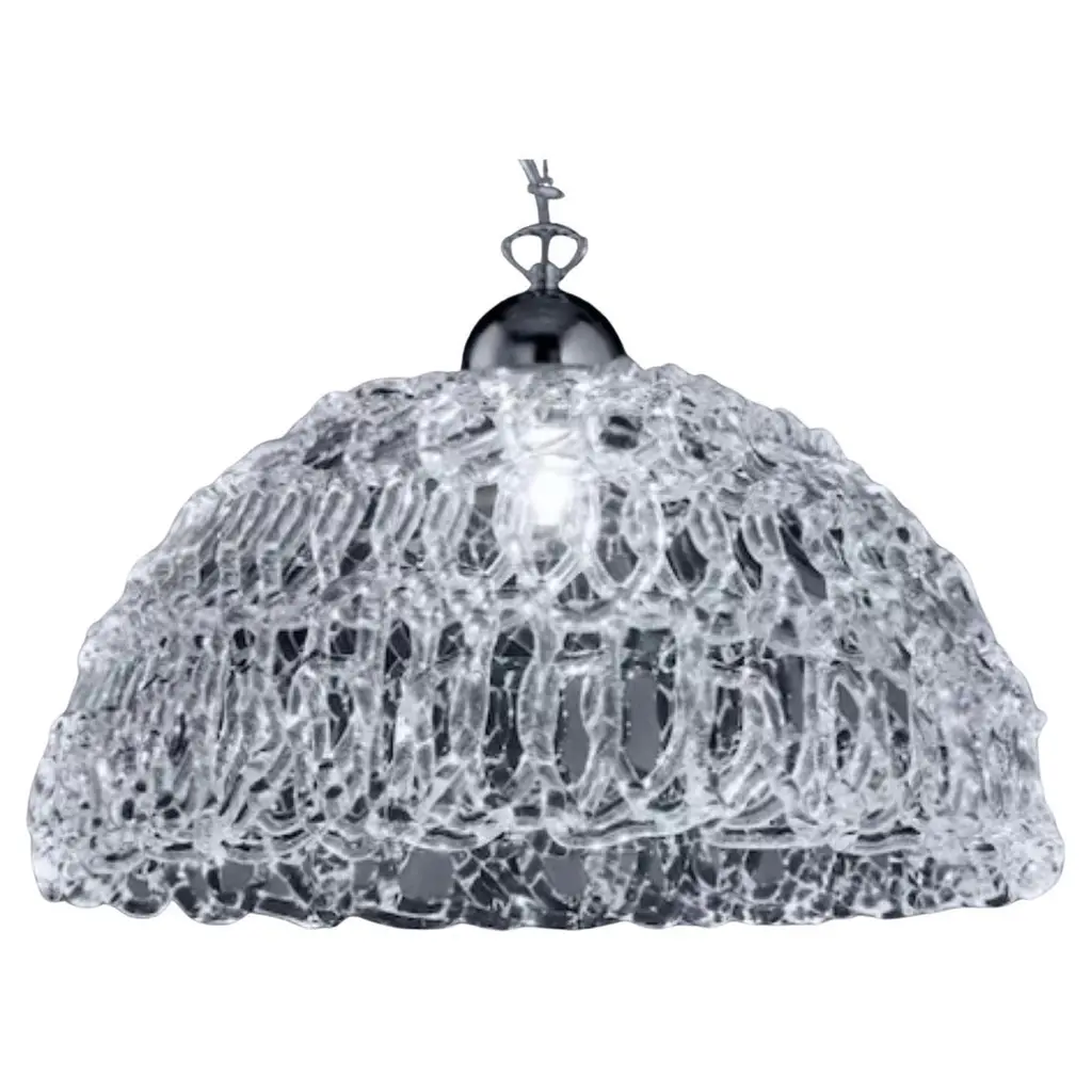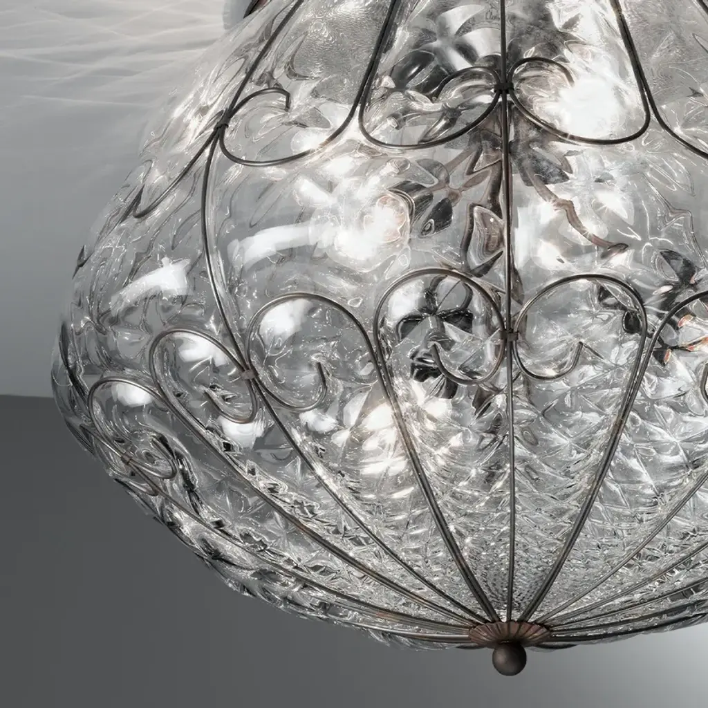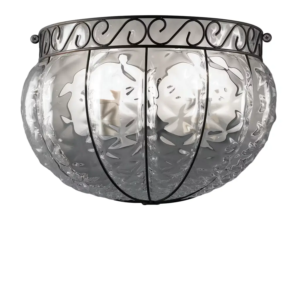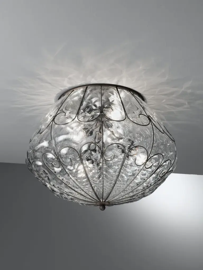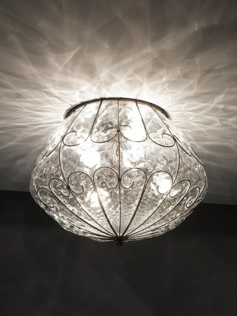 Murano glass ceiling lamp.A rounded shape with a composition of neatly welded curls shaped with a diameter-2 wire for a less intrusive result. The blown glass is moulded according to their form.