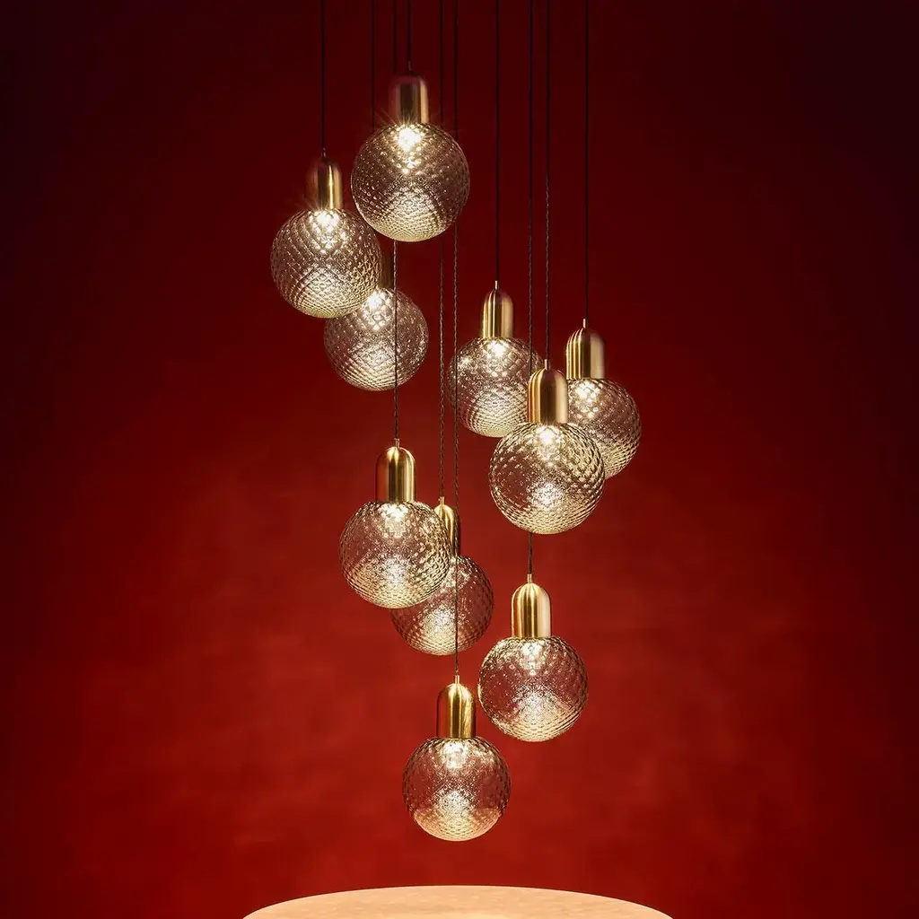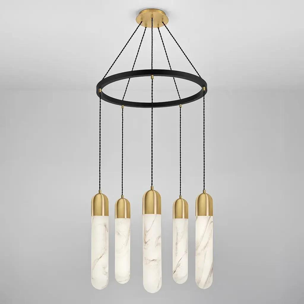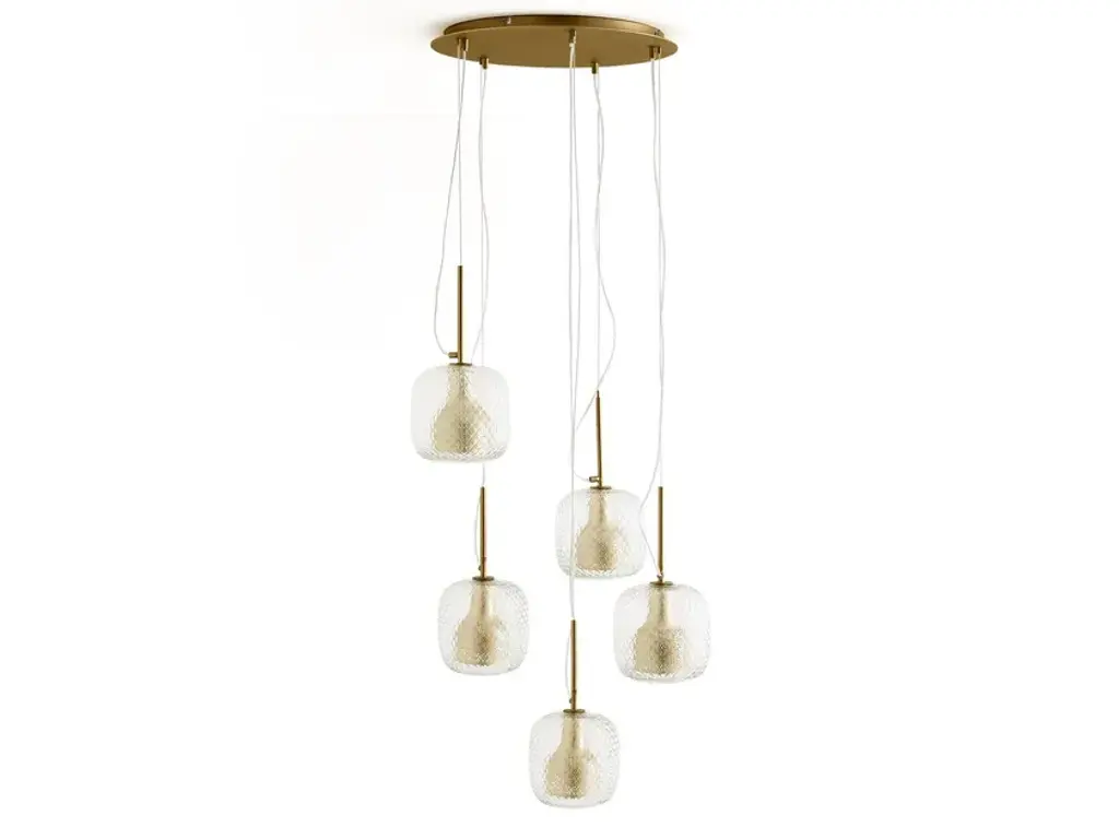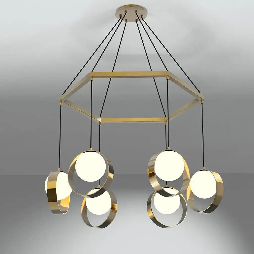 Cables Suspend From Ceiling Plate And Pass Through Floating Square Section Circle From Which Decorative Pendants Hang. Priced With And Comes Complete With Lamps As Shown.