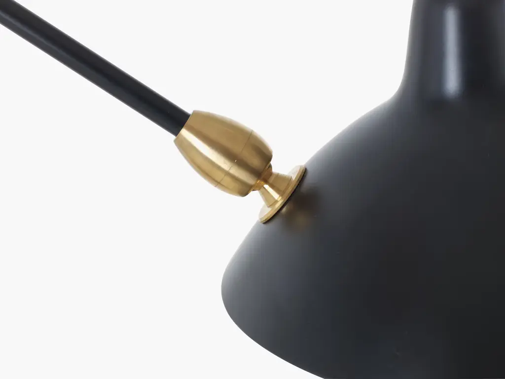 Serge Mouille's Three-Arm Ceiling Lamp (1958) a hanging interpretation of the French designer's Three-Arm Floor Lamp, retains the latter's kinetic, sculptural aesthetic. All the Mouille hallmarks are here: the sensual form of the reflectors, the masterful metalwork, the refined lines of the steel tubing, and the washer and six-sided screw hardware. Bulbs (not included): E26 base, 60W max. Made in France.