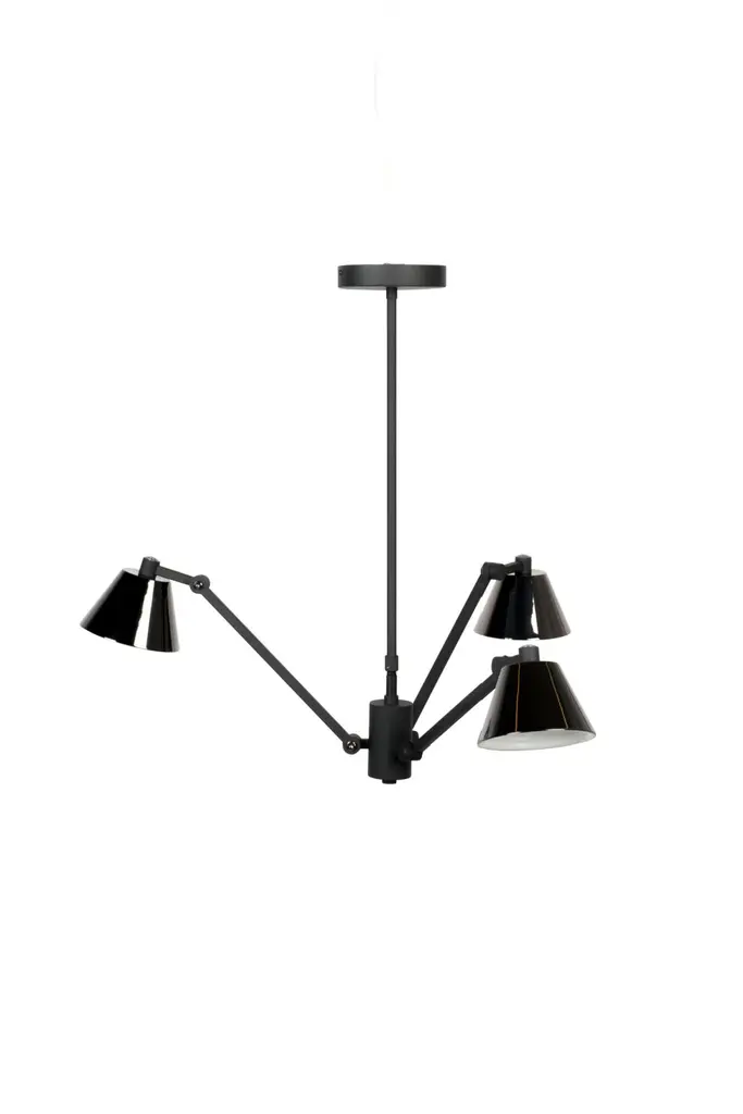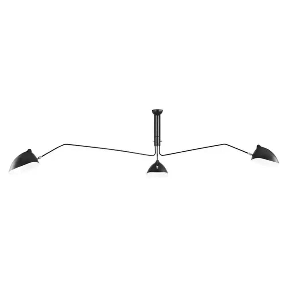 The Serge Mouille Contemporary Pendant Lamp is inspired by popular classics from the mid-century period of design. The arms end in brass ball joints with reflectors. The shades have a distinctive appearance crafted in aluminum. Each arm on the Astrom three arm ceiling lamp is separate but the three meet into a single column where it connects to the ceiling.
