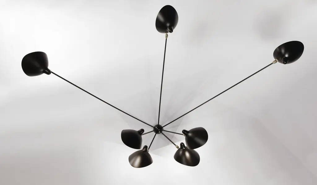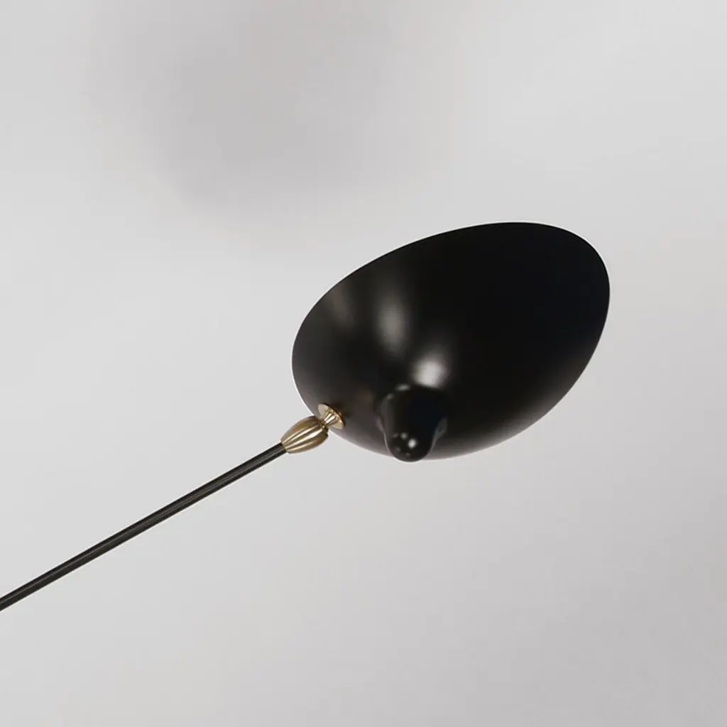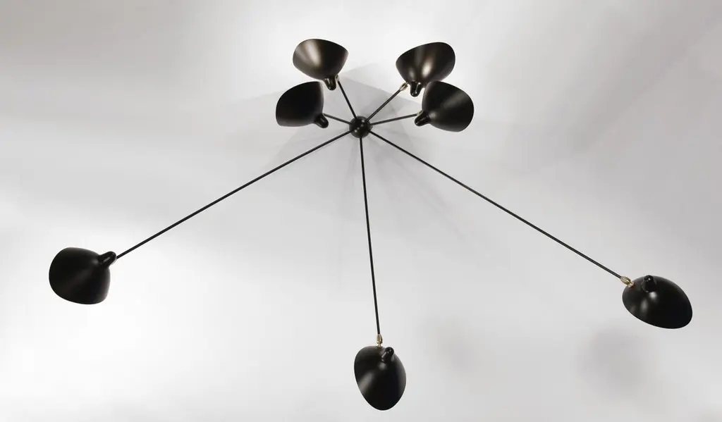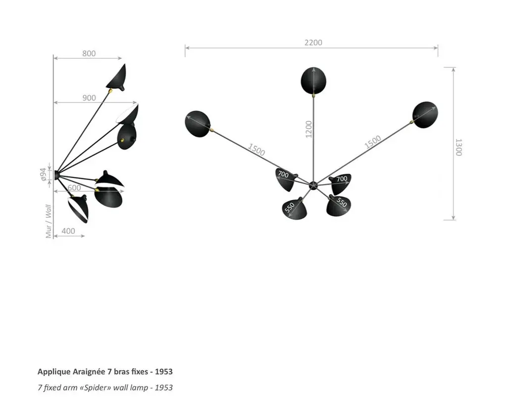 Wall ceiling lamp model 'Seven Fixed Arms Spider Wall Lamp' designed by Serge Mouille in 1953.Manufactured by Editions Serge Mouille in France. The production of lamps, wall lights and floor lamps are manufactured using craftsman’s techniques with the same materials and techniques as the first models.Each lamp has a personal serial number and a specific "Certificate of Authenticity" when delivered. Materials and color:Body : steel swivel : brass reflector : aluminiumBlack lacquered - always glossy white inside the lamp shadesThis model is also available in white.Dimensions:H 51.18 in. x W 86.61 in. x D 35.43 in.H 130 cm x W 220 cm x D 90 cmTechnical details:CE : 7x42W max - E27 - 230V - 50HzUS : 7x60W max - E26 - 120V - 60HzIndoor use and dry locations only.Serge Mouille (24 December 1922-1988) was a French Industrial designer and goldsmith. He is best known for his light fixture designs. After having worked a few years in the workshop of Gabriel Lacroix, he opened his own workshop in 1945 with the intention of creating silverware utensils.In 1953 he began researching and designing light fixtures. During this period he was also supervising the gold smithing department at l'École des Arts Appliqués. In 1955 he was inducted into the Société des Artistes Décorateurs ("the Interior Decorators' Society").The following year, Steph Simon opened a design gallery at 145 Bd St Germain in Paris. Displaying the work of Charlotte Perriand and Jean Prouvé, the gallery soon also featured the work of Serge Mouille, Isamu Noguchi and Jean Luce. The designs of these artists soon become more widely known thanks to orders placed by institutions such as, Cité universitaire d’Antony, University of Strasbourg, University of Aix-Marseille and Centre d’essais en vol de Brétigny. Serge Mouille suffered from tuberculosis for many years and in 1959 he was forced to suspend his design activities and undergo treatment. In 1961, thanks to the Société de Création des Modèles, he was able to exhibit his latest light fixture designs at the trade show Salon des arts ménagers. These designs combined the concepts of fluorescence and incandescence. Production of his light fixtures stopped definitively in 1961.Serge Mouille remains famous primarily for his Minimalistic designs and use of uniformly black painted metal materials. His wall-mounted spot light fixture with articulated arms is typical for his discrete, yet highly functional designs.Current production delay is aprox. 45 - 48 weeks.