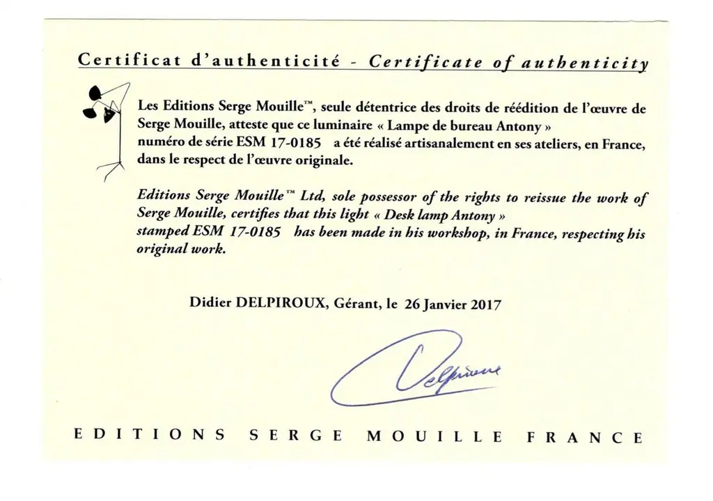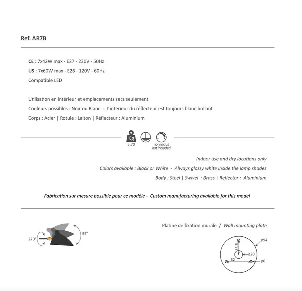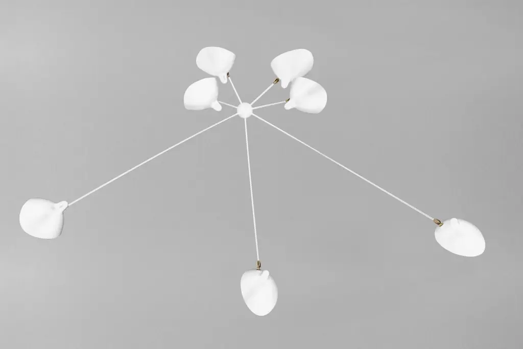 Wall ceiling lamp model 'Seven Fixed Arms Spider Wall Lamp' designed by Serge Mouille in 1953.Manufactured by Editions Serge Mouille in France. The production of lamps, wall lights and floor lamps are manufactured using craftsman’s techniques with the same materials and techniques as the first models.Each lamp has a personal serial number and a specific certificate of authenticity when delivered. The certificate shown on the photo is just an example.Materials and color:Body : steel swivel : brass reflector : aluminiumWhite lacquered - always glossy white inside the lamp shadesThe picture is a digital preview, colors may vary.This model is also available in black.Dimensions:H 51.18 in. x W 86.61 in. x D 35.43 in.H 130 cm x W 220 cm x D 90 cmTechnical details:CE : 7x42W max - E27 - 230V - 50HzUS : 7x60W max - E26 - 120V - 60HzIndoor use and dry locations only.Serge Mouille (24 December 1922-1988) was a French Industrial designer and goldsmith. He is best known for his light fixture designs. After having worked a few years in the workshop of Gabriel Lacroix, he opened his own workshop in 1945 with the intention of creating silverware utensils.In 1953 he began researching and designing light fixtures. During this period he was also supervising the gold smithing department at l'École des Arts Appliqués. In 1955 he was inducted into the Société des Artistes Décorateurs ("the Interior Decorators' Society").The following year, Steph Simon opened a design gallery at 145 Bd St Germain in Paris. Displaying the work of Charlotte Perriand and Jean Prouvé, the gallery soon also featured the work of Serge Mouille, Isamu Noguchi and Jean Luce. The designs of these artists soon become more widely known thanks to orders placed by institutions such as, Cité universitaire d’Antony, University of Strasbourg, University of Aix-Marseille and Centre d’essais en vol de Brétigny. Serge Mouille suffered from tuberculosis for many years and in 1959 he was forced to suspend his design activities and undergo treatment. In 1961, thanks to the Société de Création des Modèles, he was able to exhibit his latest light fixture designs at the trade show Salon des arts ménagers. These designs combined the concepts of fluorescence and incandescence. Production of his light fixtures stopped definitively in 1961.Serge Mouille remains famous primarily for his Minimalistic designs and use of uniformly black painted metal materials. His wall-mounted spot light fixture with articulated arms is typical for his discrete, yet highly functional designs.