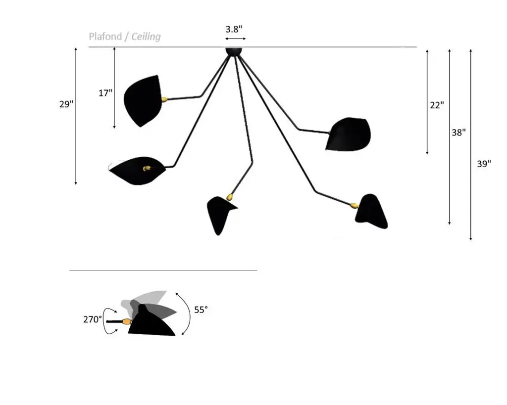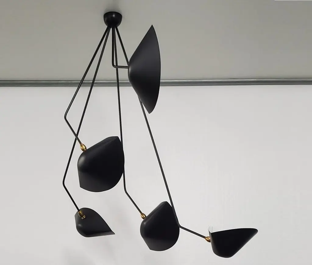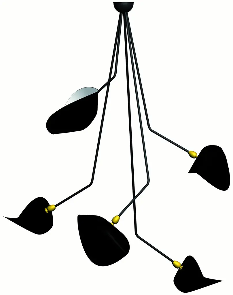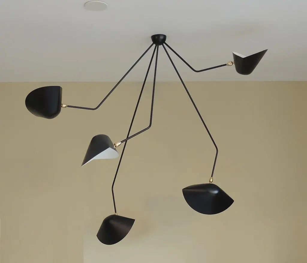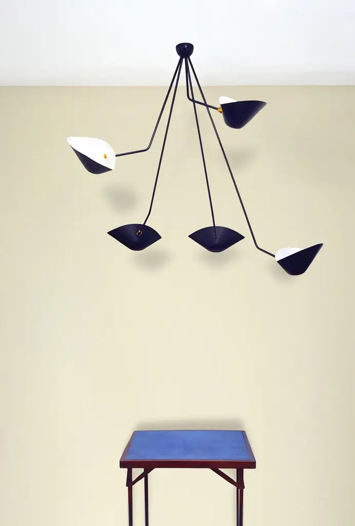 A chandelier as inspired as it is impressive, this new design departs significantly from the original Spider ceiling lamp, with five fixed arms of different lengths dropping from the canopy before flaring out at dramatic angles. Available in black or white, in three layouts:Measures: Height: 39”, width Ø: 62”.Height: 47”, width Ø: 55”.Height: 53”, width Ø: 44”.For shipping purposes, please disregard 1stdibs automatic display of the dimensions.The dimensions of the box are 60x20x13"You are buying a Mouille lamp, a high-end product, here is what to look out for.INTERNATIONAL SHIPPING is expensive, lengthy and somewhat risky, potentially a stressful experience- Expensive: Most Mouille lamps are shipped in very large boxes. Shipping costs are calculated based on the volume of the box, Add this to Customs duties, insurance and US entry fee, and the final price will be approximately 25% more than your final net price.- Lengthy: Your lamp should be shipped by plane which takes about 8 to 9 hours flying from Europe to New York. Transportation is still deeply affected by the pandemic’s disruptions.- Damages: Individual boxes traveling next to heavier bundled goods typical of int’l shipping are more prone to damages. No need to go through all this, we’ve done this part. The lamps are sold from NY, fully inspected, ready to ship to you for your peace of mind. This gives us the confidence to offer a 5-year guarantee to our clients. WHAT SETS US APARTLet’s make the long list short: Technical expertise, Full line of products, Availability, Customization, 5 year warranty, Secured shipment, After sale service, Repairs. And yes, we introduced these lamps to the US, 22 years ago.