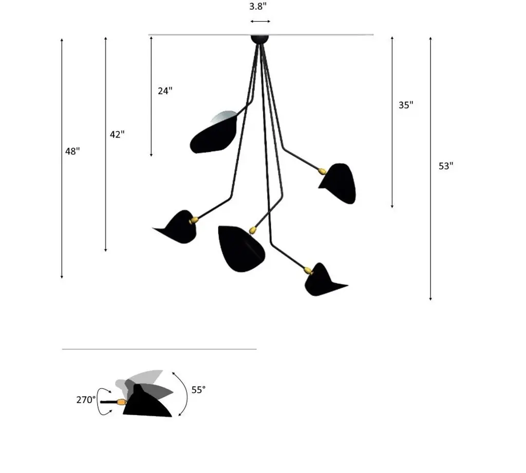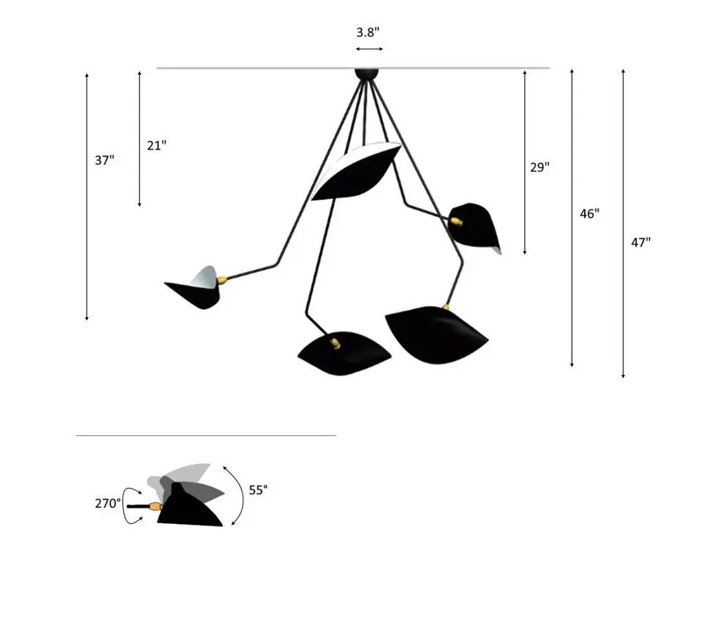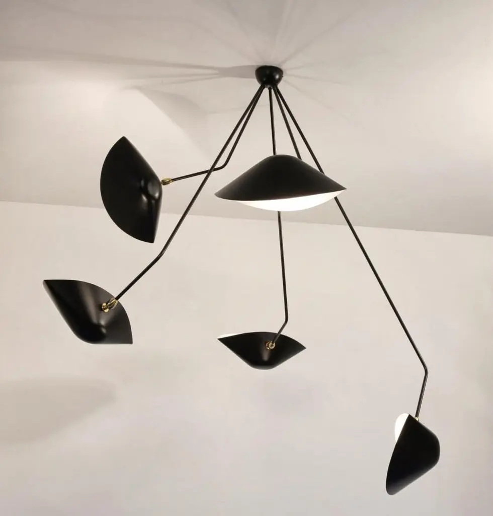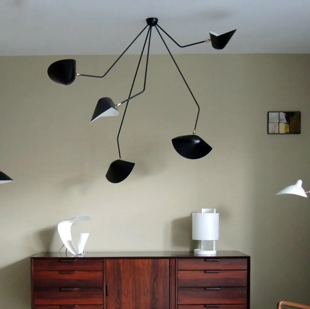 A chandelier as inspired as it is impressive, this new design departs significantly from the original Spider ceiling lamp, with five fixed arms of different lengths dropping from the canopy before flaring out at dramatic angles. Available in black or white, in three layouts:Measures: Height: 39”, width Ø: 62”.Height: 47”, width Ø: 55”.Height: 53”, width Ø: 44”.For shipping purposes, please disregard 1stdibs automatic display of the dimensions.The dimensions of the box are 60x20x13"You are buying a Mouille lamp, a high-end product, here is what to look out for.INTERNATIONAL SHIPPING is expensive, lengthy and somewhat risky, potentially a stressful experience- Expensive: Most Mouille lamps are shipped in very large boxes. Shipping costs are calculated based on the volume of the box, Add this to Customs duties, insurance and US entry fee, and the final price will be approximately 25% more than your final net price.- Lengthy: Your lamp should be shipped by plane which takes about 8 to 9 hours flying from Europe to New York. Transportation is still deeply affected by the pandemic’s disruptions.- Damages: Individual boxes traveling next to heavier bundled goods typical of int’l shipping are more prone to damages. No need to go through all this, we’ve done this part. The lamps are sold from NY, fully inspected, ready to ship to you for your peace of mind. This gives us the confidence to offer a 5-year guarantee to our clients. WHAT SETS US APARTLet’s make the long list short: Technical expertise, Full line of products, Availability, Customization, 5 year warranty, Secured shipment, After sale service, Repairs. And yes, we introduced these lamps to the US, 22 years ago.