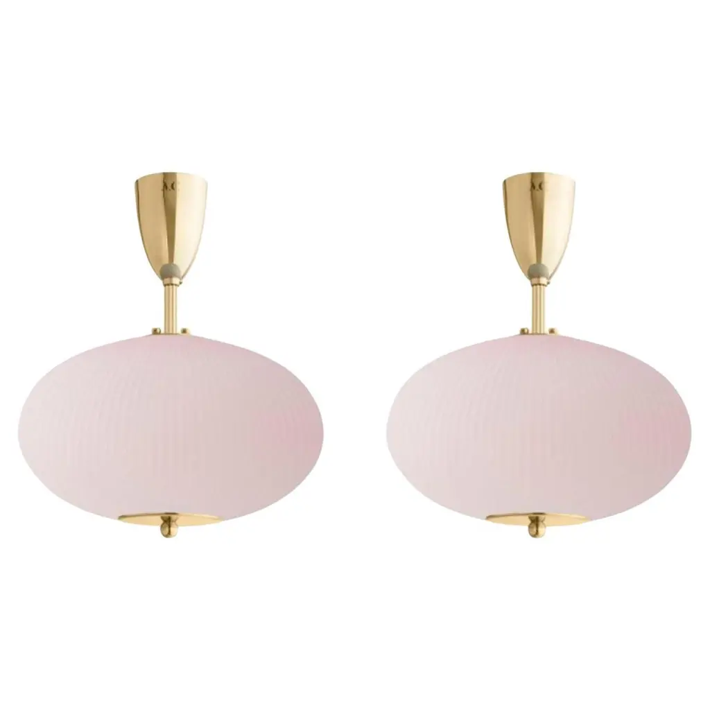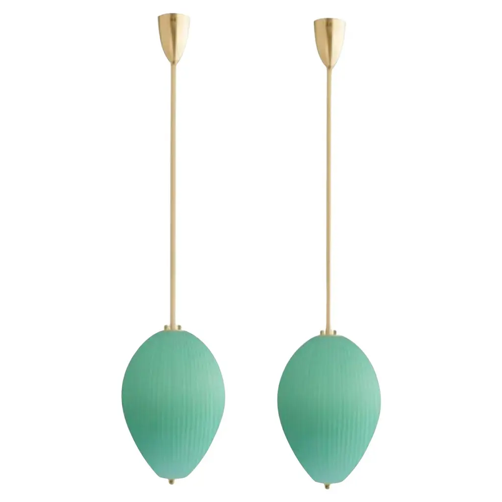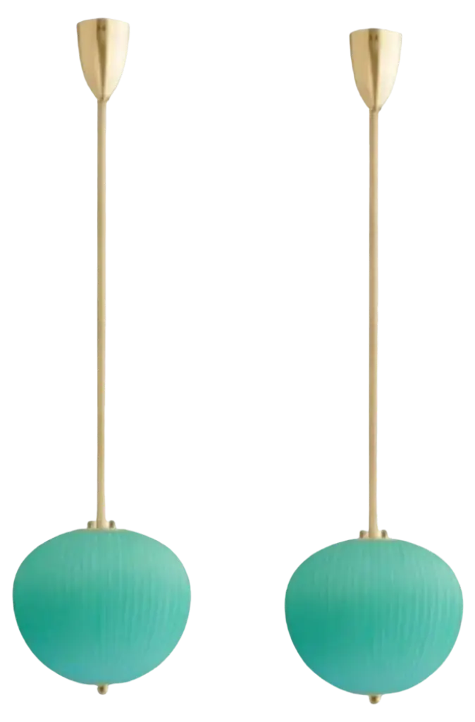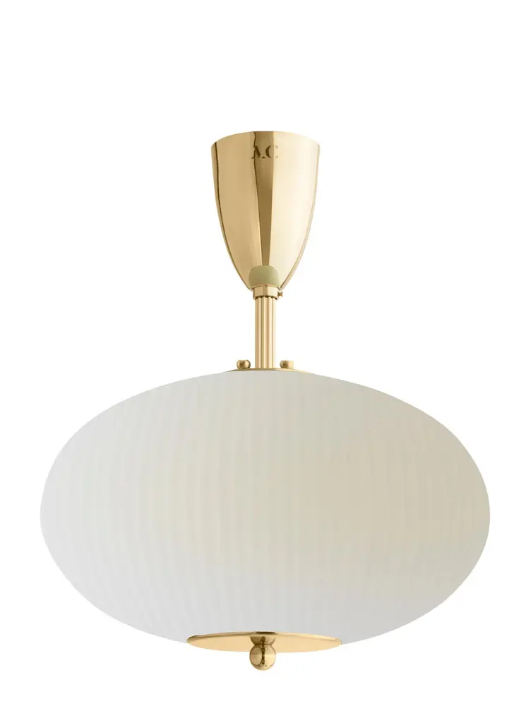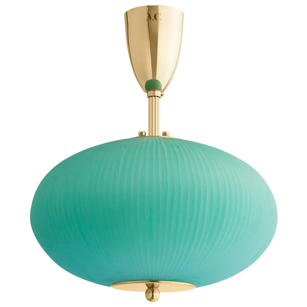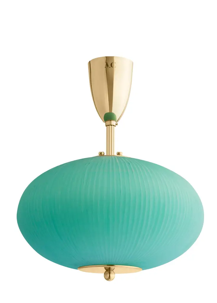 Ceiling lamp China 07 by Magic Circus EditionsDimensions: H 40 x W 32 x D 32 cmMaterials: Brass, mouth blown glass sculpted with a diamond sawColour: jade greenAvailable finishes: Brass, nickelAvailable colours: enamel soft white, soft rose, jade green, mustard yellow, rich grey, opal greyAll our lamps can be wired according to each country. If sold to the USA it will be wired for the USA for instance.Rethinking, reimagining, redesigning familiar objects that we look at every day without ever really seeing them and using light to tell stories, this how Marie-Lise Féry sees her work. Offering a new take on our urban heritage, changing our perspective through her work on scale and usage. Since 2015, Magic Circus Éditions has been setting the world of lighting ablaze, creating airy, playful and magical designs that merge retro with sleek and contemporary. A free-spirited antiquarian, founder Marie-Lise Féry draws inspiration from the world of cabarets and the magic of the circus to give shape to imaginative, fun and playful collections. The air of magic she breathes into her work reveals a wealth of interpretations and widens possibilities for creative interiors. The combination of traditional know-how — outstanding craftsmanship — and her imaginative take on historical, everyday objects lends an unexpected and charming quality to her creations.Féry’s lights are designed just like magic lanterns — precursor to modern-day cinema —, inspiring wonder through oversized, seemingly weightless compositions and understated references. Each collection has its own inspiration: the first models of street lighting for Collection 01; the happy memories of funfairs, sweets and balloons for her latest collection Balloon; the Far East for Collection 02; and the colourful, carefree spirit of the 1970s for Pop-Up, released in 2019. Magic Circus Éditions draws on airy designs, dream-like inspirations, colours and fun to create a sense of enchantment.Magic Circus Éditions founder Marie-Lise Féry was born in Paris. After studyingart business, she moved to New York to start her career. Fascinated by the city’s architecture, she found an endless source of inspiration in the Big Apple’s monumental decors. Returning to France to settle down in Lyon, she opened an antiques gallery named Un Château en Espagne, and started telling her own stories through objects she gleaned on markets all around the country. A way for her to perpetuate her mother’s motto: “Objects with a soul will always belong”. Since 2015, the year she established Magic Circus Éditions, she has moved on to lighting as a new medium for telling her stories, bringing the magic of the show into home interiors. With her love for the circus, turn-of-the-century cabarets and music halls, Marie-Lise Féry’s love of unusual objects has remained strong, but now prefers to focus her attention on pieces she has imagined herself. With a fun and light-spirited approach, she creates a bold visual effect that elicits instant attraction. She collaborates with some of Europe’s greatest artisans, from Prague and Murano to Clermont-Ferrand, working for instance with a Czech company specialising in sculpting glass using a diamond-blade saw, or an auto body shop renowned for their work with lacquers. The refinement of shapes and finishes, bespoke designs and technical excellence all contribute to creating pieces that inspire surprise and wonderment. In the manner of Wes Anderson in Grand Budapest Hotel, blending together elegance, humour and unexpected details, her designs never fail to surprise. Attentive to the effect of her designs both in daylight and at night, Marie-Lise Féry takes us on a journey through space (from outside to inside) and time (from yesterday to today).