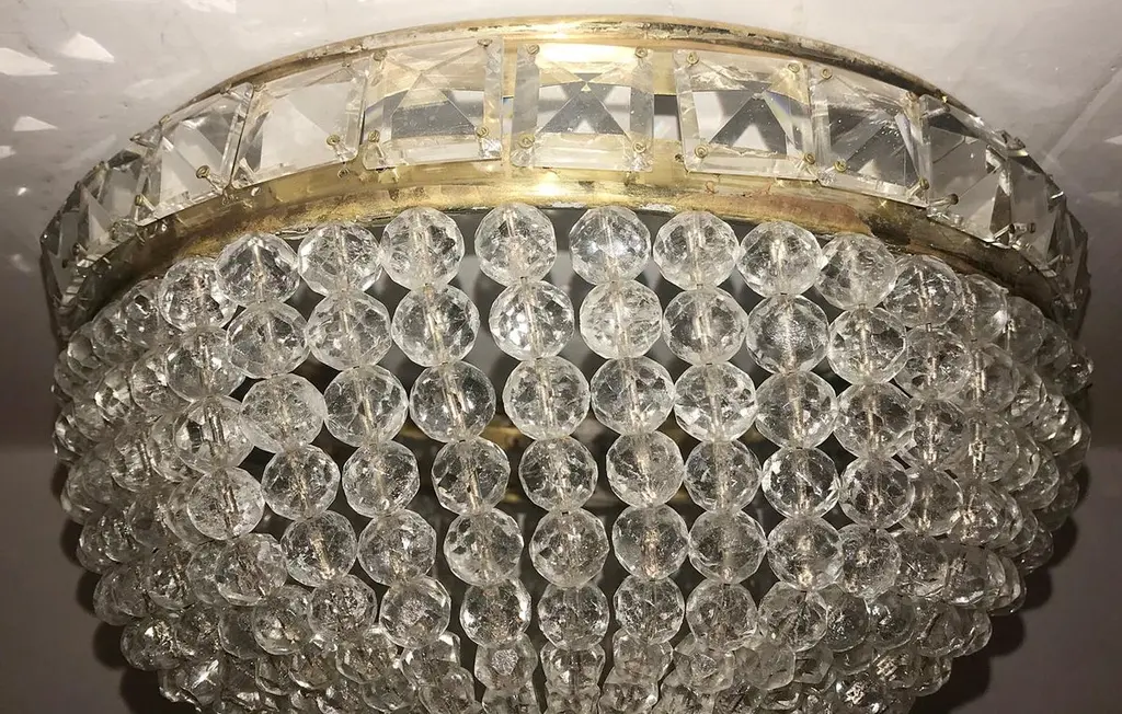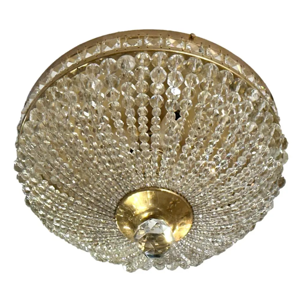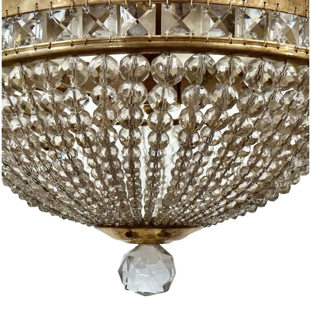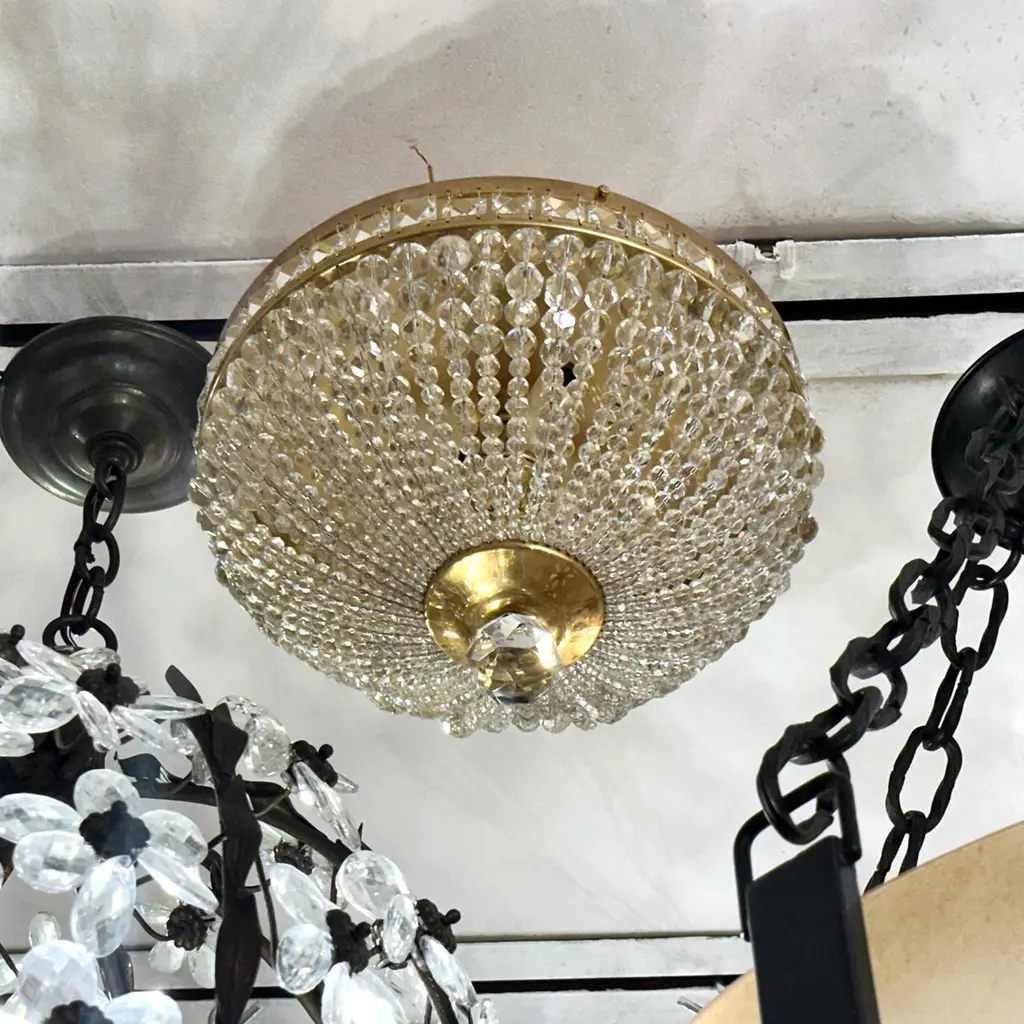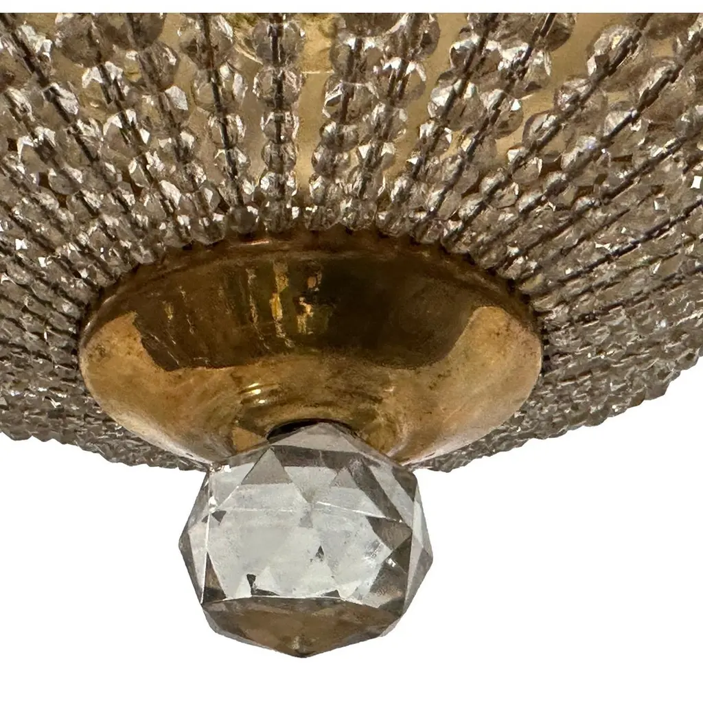 Set of 1950's French gilt metal light fixtures with crystal beads and interior lights. Sold IndividuallyMeasurements:Diameter:13″Height: 8.25″