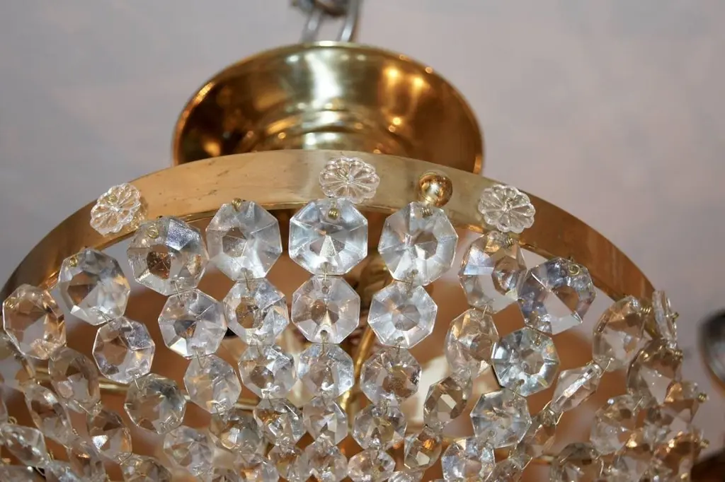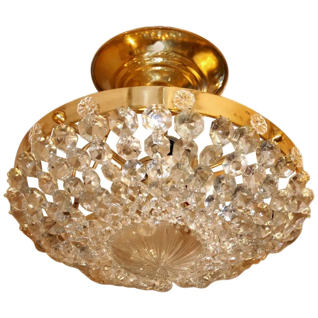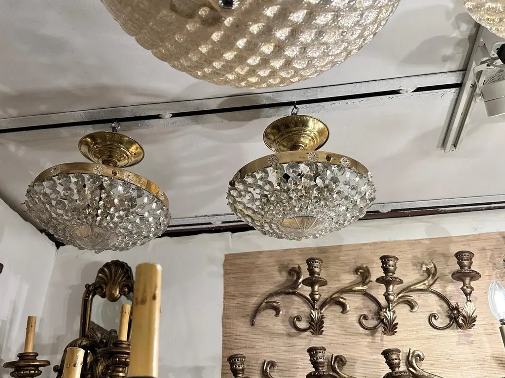 A set of 8 circa 1940s French crystal semi flush-mounted light fixtures with 3 interior lights. Sold individually.Measurements: Drop 9.5"Diameter 11"