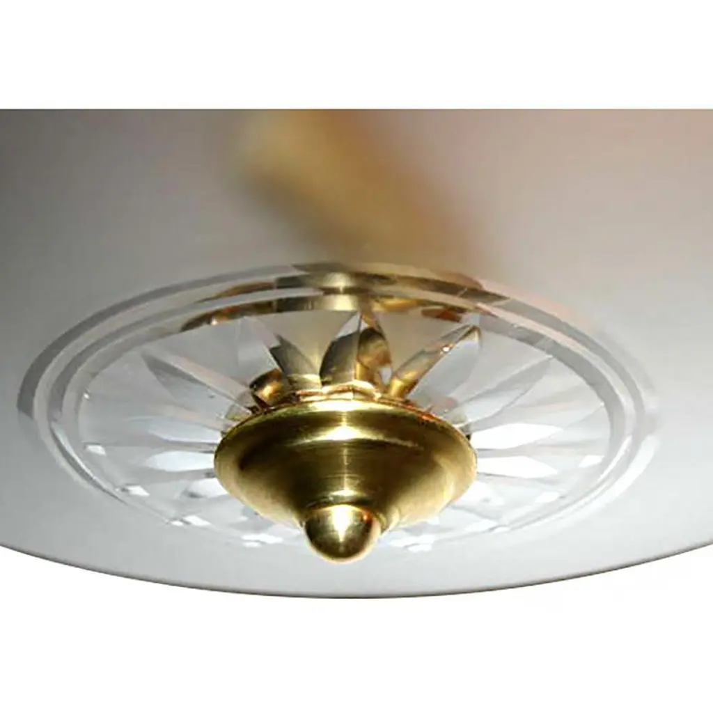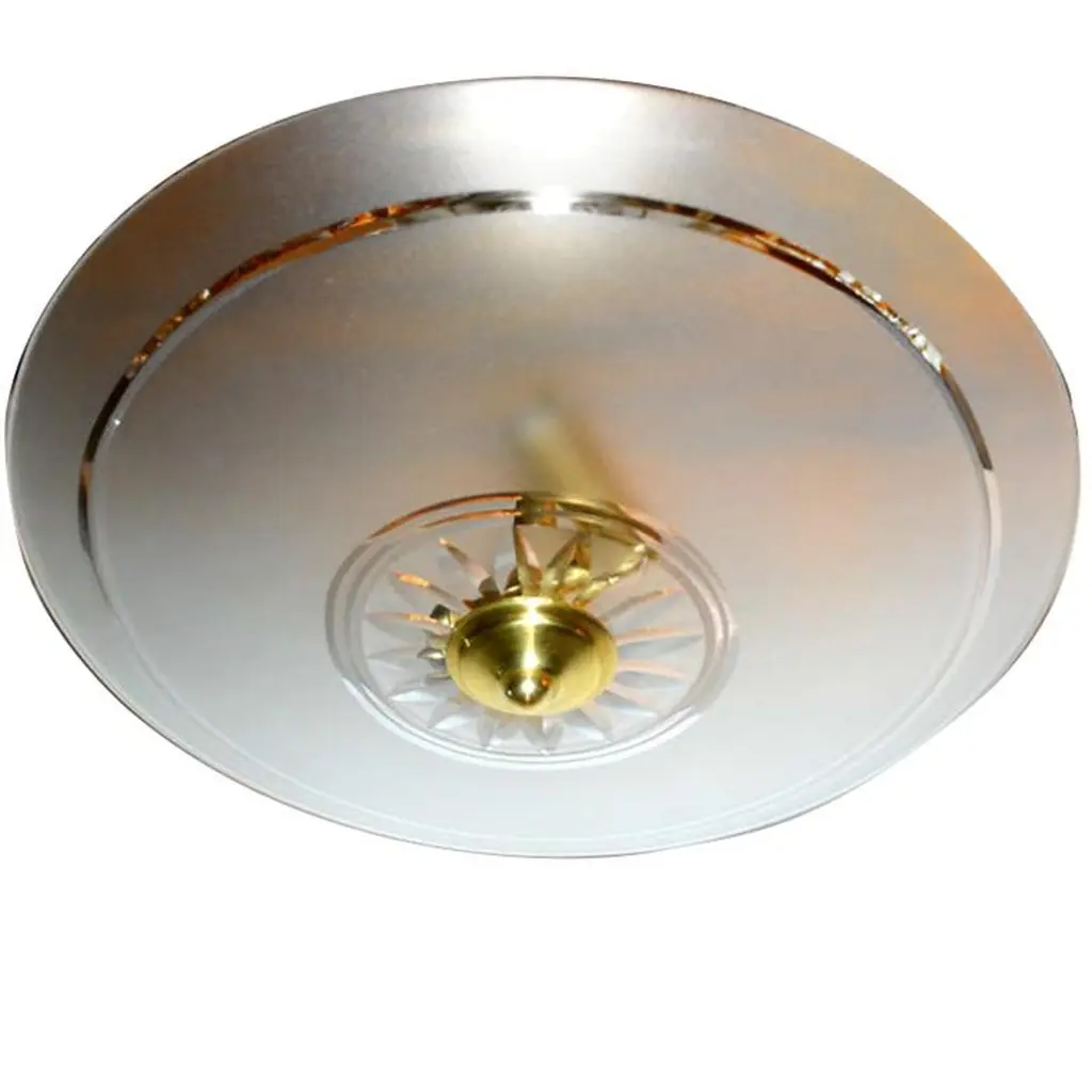 A set of seven circa 1930's French semi-flush mounted pendant light fixture with etched glass body and 3 interior candelabra lights. Sold individually.Measurements:Drop: 7.5"Diameter: 12".