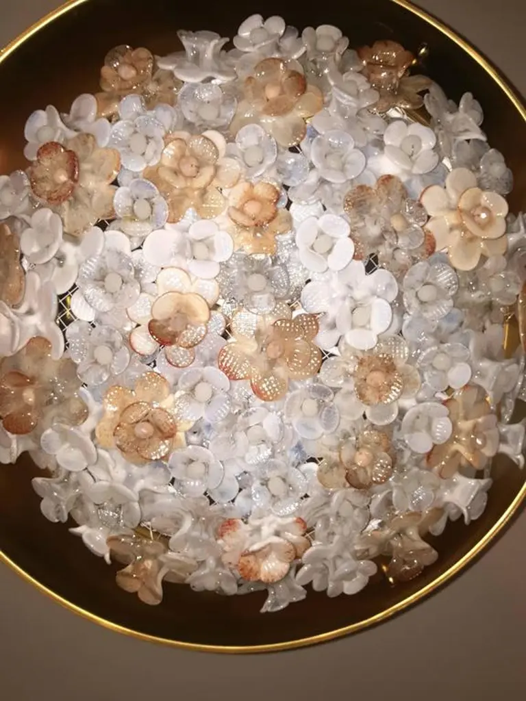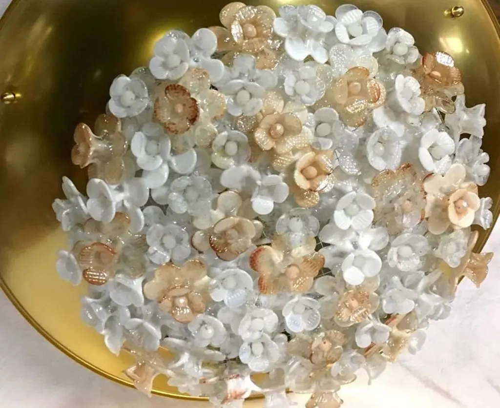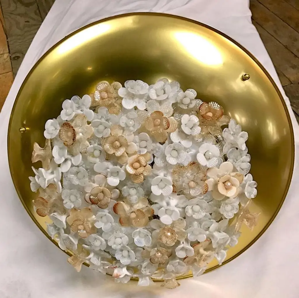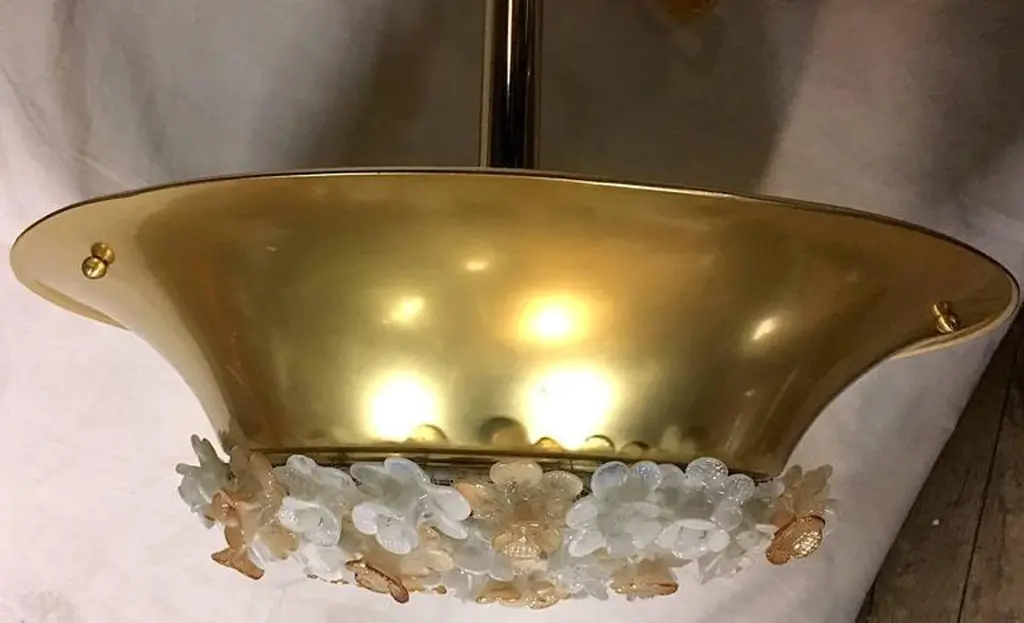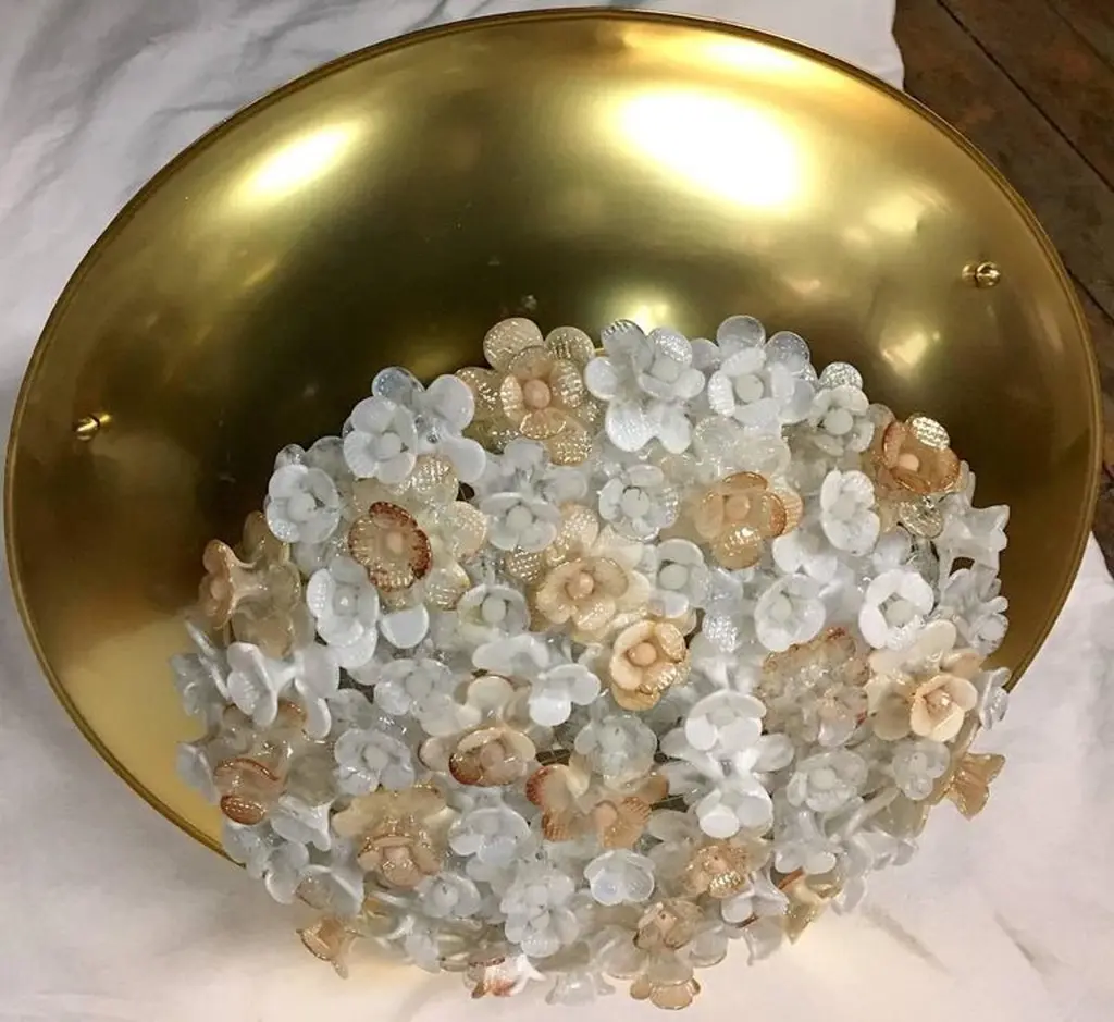 Set of four Italian gilt light fixtures with Murano glass flowers insets. Four interior lights. Measurements:18.25" diameter16" present drop.