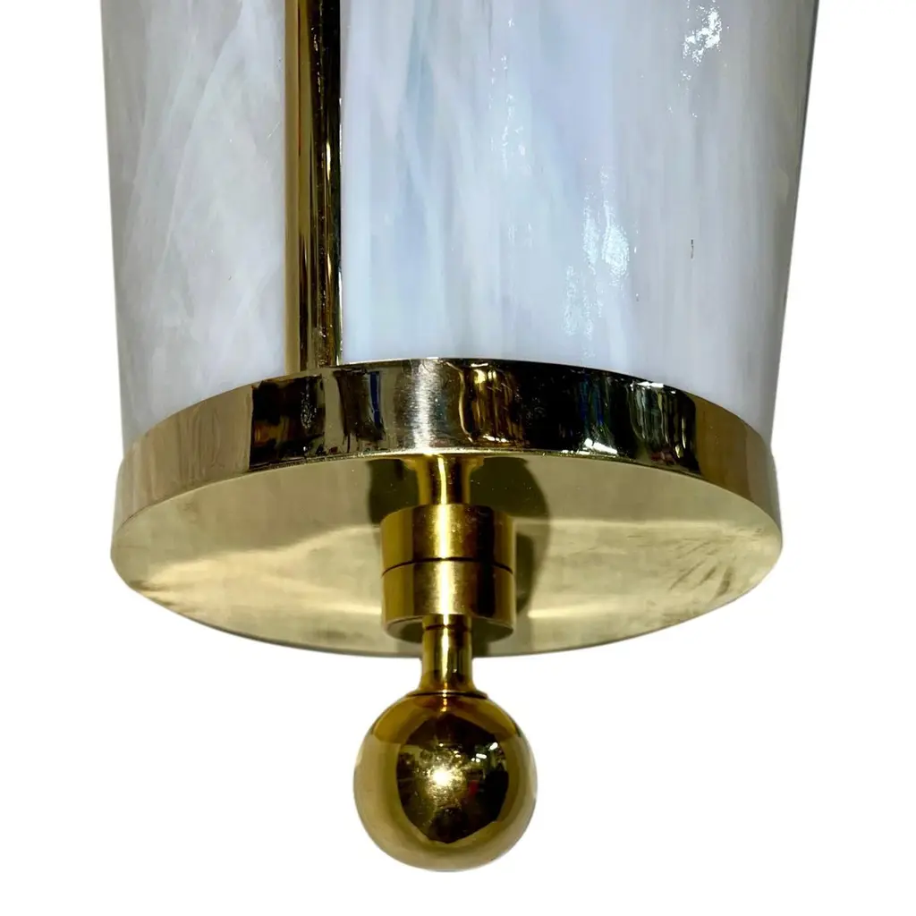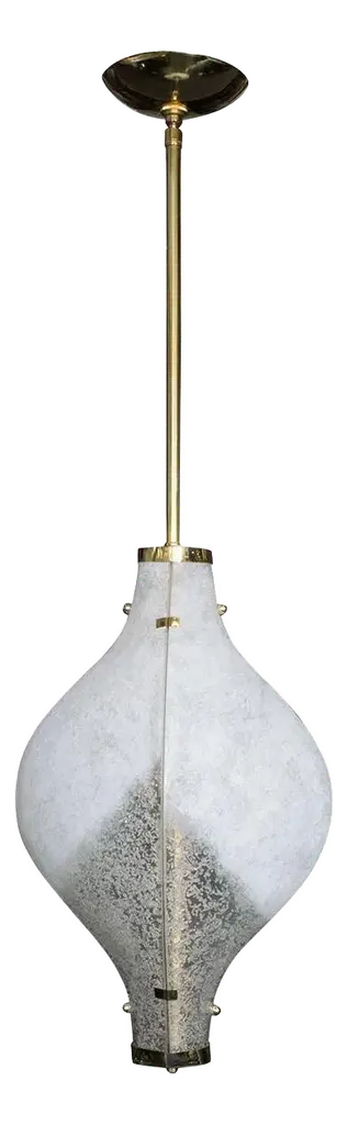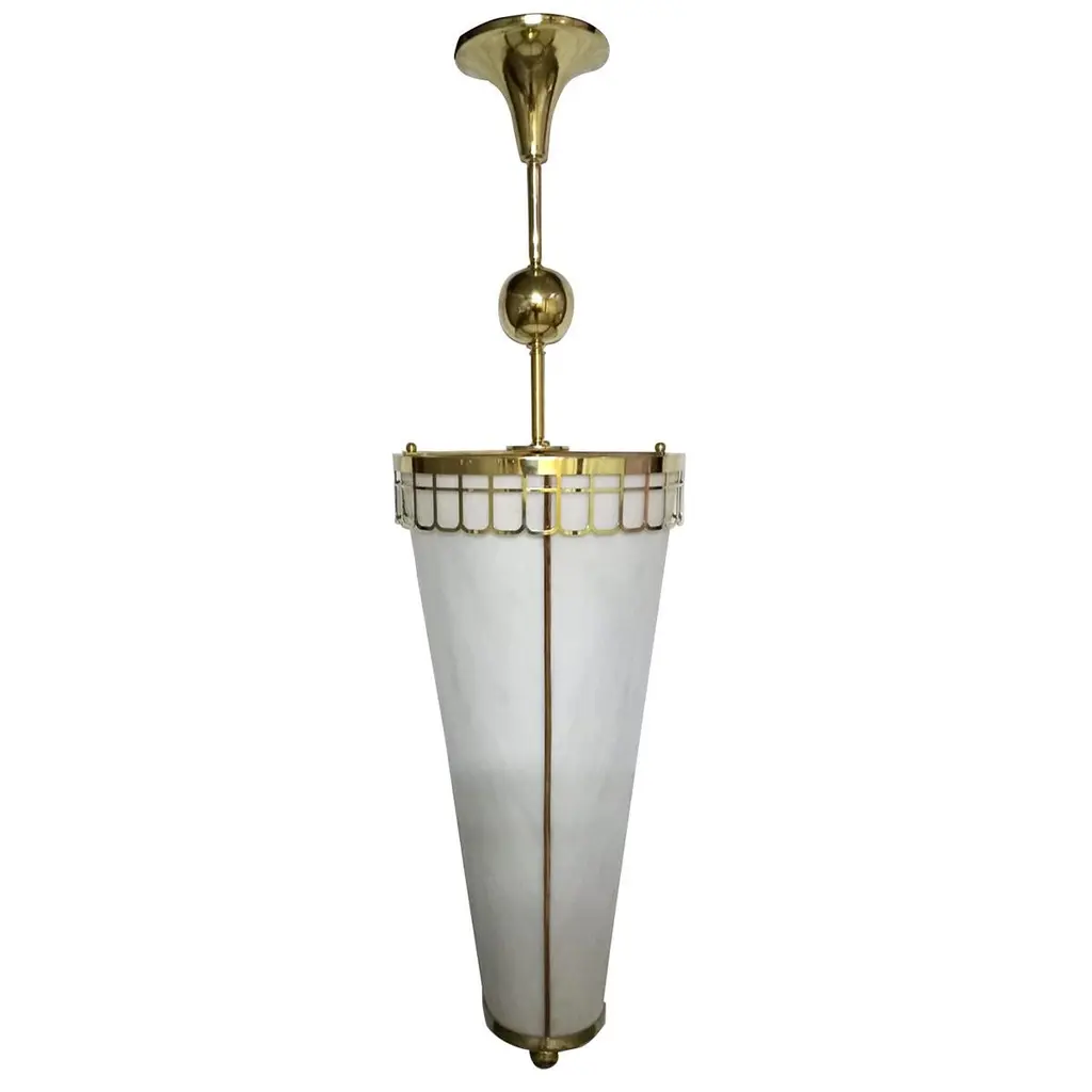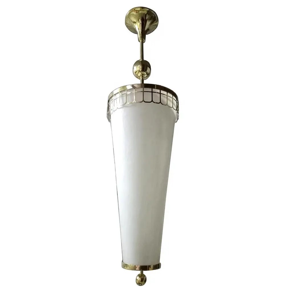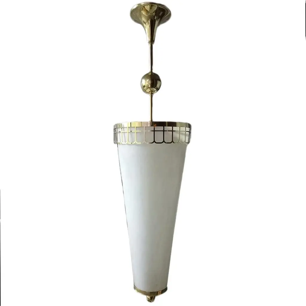 A set of six French circa 1950's milk glass pendant light fixtures with bronze body and fittings. Sold individually.Measurements:Height of body: 32"Drop: Current drop: 50"Diameter: 14".