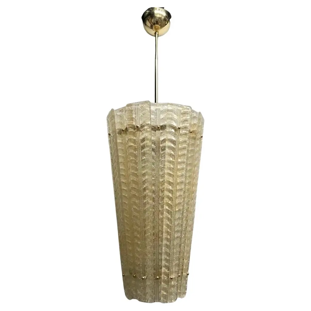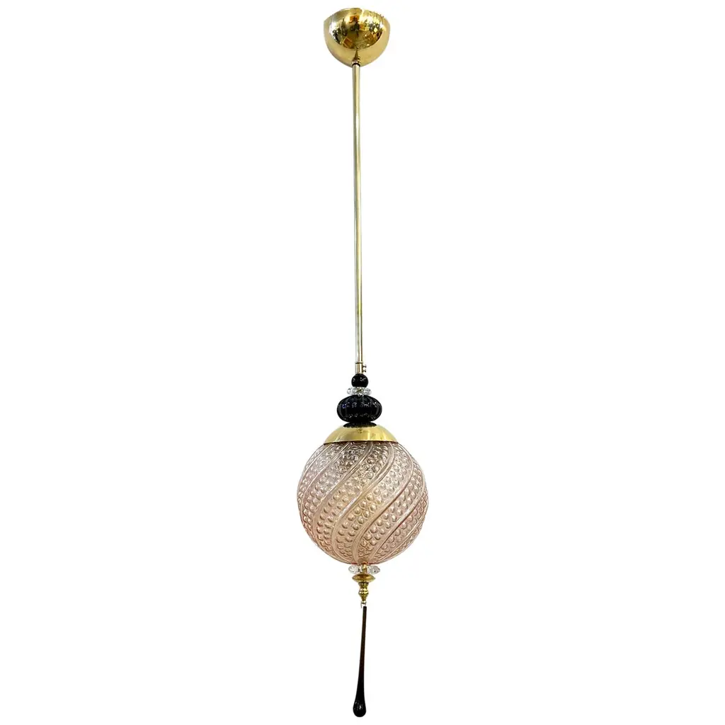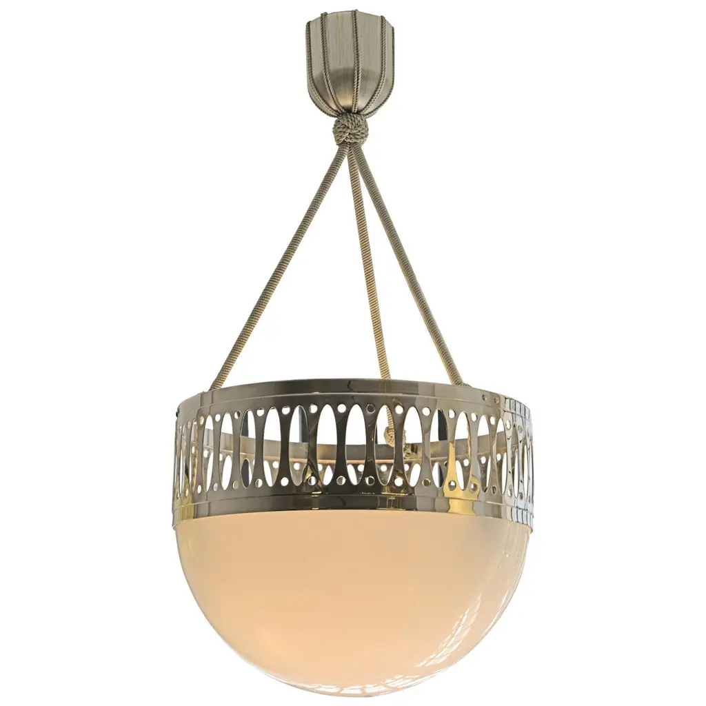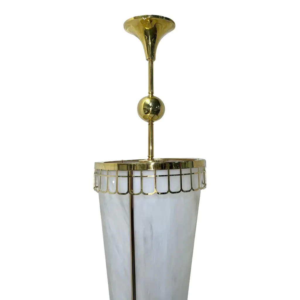 A set of six French circa 1950's milk glass pendant light fixtures with bronze body and fittings. Sold individually.Measurements:Height of body: 32"Drop: Current drop: 50"Diameter: 14".