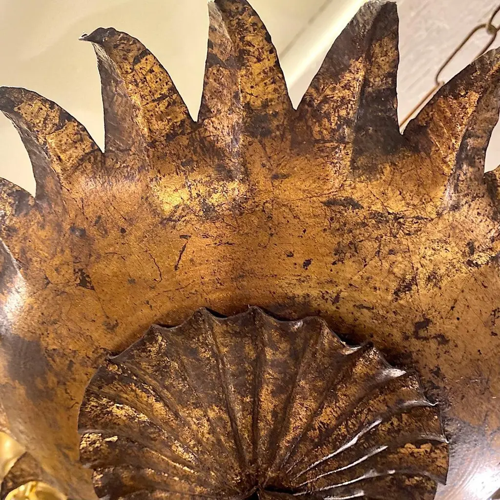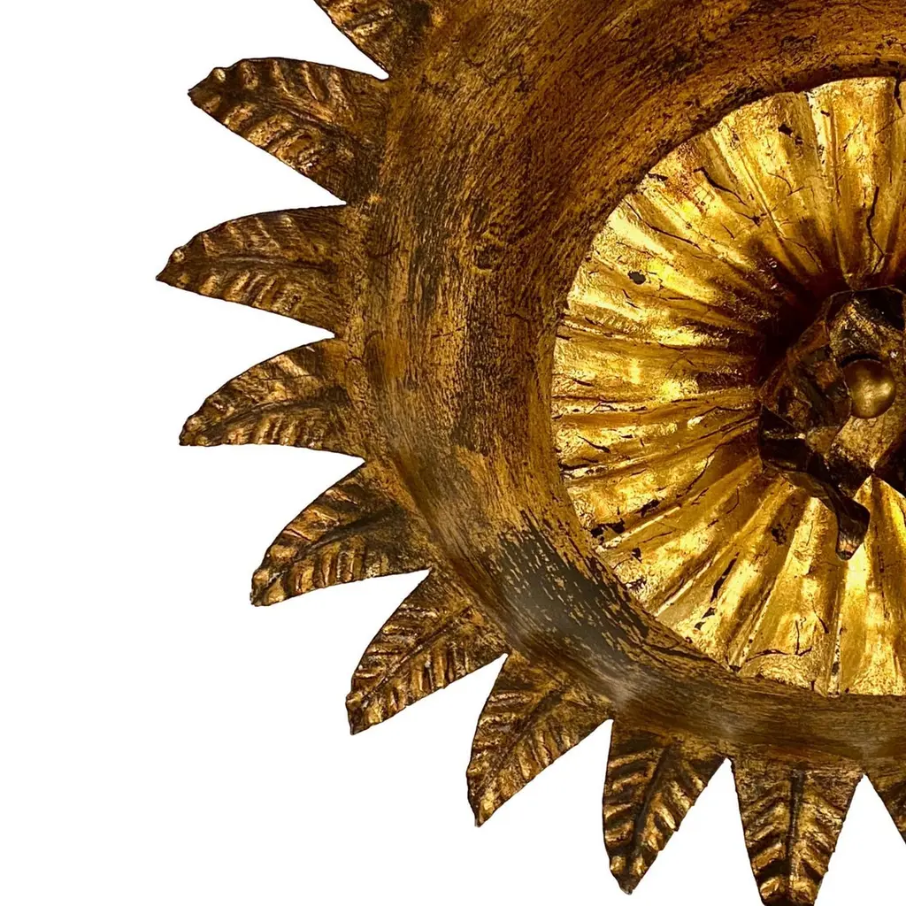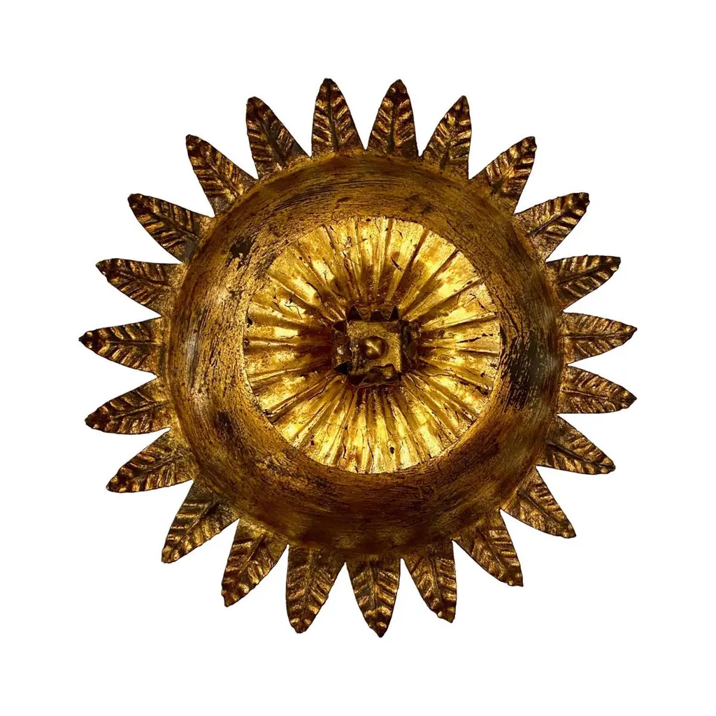Set of six Italian circa 1940's gilt metal sunburst shaped light fixtures with two interior lights, original finish and patina. Sold individually.Measurements:Depth: 11"Diameter: 13"