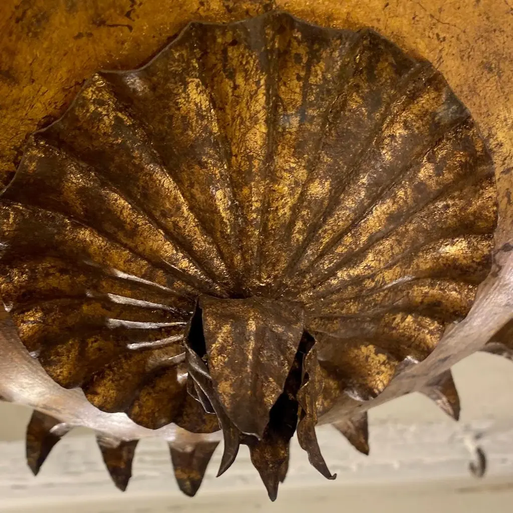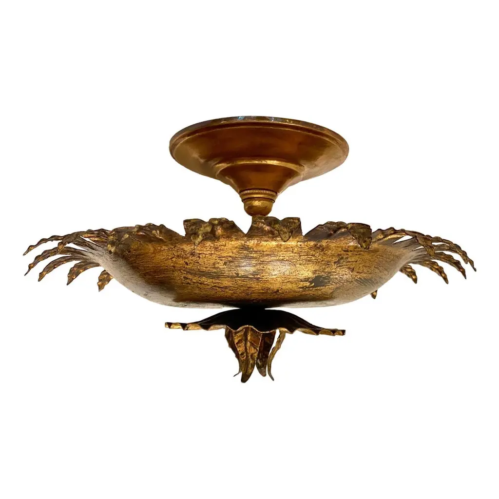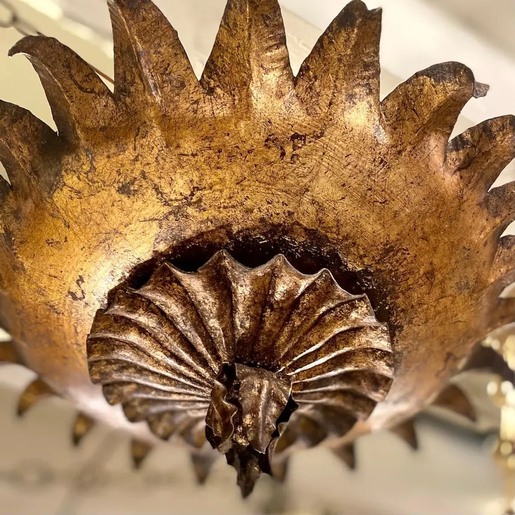 Set of six Italian circa 1940's gilt metal sunburst shaped light fixtures with two interior lights, original finish and patina. Sold individually.Measurements:Depth: 11"Diameter: 13"