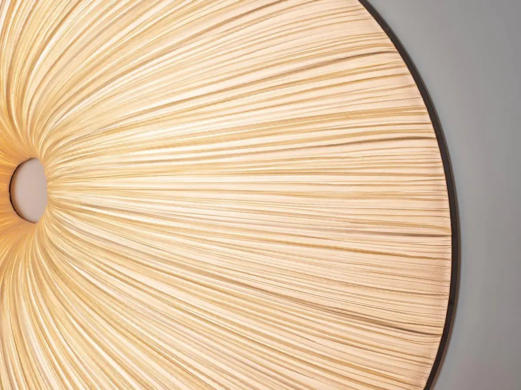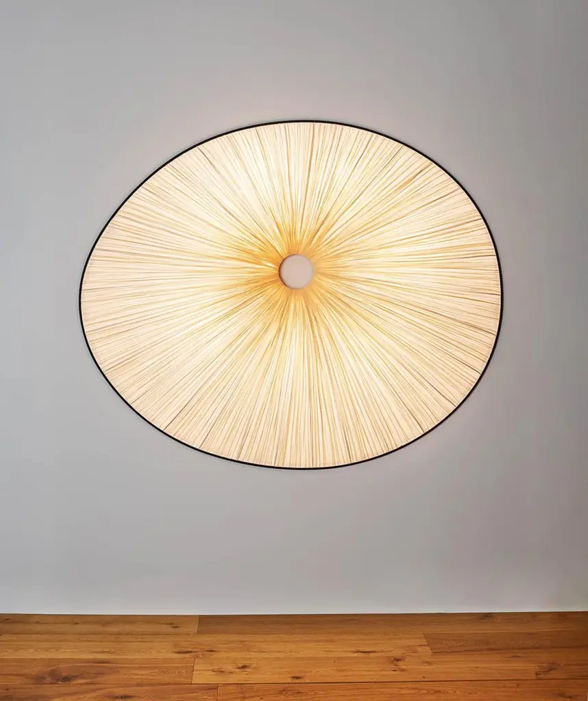 The Sahara wall fixture has a rounded sculptural form that casts a halo of light across the ceiling or wall it is mounted on to dramatic effect. It is part of the Orchestra Family, inspired by natural musical forms as well as modern sculpture and architecture. It is available as a floor lamp as well.