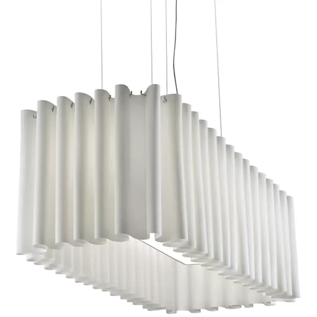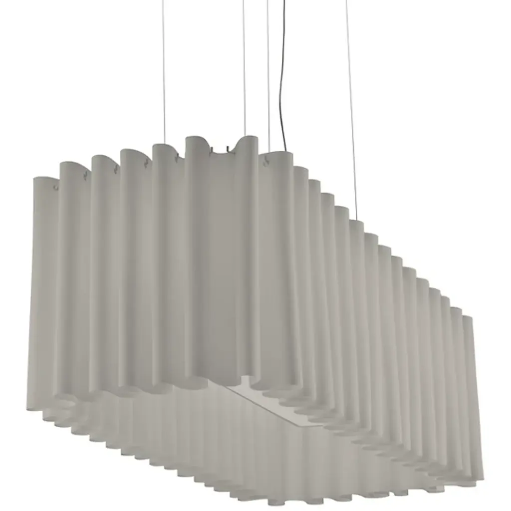Fabulously fashionable and flirtatious lighting for large, lengthy spaces. The Lightecture Skirt Linear Suspension is nearly five feet long and two feet wide, covered entirely in a ruffled, curtain-style shade. Available in three colors, the specialty TREVIRA CS fabric softens even further the light coming through the inner fabric diffuser.