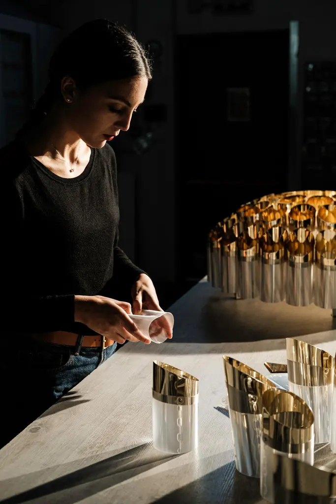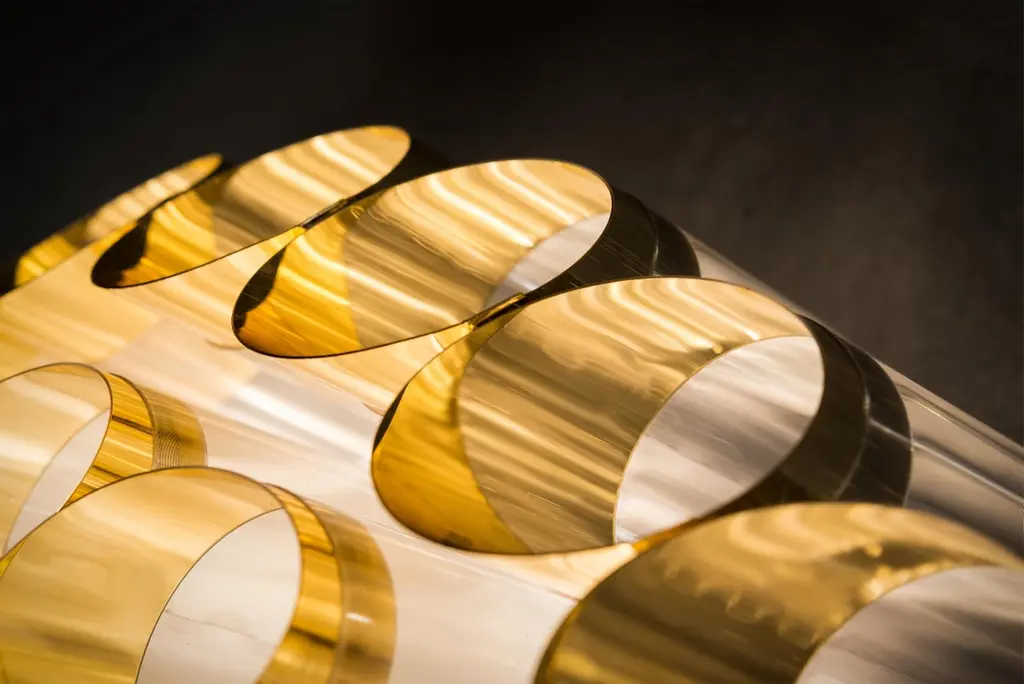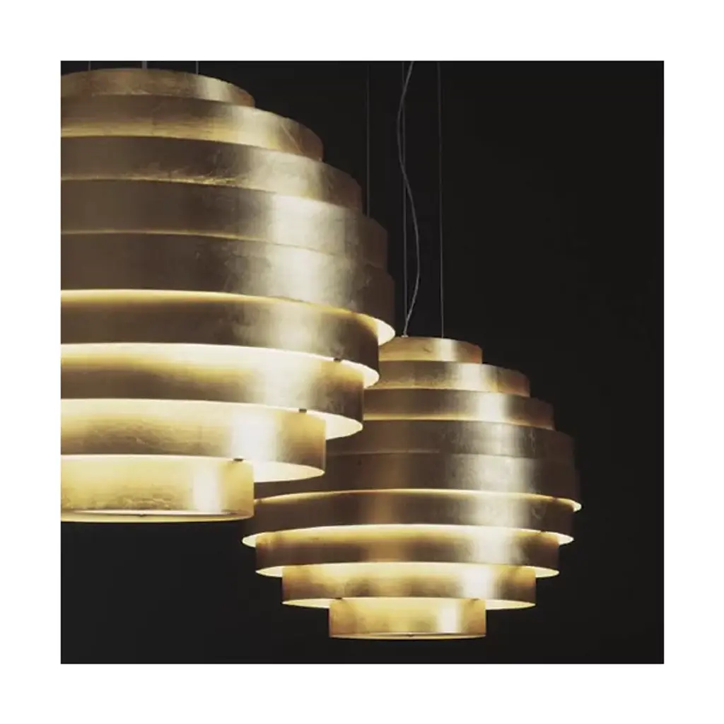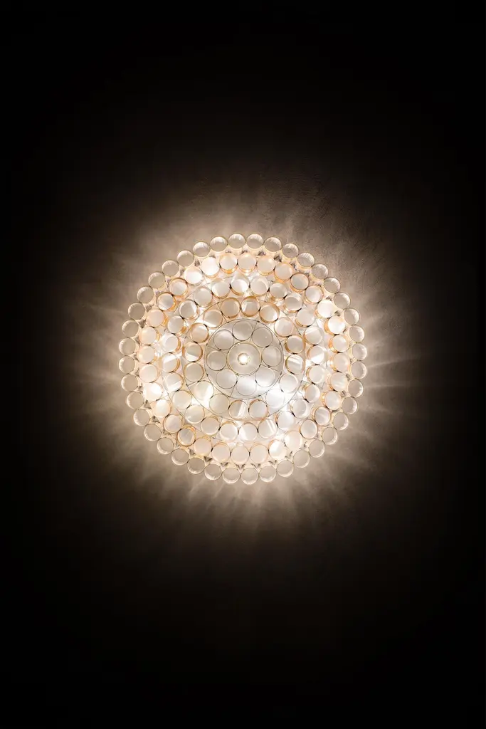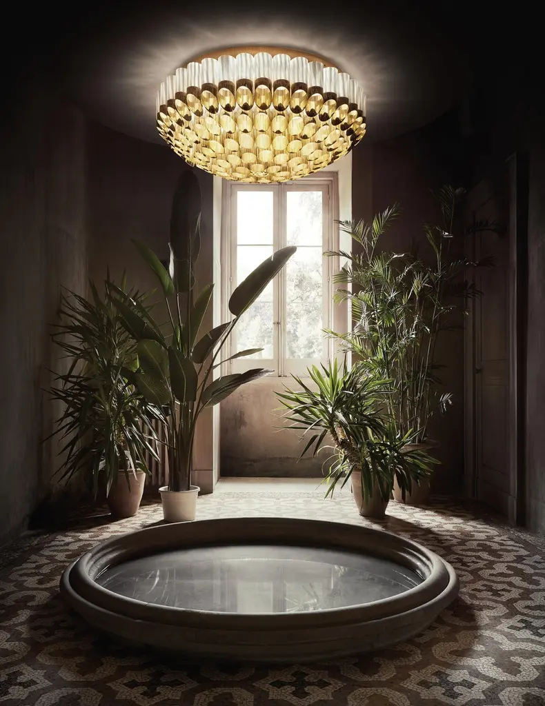 This dramatic ceiling lamp takes its name from the Greek term Ode???, a place destined for musical performances. Artist Lorenza Bozzoli captures the splendor of Art Deco’s opulent architecture, lying in sharp contrast to the somber style of the post war style. Odeon pays homage to the theatre, the dramatic arts, and joie de vivre, and is available in two sizes, with a diameter of 65 or 100 cm, with concentric crowns of coupled metallic Goldflex and Lentiflex, a glasslike, rippling technopolymer. The lamp is shipped fully assembled in protective wood packaging, and is easily installed. The bulbs can be replaced autonomously.Size: Ø102 x h. 42 cmColors: GoldMaterials: Lentiflex®, Lentiflex® with cold foilLighting: 12 x 12W + 1 x 6,5W Spot Led PAR 38 (Ø12,2 cm x h.13 cm)Weight: kg 15Dimmerabile: dimmable bulbs needed, depending on wall dimmer
