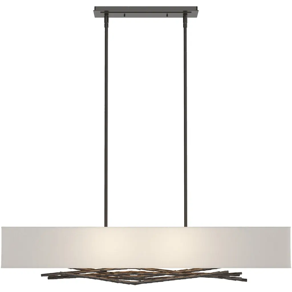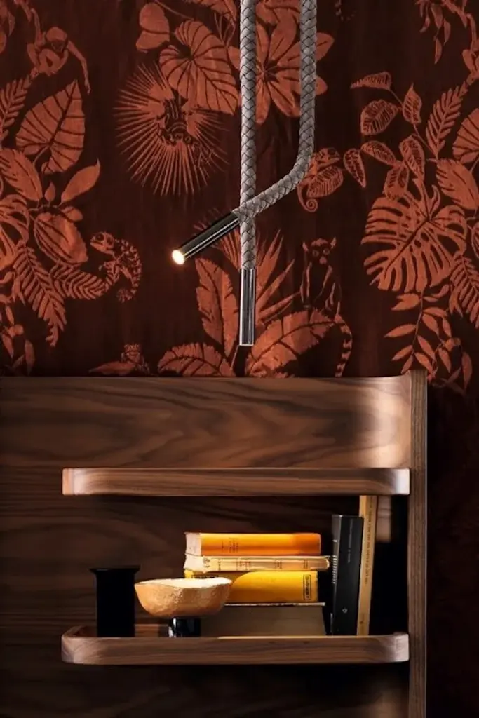 Drop lamp from the SNAKE collection with metal frame covered in hand-woven dove-coloured leather, with adjustable finial.Lighting series with metal internal frame upholstered in hand-woven dove grey leather. The shade is produced using one of the sampler fabrics.