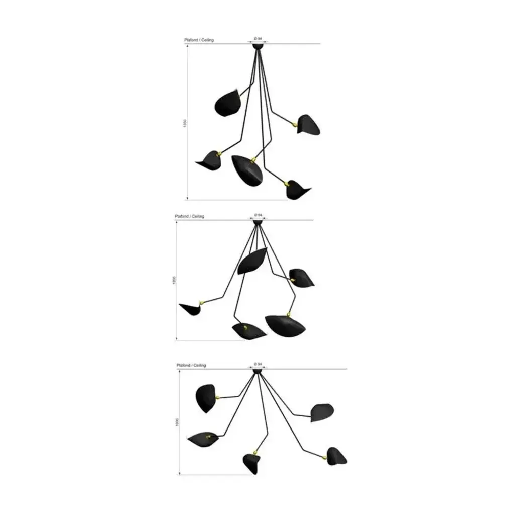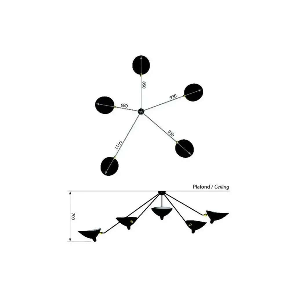 Ceiling lamp spider 5 broken arms by serge mouille dimensions: d150 x h135 cm materials: brass, steel, aluminium one of a king. Numbered. Also available in different colour. All our lamps can be wired according to each country. If sold to the usa it will be wired for the usa for instance. Available in three sizes, this spider ceiling lamp with 5 fixed curved arms serge mouille is a reissue of a 1954 luminaire made with the same integrity as the original models. Made in france, it has 5 curved arms in black steel, each supporting an adjustable aluminum reflector with a glossy white interior. Delivered quickly, numbered and accompanied by its certificate of authenticity, this model also exists in white. up to 250v (europe/uk standard).