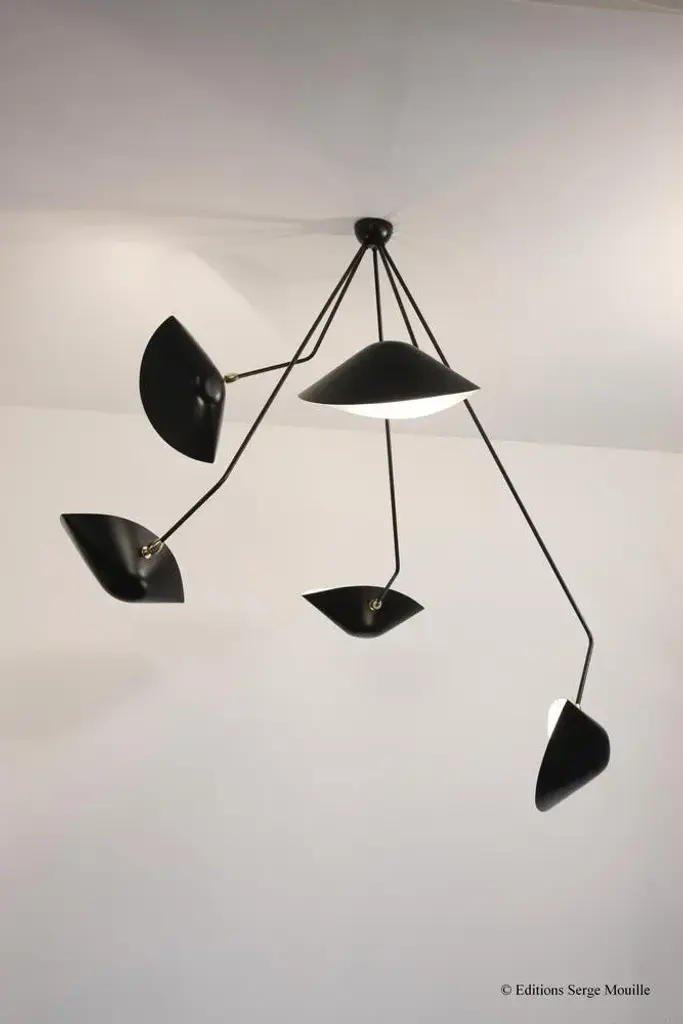 Ceiling lamp spider 5 still arms by serge mouille dimensions: d195 x h70 cm materials: brass, steel, aluminum one of a king. Numbered. Also available in different color. All our lamps can be wired according to each country. If sold to the usa it will be wired for the usa for instance. Designed with 5 steel rods of different lengths, this serge mouille spider ceiling light with 5 fixed arms is a faithful reissue of a 1954 light. Made in france by éditions serge mouille, it has 5 aluminum reflectors with a glossy white interior, adjustable thanks to a brass ball joint. Delivered as soon as possible, it is numbered and accompanied by its certificate of authenticity. Also available in white. up to 250v (europe/uk standard).