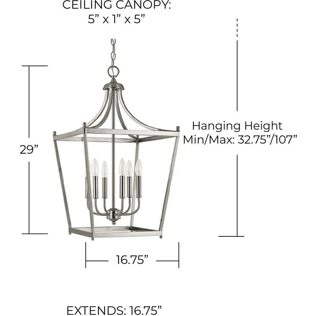 The open, architectural frame of the Stanton 6-light medium light offers an unhindered view of its lamps, perched on gently curved arms that rise up from a center column. Concave curves mark the top while the frame below is a classic trapezoid. Miniature ball finials punctuate the corners. This transitional foyer light in Brushed Nickel finish packs plenty of detail in its clean and simple silhouette.