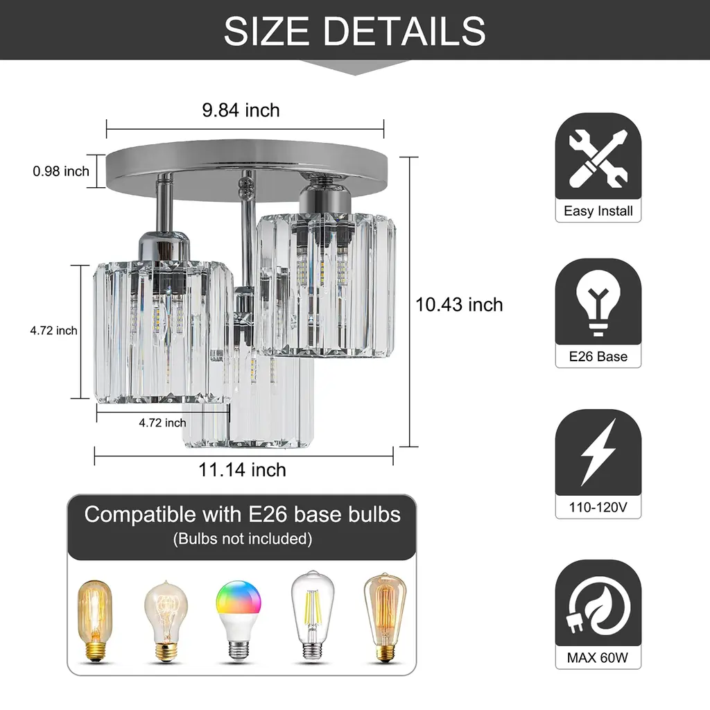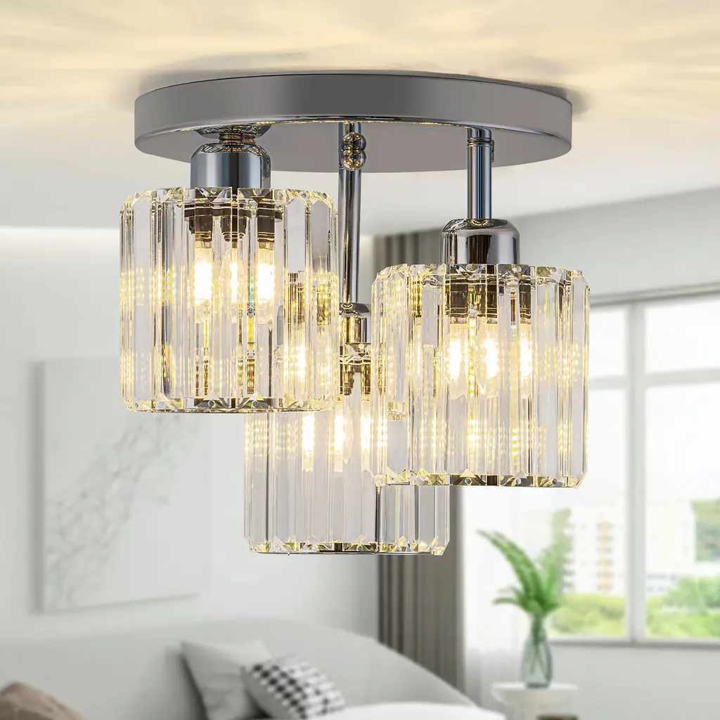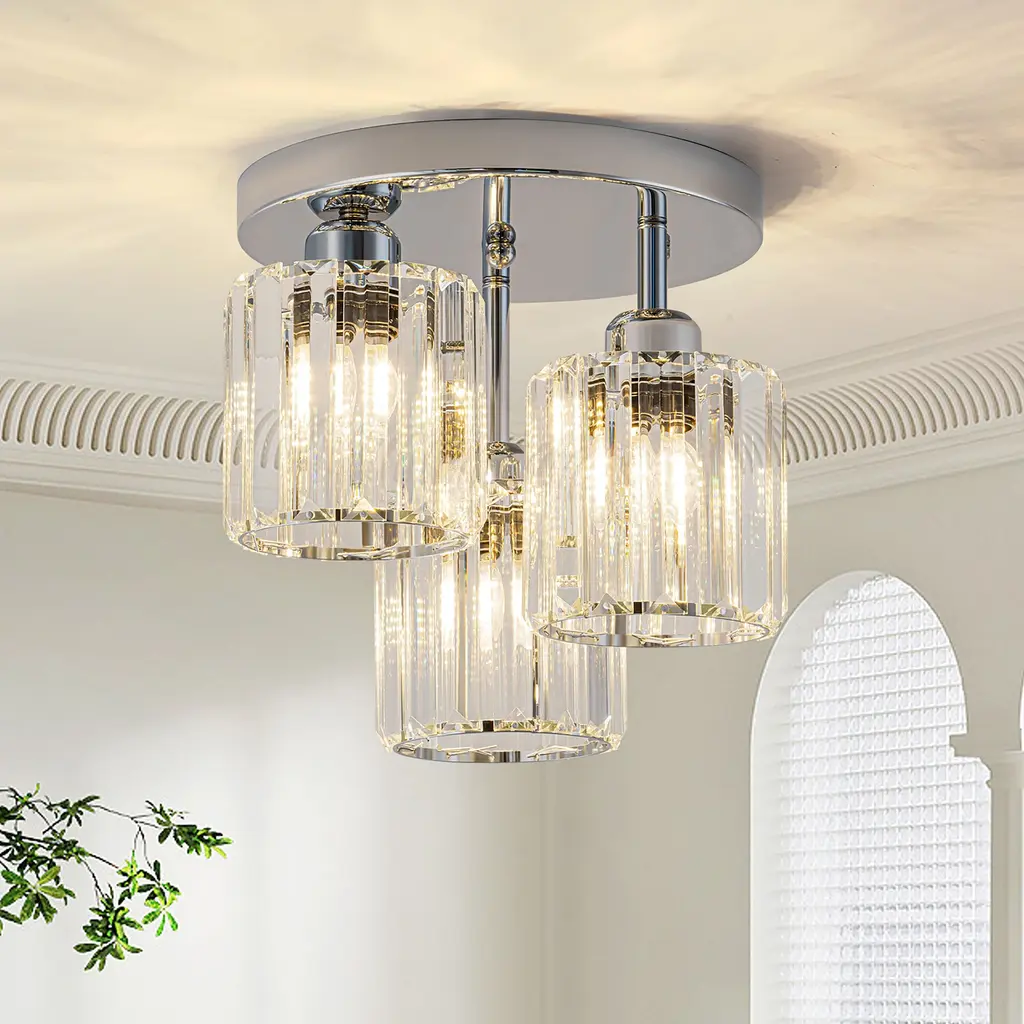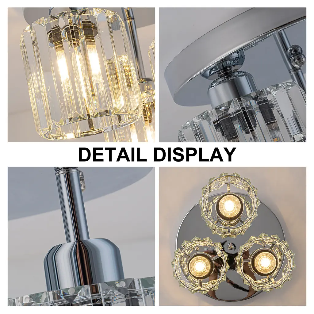 Elevate your space with this stunning modern crystal ceiling light, designed to combine elegance and functionality. Featuring a black and chrome finish, this fixture boasts a unique open design complemented by premium crystal lampshades, ensuring a dazzling light effect. Perfect for various spaces, this ceiling light is compatible with 3*E26 base bulbs (not included), providing versatile lighting options for any room in your home. Make your home shine with this elegant and modern ceiling light, blending crystal brilliance with bold design elements.Key Features: