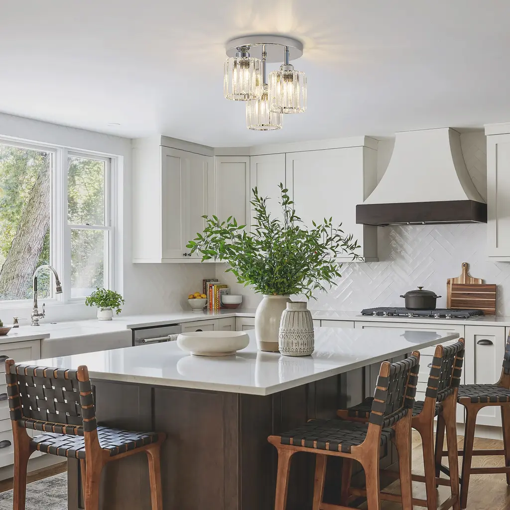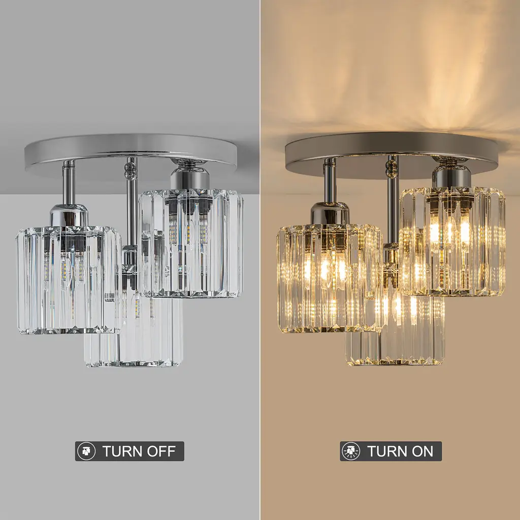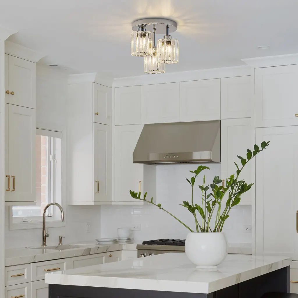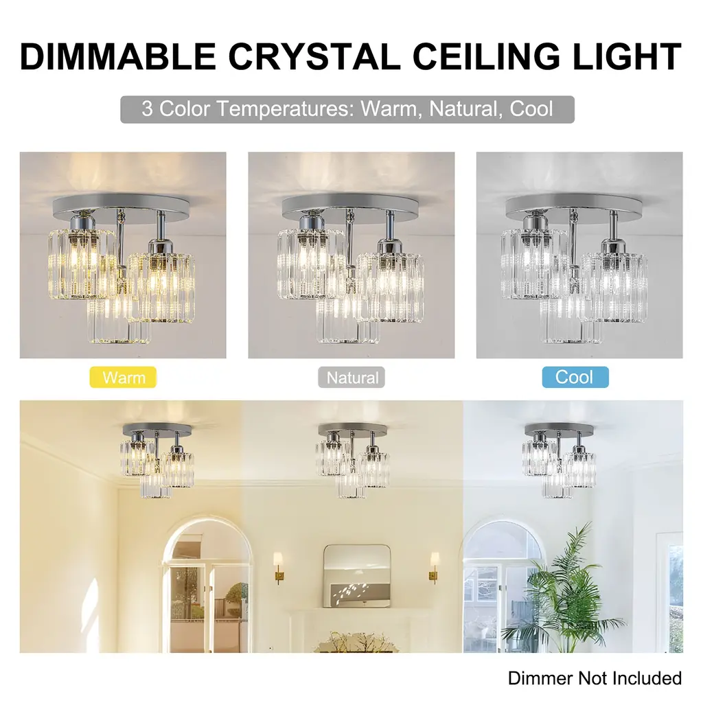 Elevate your space with this stunning modern crystal ceiling light, designed to combine elegance and functionality. Featuring a black and chrome finish, this fixture boasts a unique open design complemented by premium crystal lampshades, ensuring a dazzling light effect. Perfect for various spaces, this ceiling light is compatible with 3*E26 base bulbs (not included), providing versatile lighting options for any room in your home. Make your home shine with this elegant and modern ceiling light, blending crystal brilliance with bold design elements.Key Features: